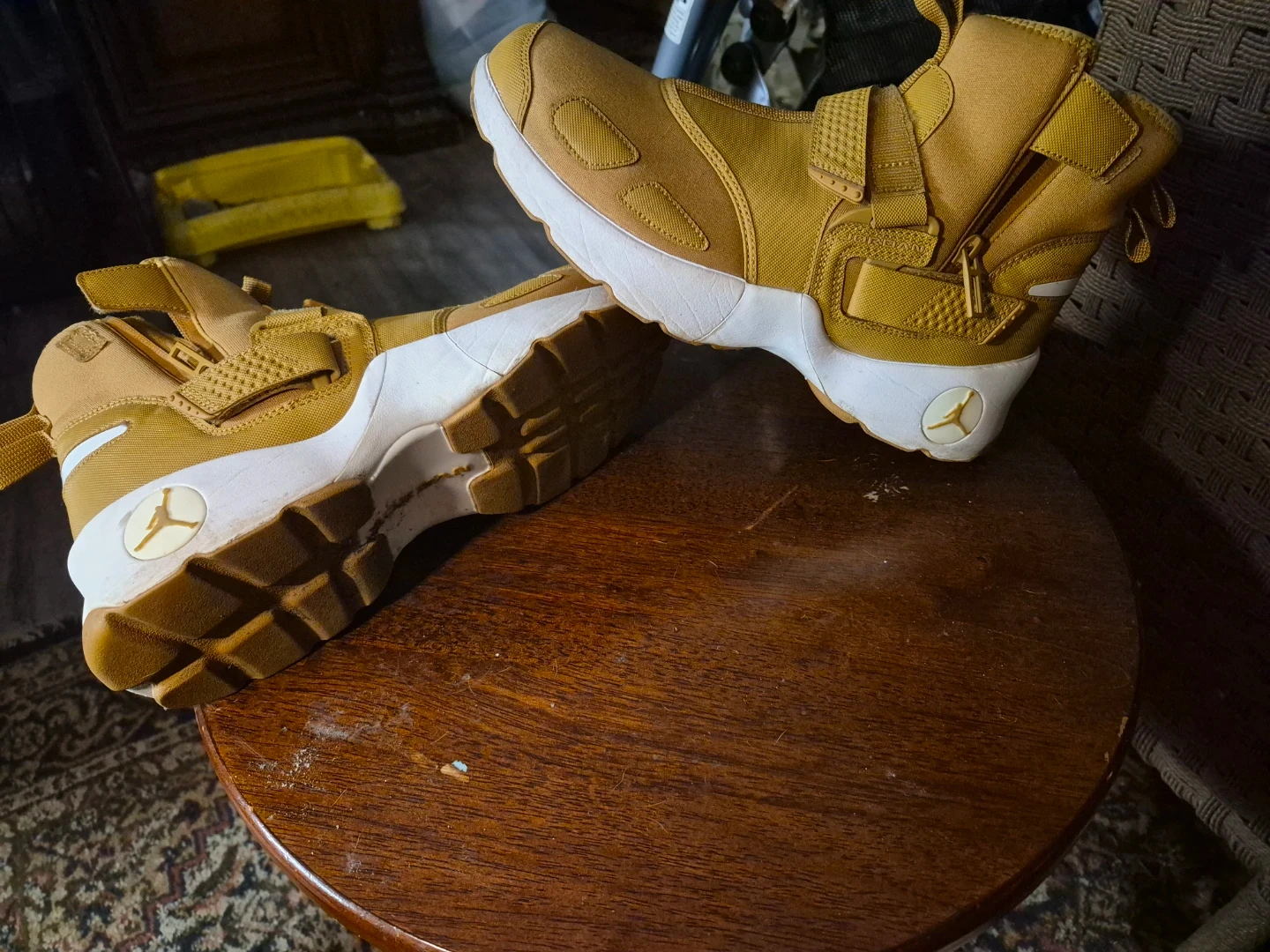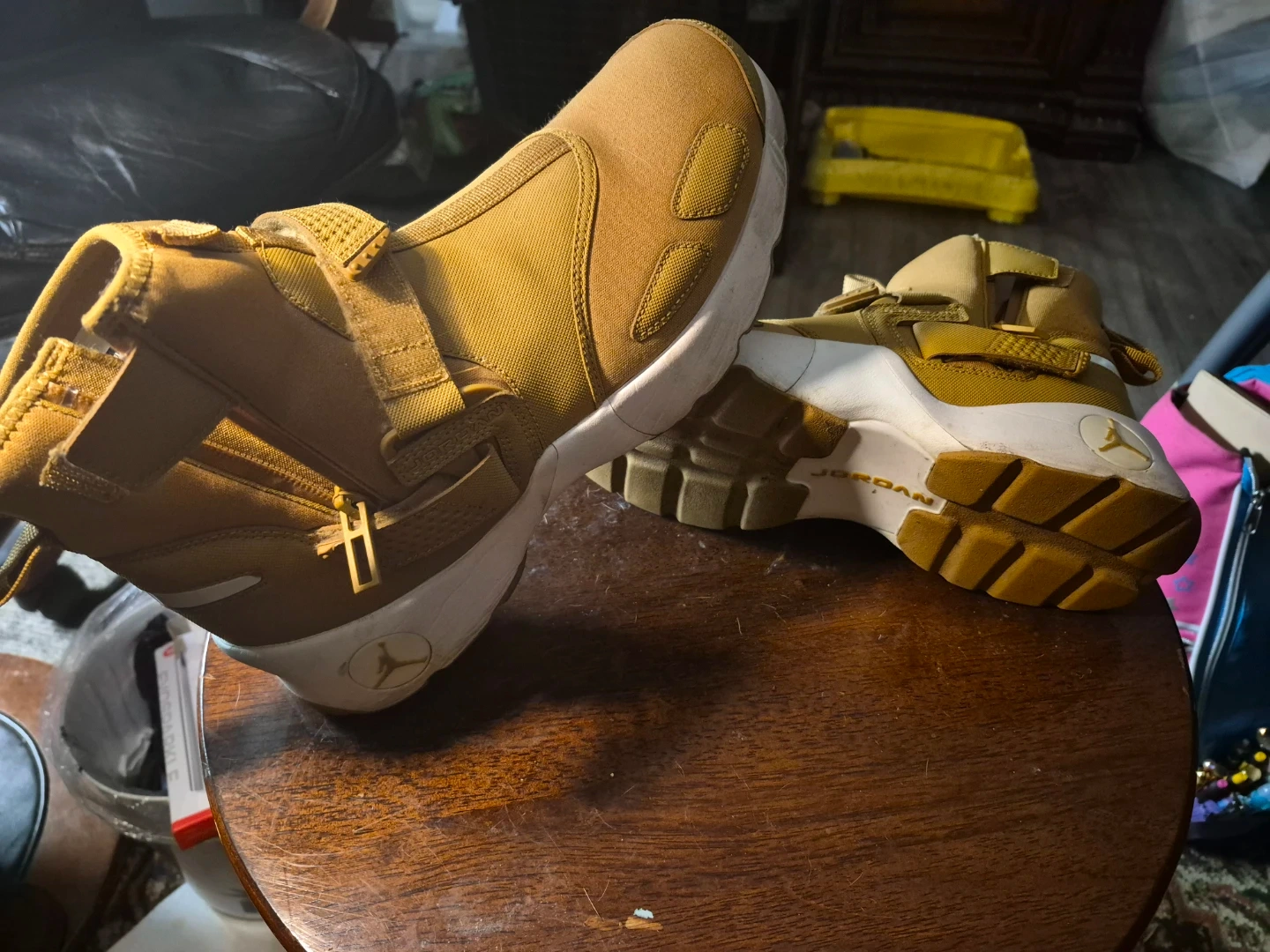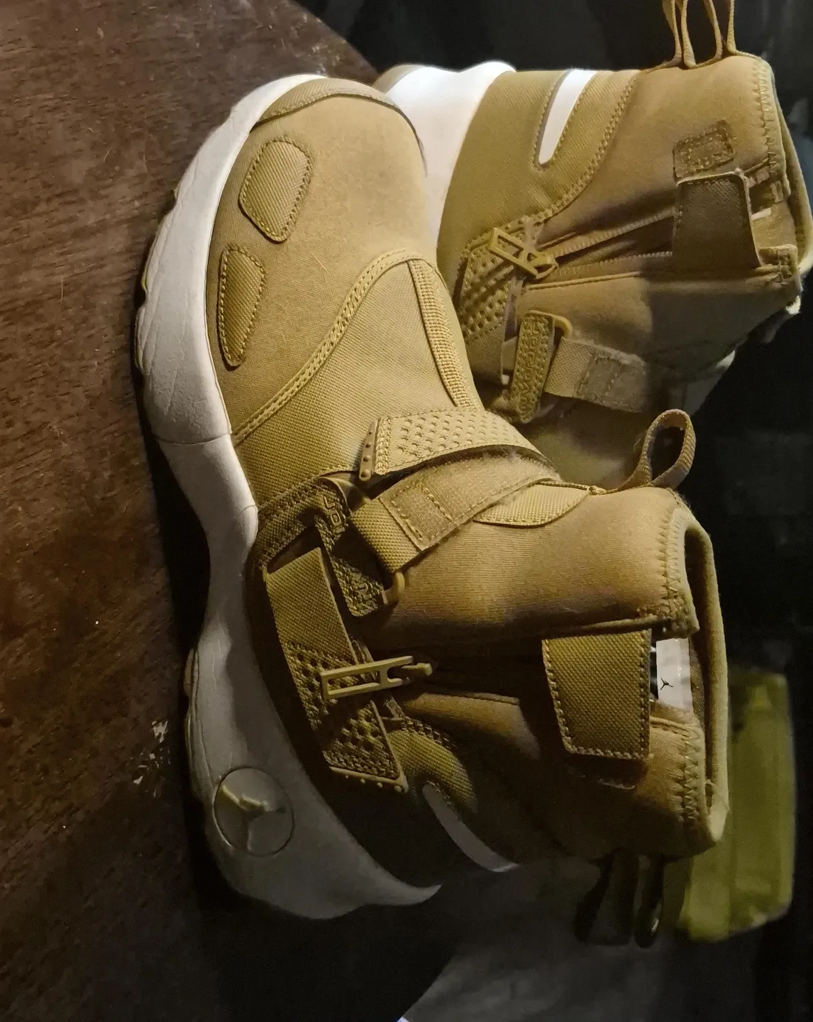 Selling a pair of Jordan men's Flight Utility shoes. The shoes are a tan/gold color with a white sole. They feature a strap and zipper closure.