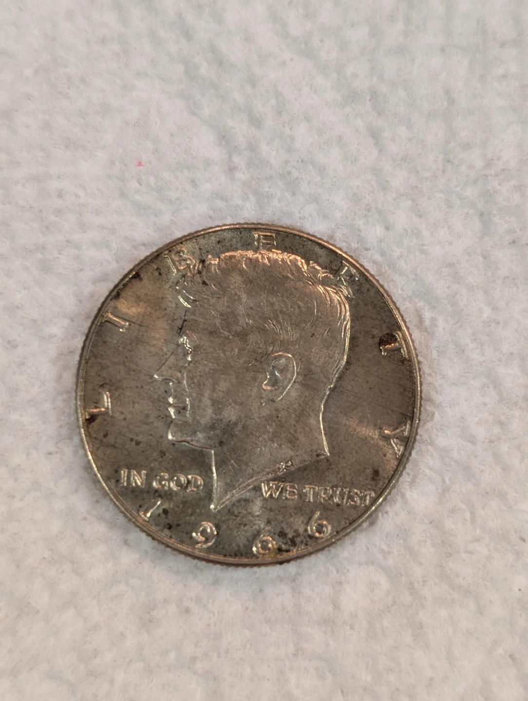 Selling a 1966 Kennedy Silver Half Dollar. It shows the United States of America's Half Dollar emblem on one side and the profile of Kennedy on the other, fineness: 0.4000, 40% silver, weight - 11.5 grams ASW: 0.1479 ounces. This coin is in excellent condition like the uncirculated is great for collectors.