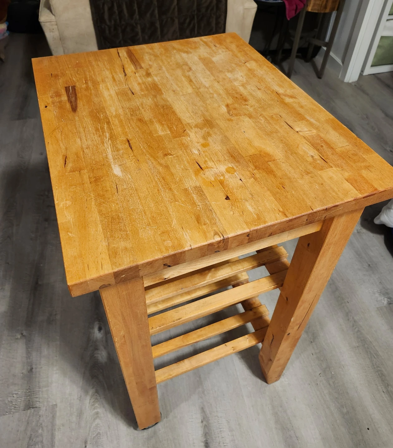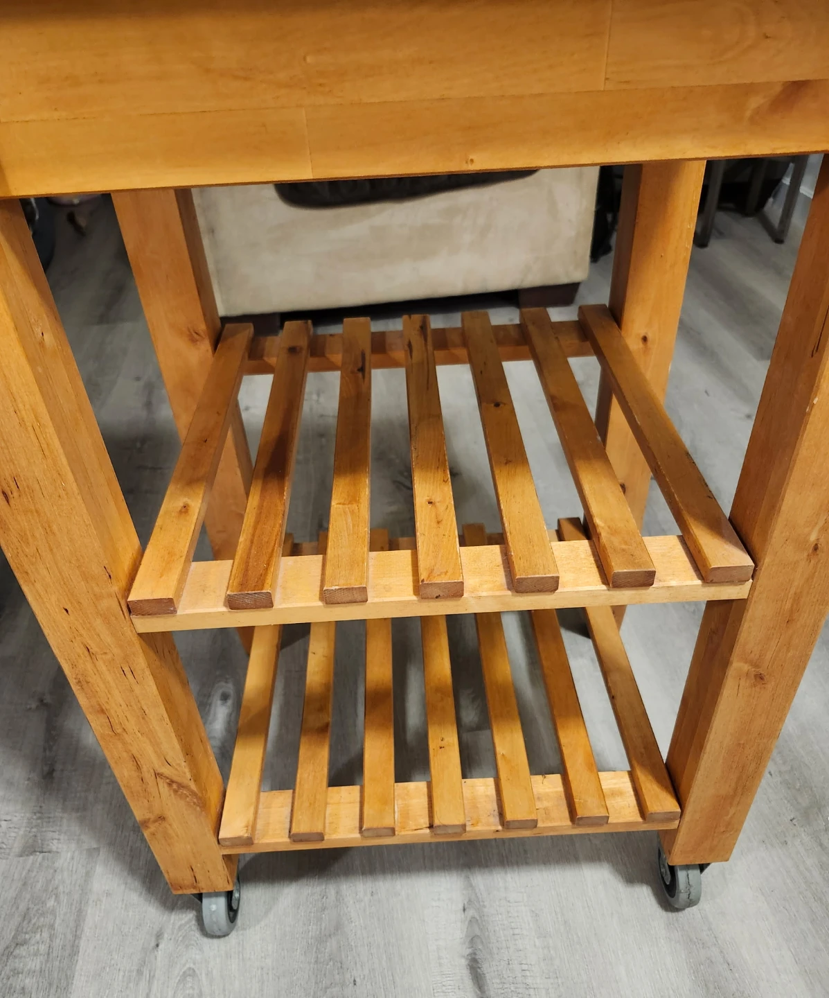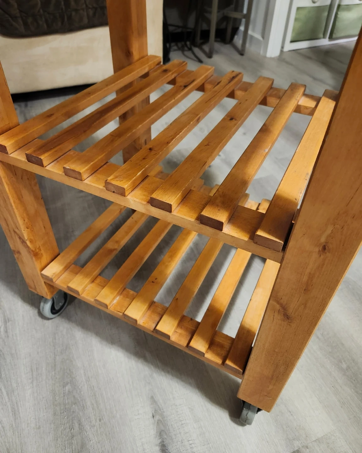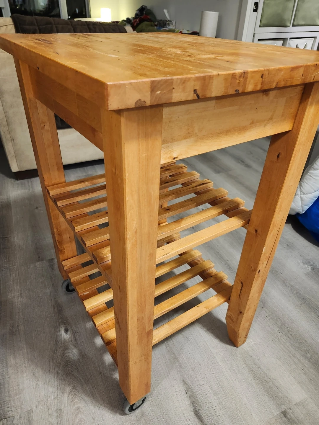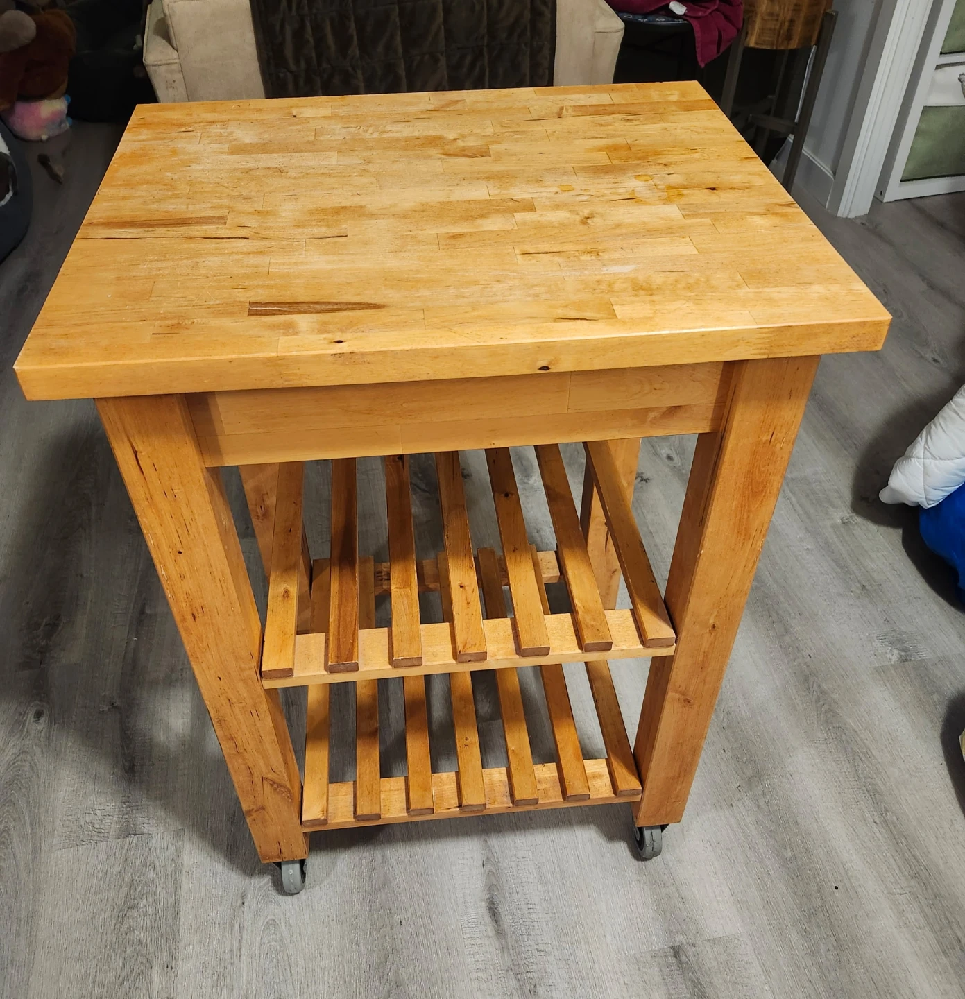 Selling a wooden kitchen island cart. It has a natural wood finish and features a butcher block top. There are two slatted shelves underneath for storage, and it's on wheels for easy movement. It would be a great addition to any kitchen!