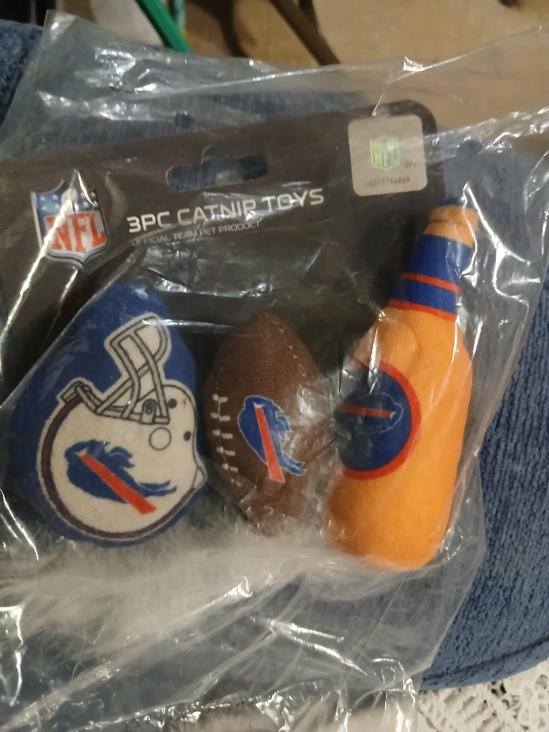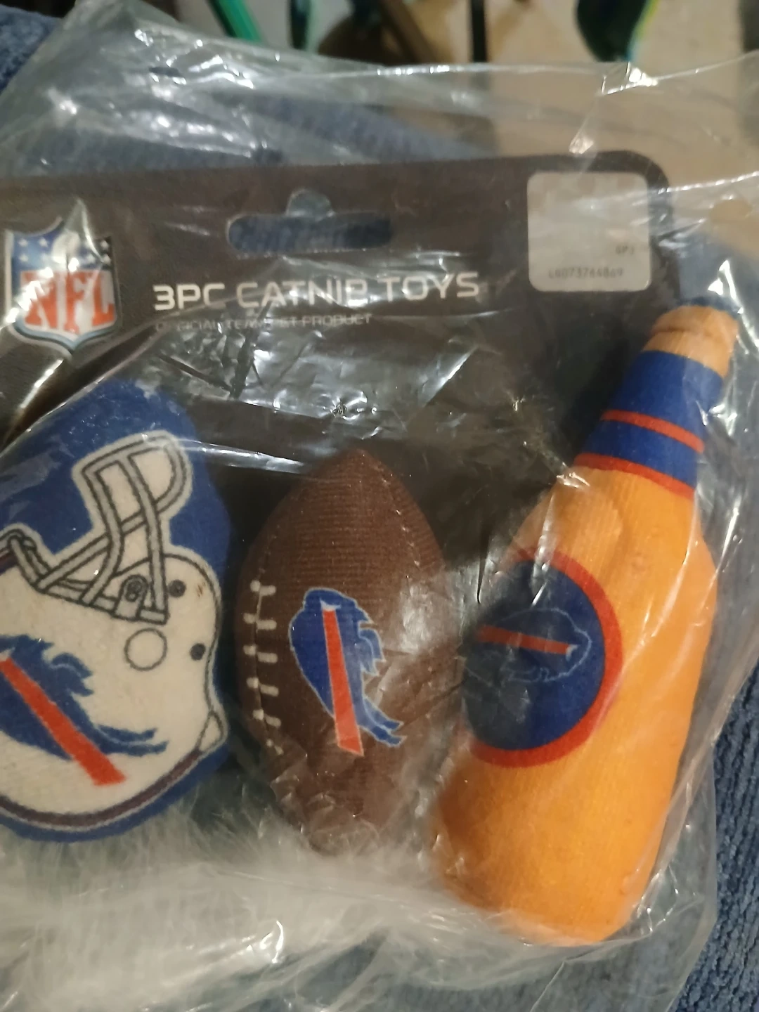 Here's a set of 3 brand new catnip toys featuring the Buffalo Bills logo! The set includes a helmet, a football, and a beer bottle shaped toy. Perfect for any Bills fan's furry friend