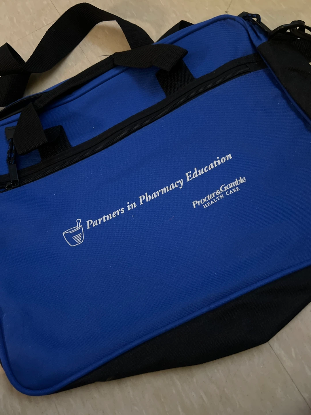 Here's a blue tote bag from Procter & Gamble. It's in great condition and perfect for carrying your essentials. The bag features the 'Partners in Pharmacy Education' logo. It's a sturdy and reliable bag for everyday use