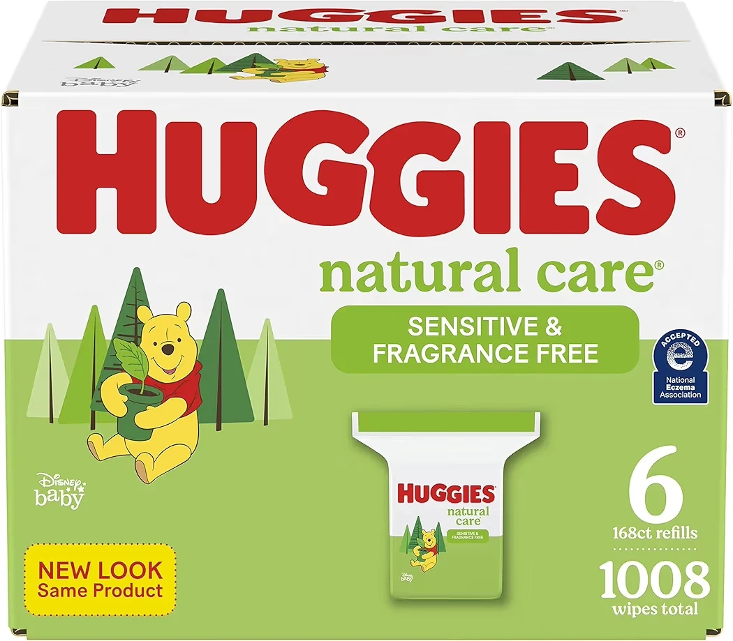 Selling a box of Huggies Natural Care baby wipes. This box contains 1008 wipes in total, divided into 6 refills of 168 wipes each. They are sensitive and fragrance-free, perfect for baby's delicate skin! The box has a new look, but it's the same great product you know and trust