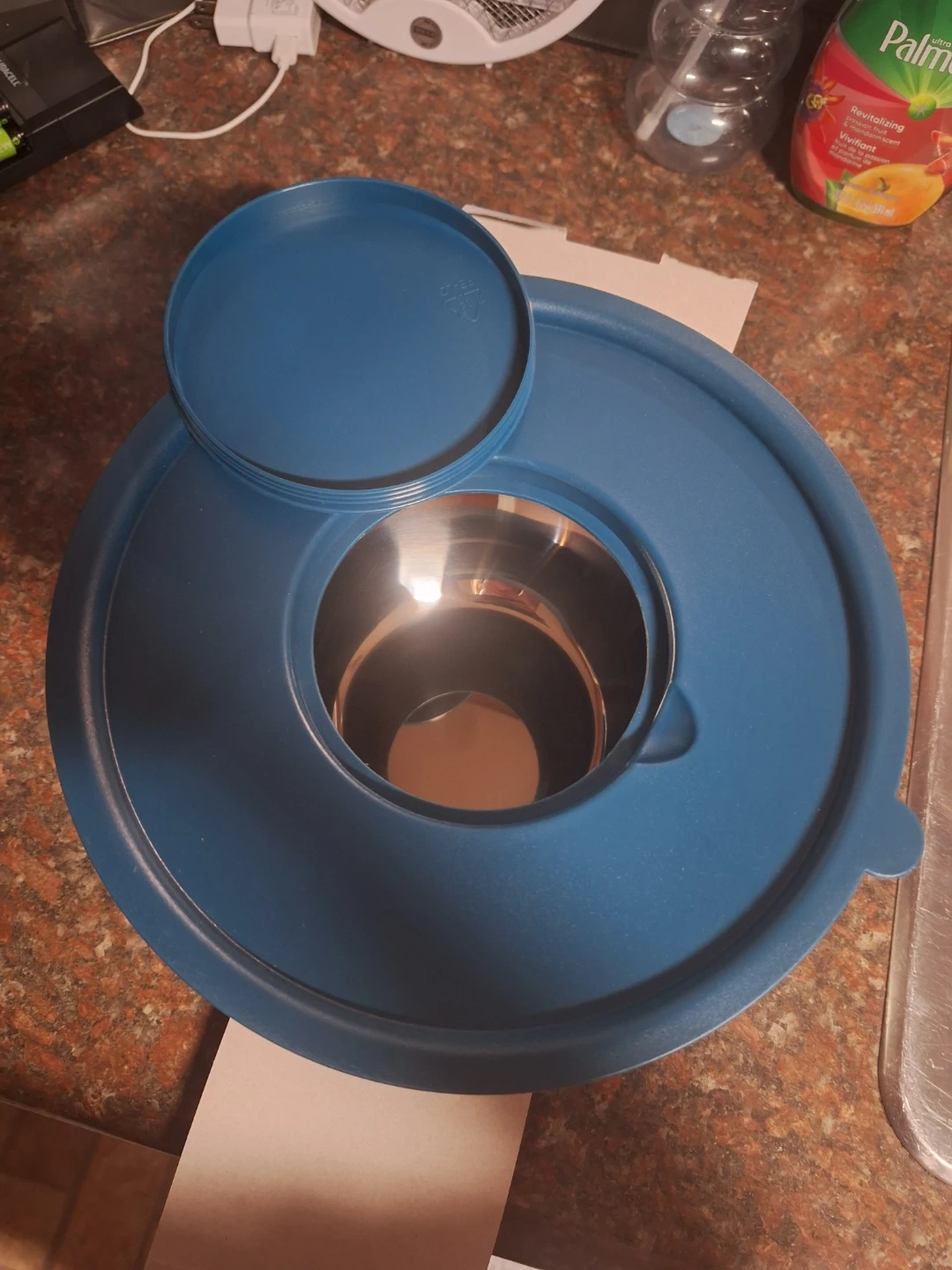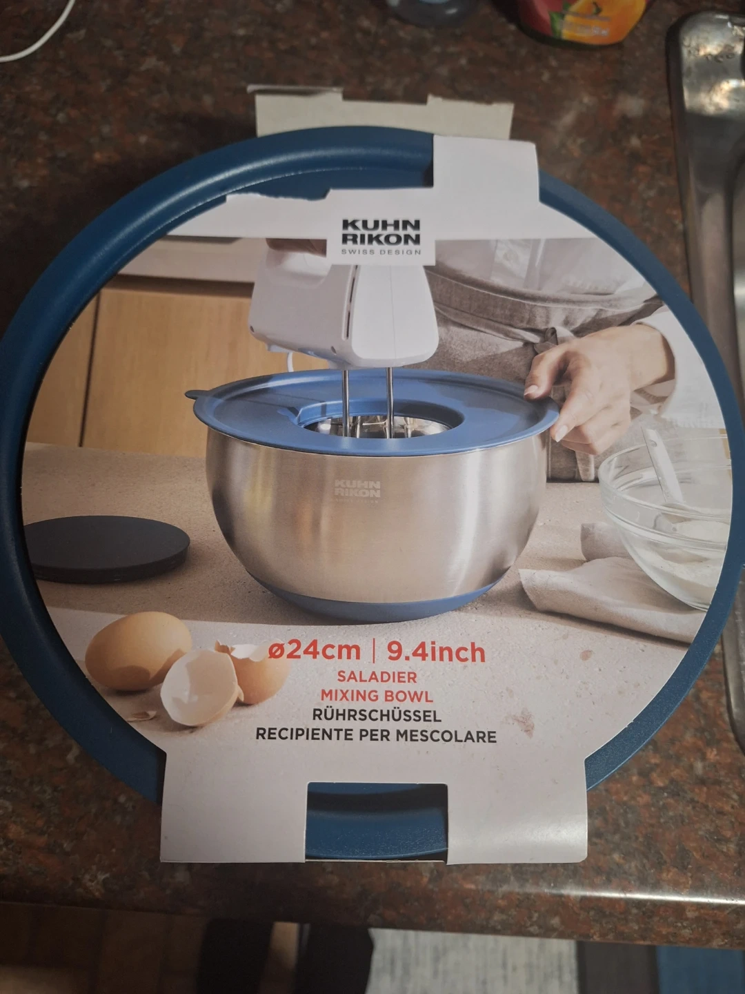 I'm selling a Kuhn Rikon mixing bowl! It's brand new and ready for a new kitchen. It's a 9.4 inch mixing bowl that is easy to clean and stainless steel. It comes with a blue lid to easily prepare, serve, and store your food. The lid has two parts, so you can use the beaters without being worried about splashing the counters or walls!