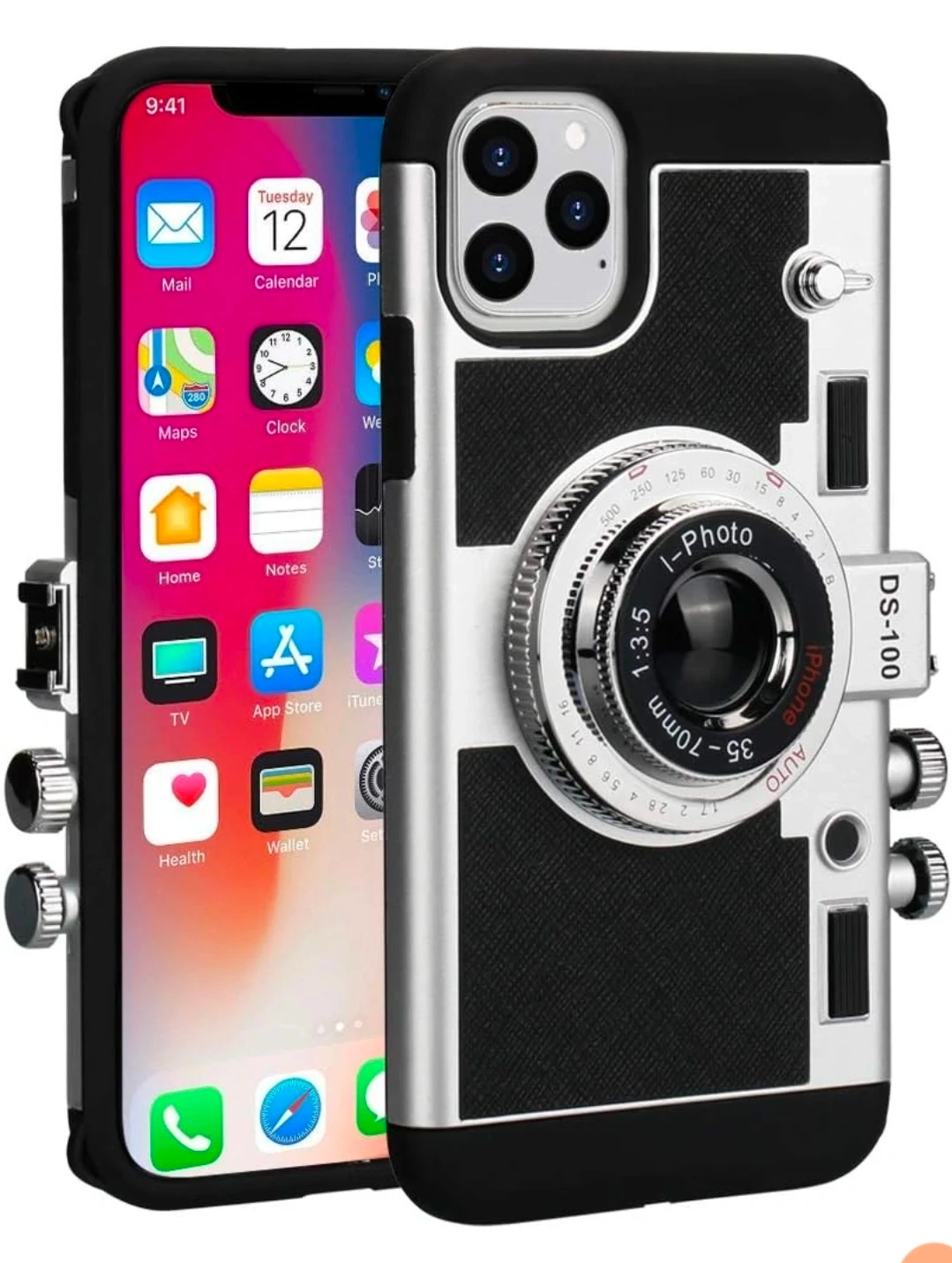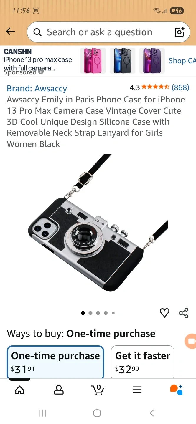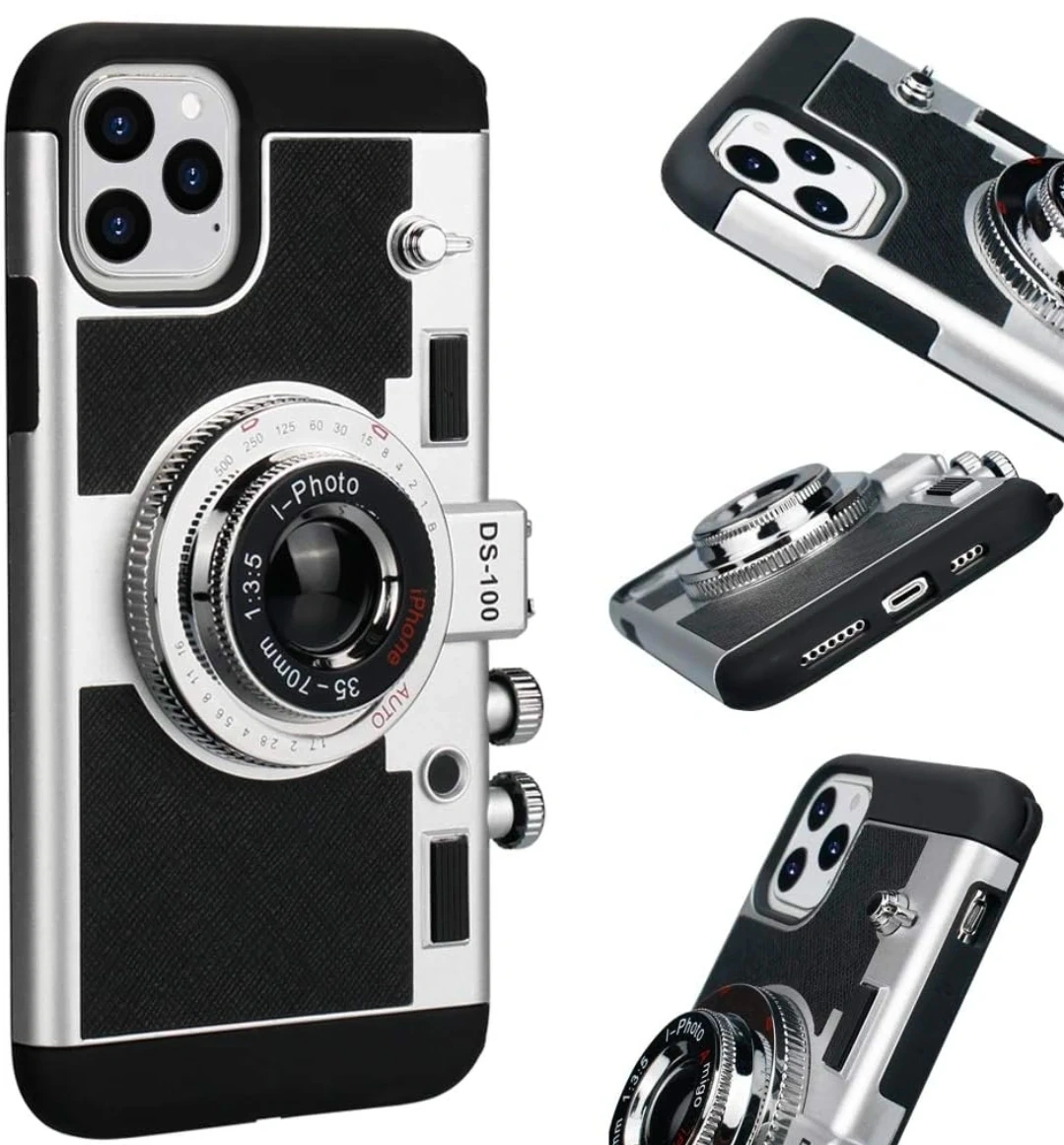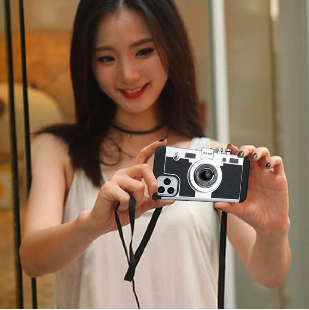 This is an Awsaccy Emily in Paris phone case for iPhone. It has a vintage camera design and is made of silicone. It's a cute and unique 3D design with a removable neck strap lanyard for girls and women.