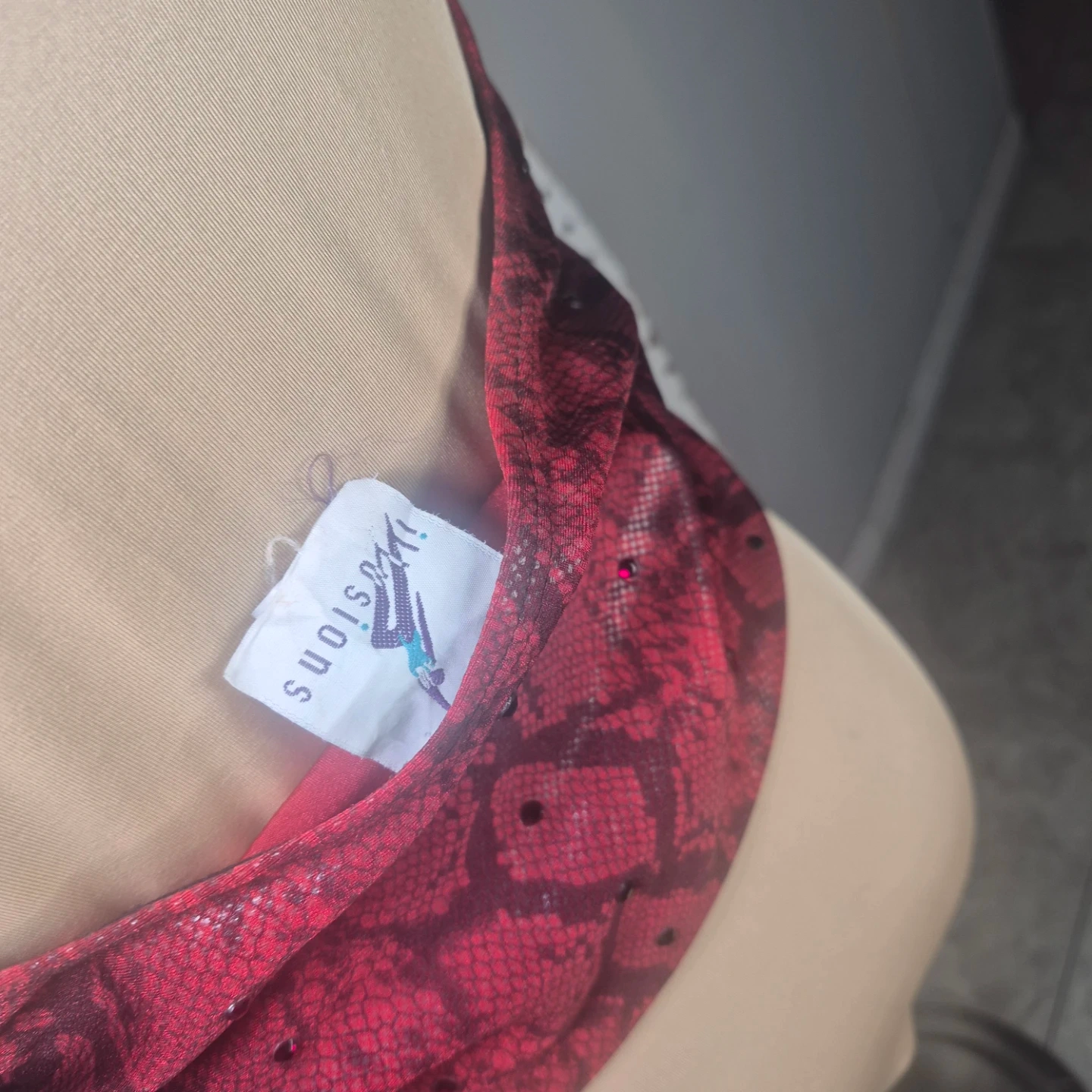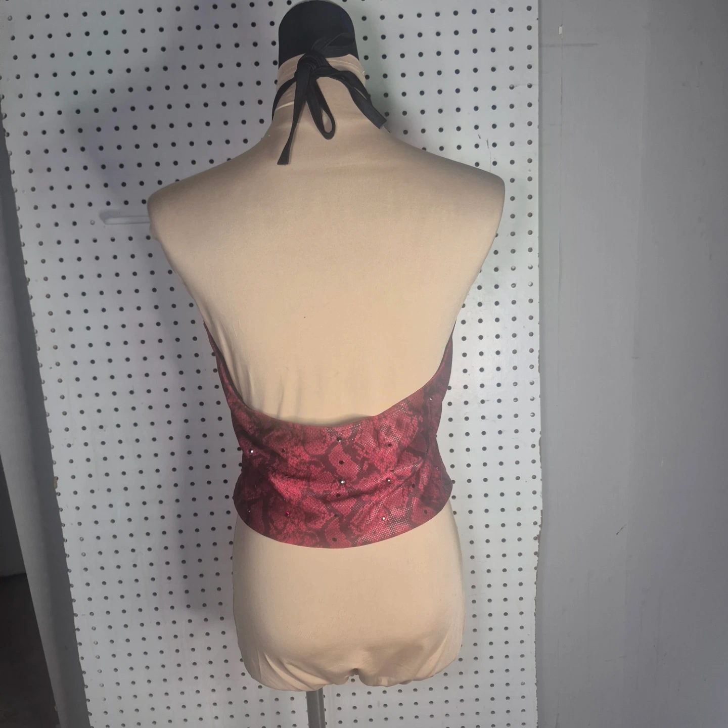 This is a red snakeskin halter top from Illusions. It has a unique design and is in great condition. Perfect for adding a touch of style to your wardrobe!
