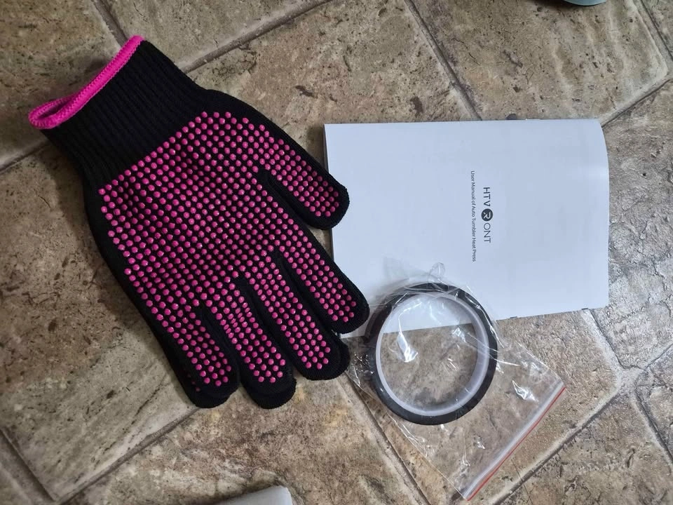 Includes heat press, heat-resistant gloves, tape, and manual.