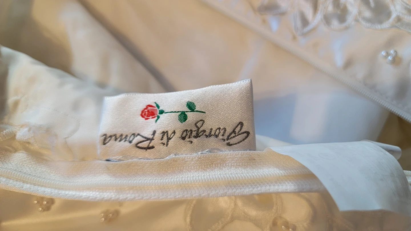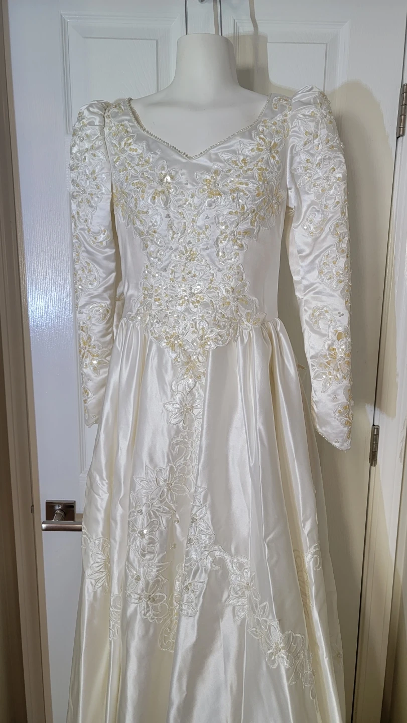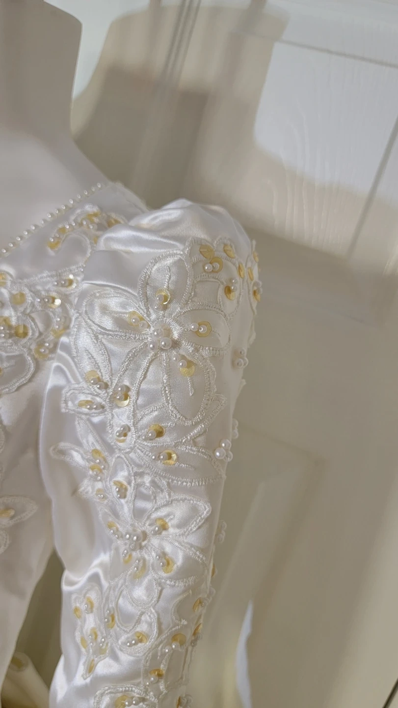 Pearls edged neckline, sleeve cuffs and bottom of dress and train.