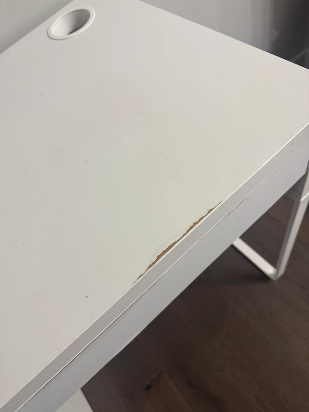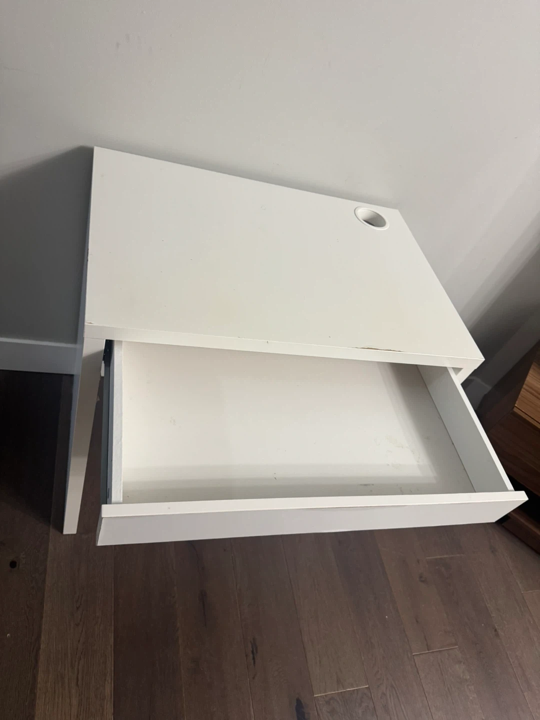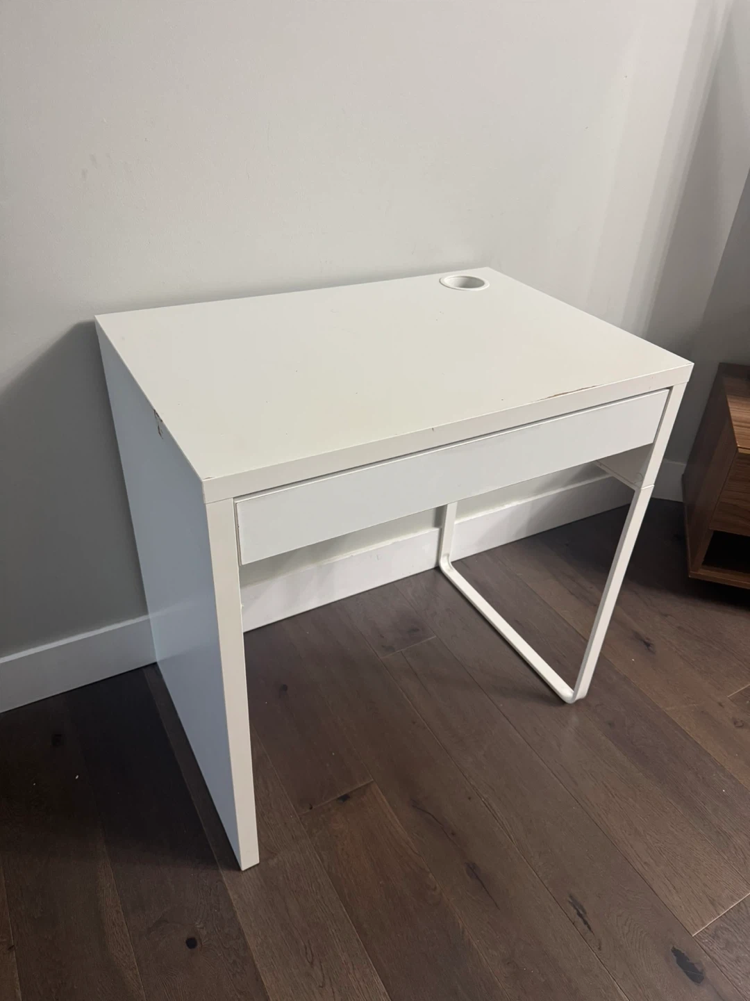 Selling a white desk that's perfect for a small space. It has a handy drawer for storage and a hole for cords. There is a scratch on the top surface.