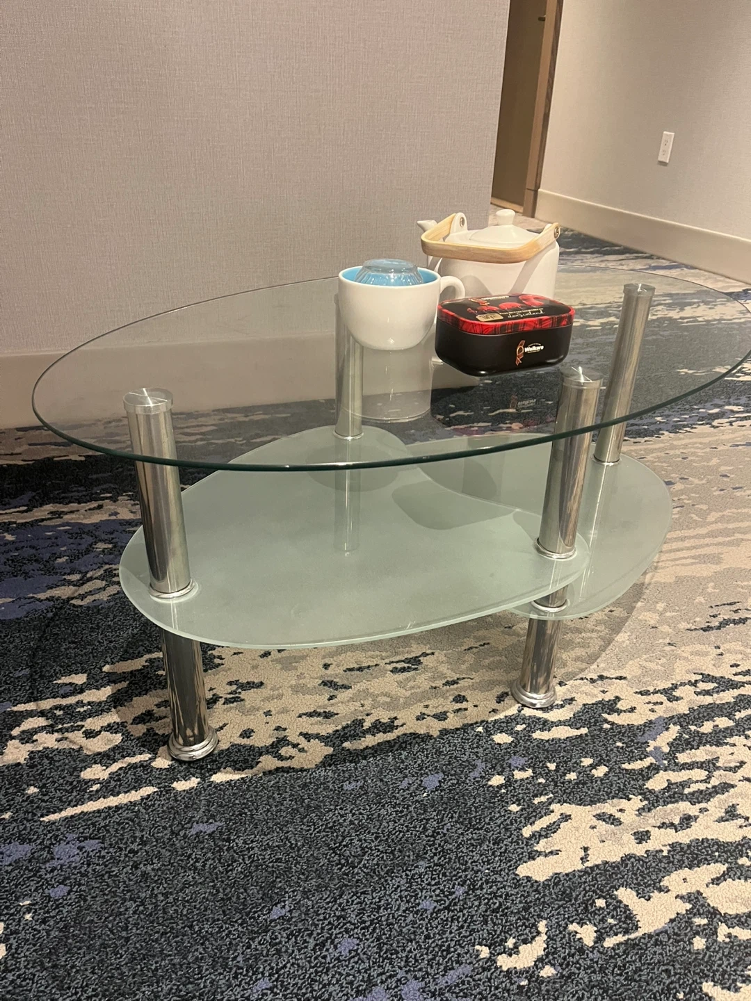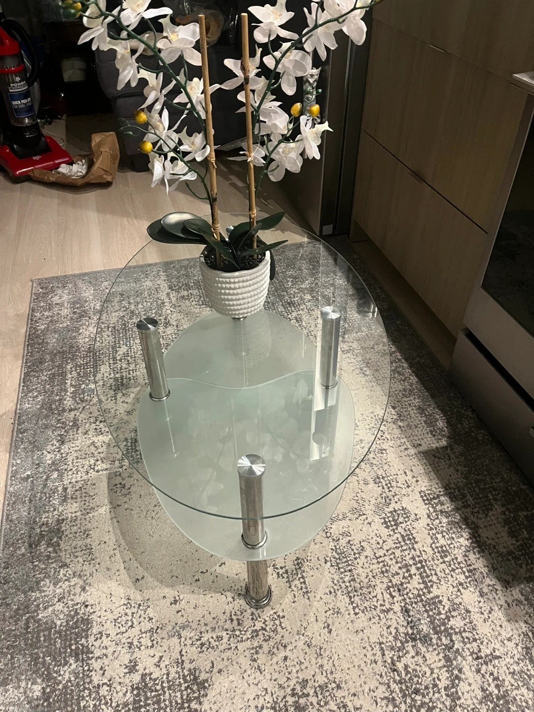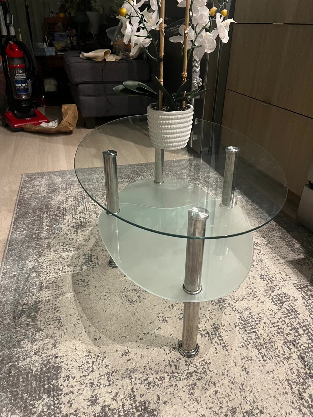 Selling a glass coffee table with silver legs. It has two levels of glass, perfect for displaying items or keeping things organized. It's in good condition and would be a great addition to any living room