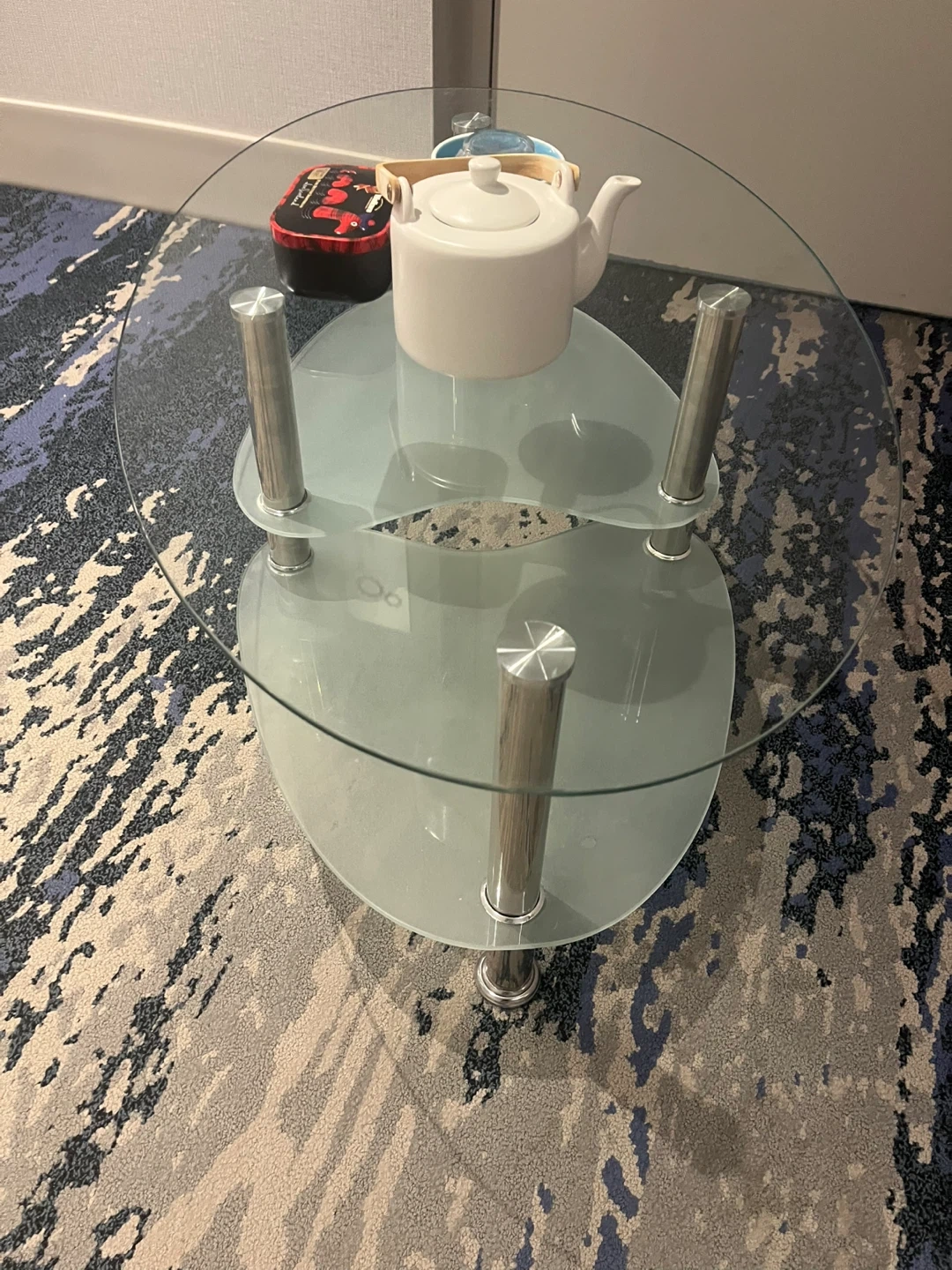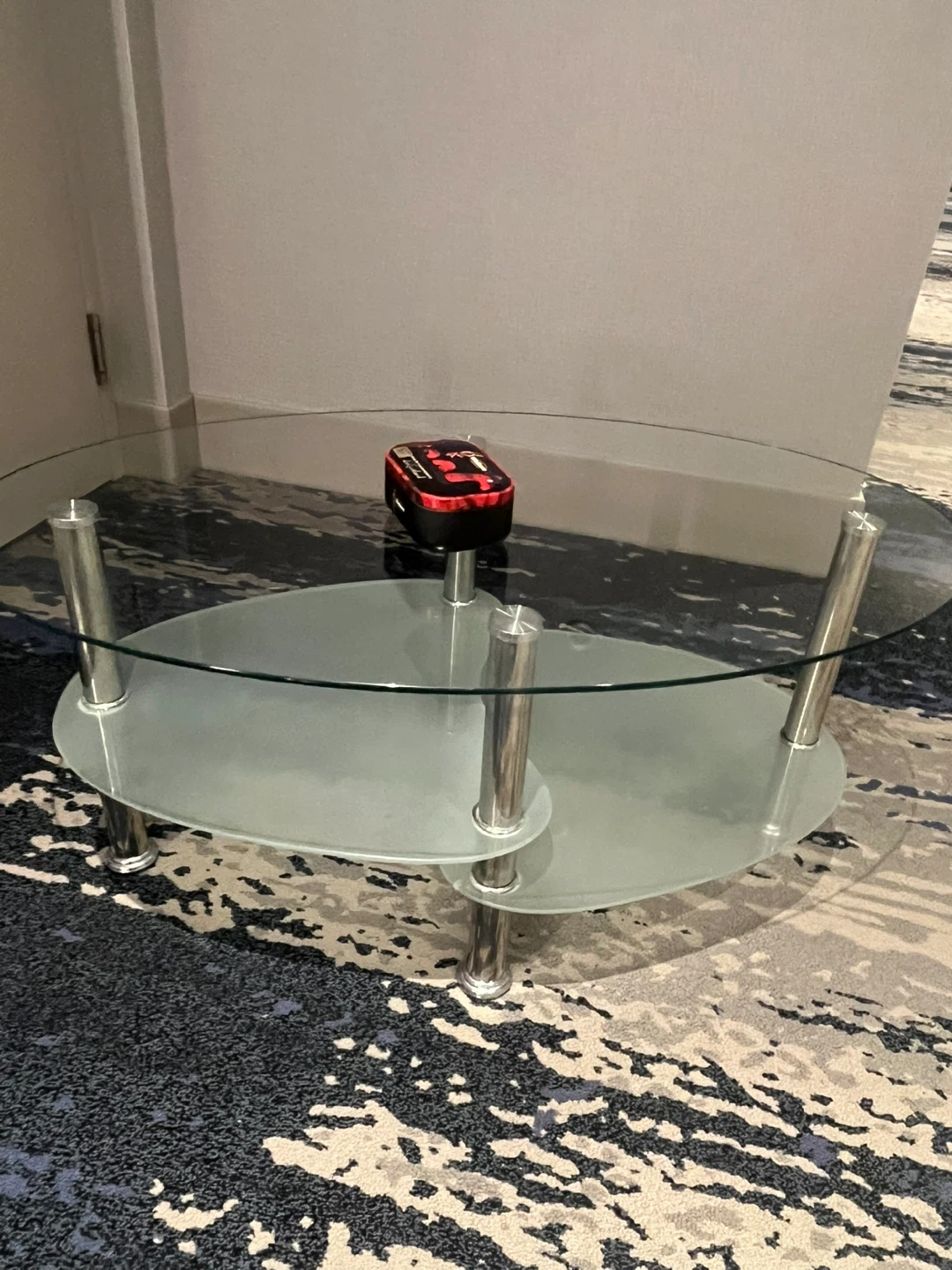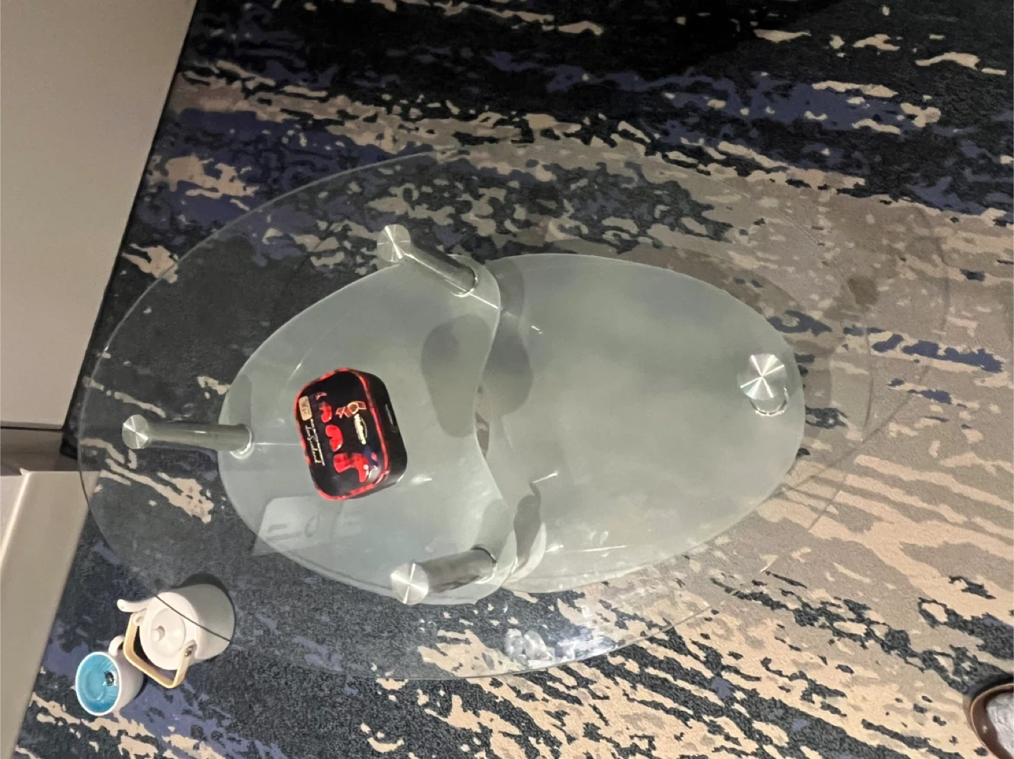 Selling a glass coffee table with silver legs. It has two levels of glass, perfect for displaying items or keeping things organized. It's in good condition and would be a great addition to any living room