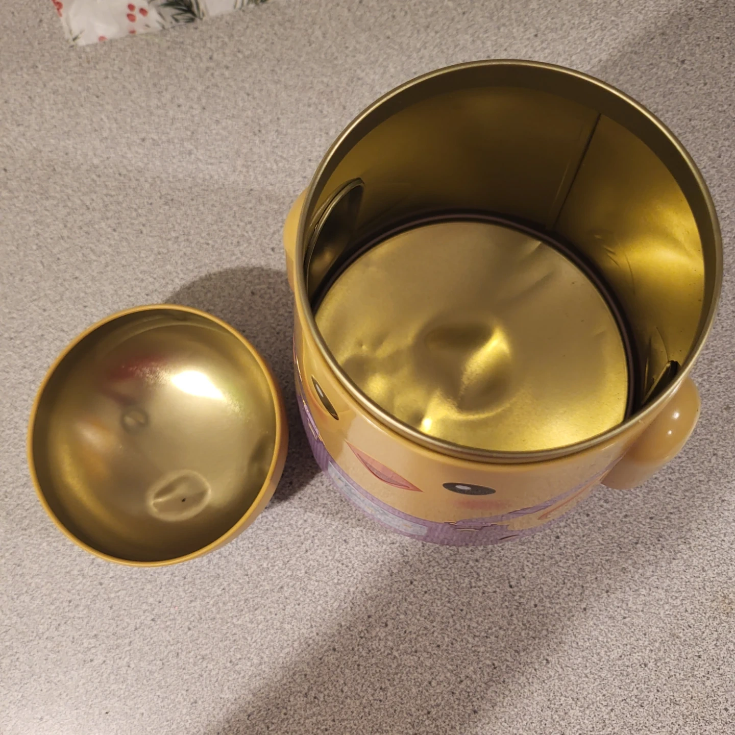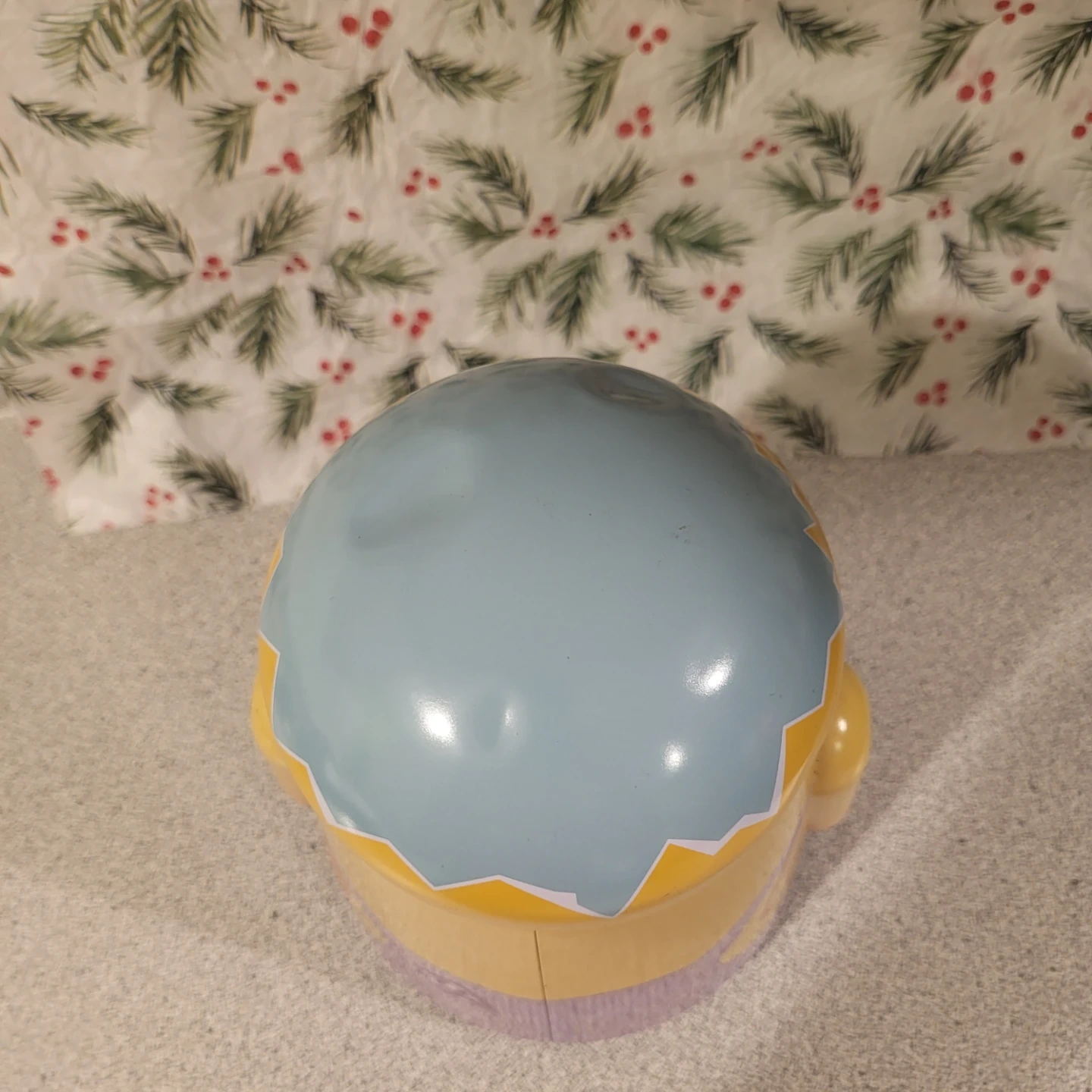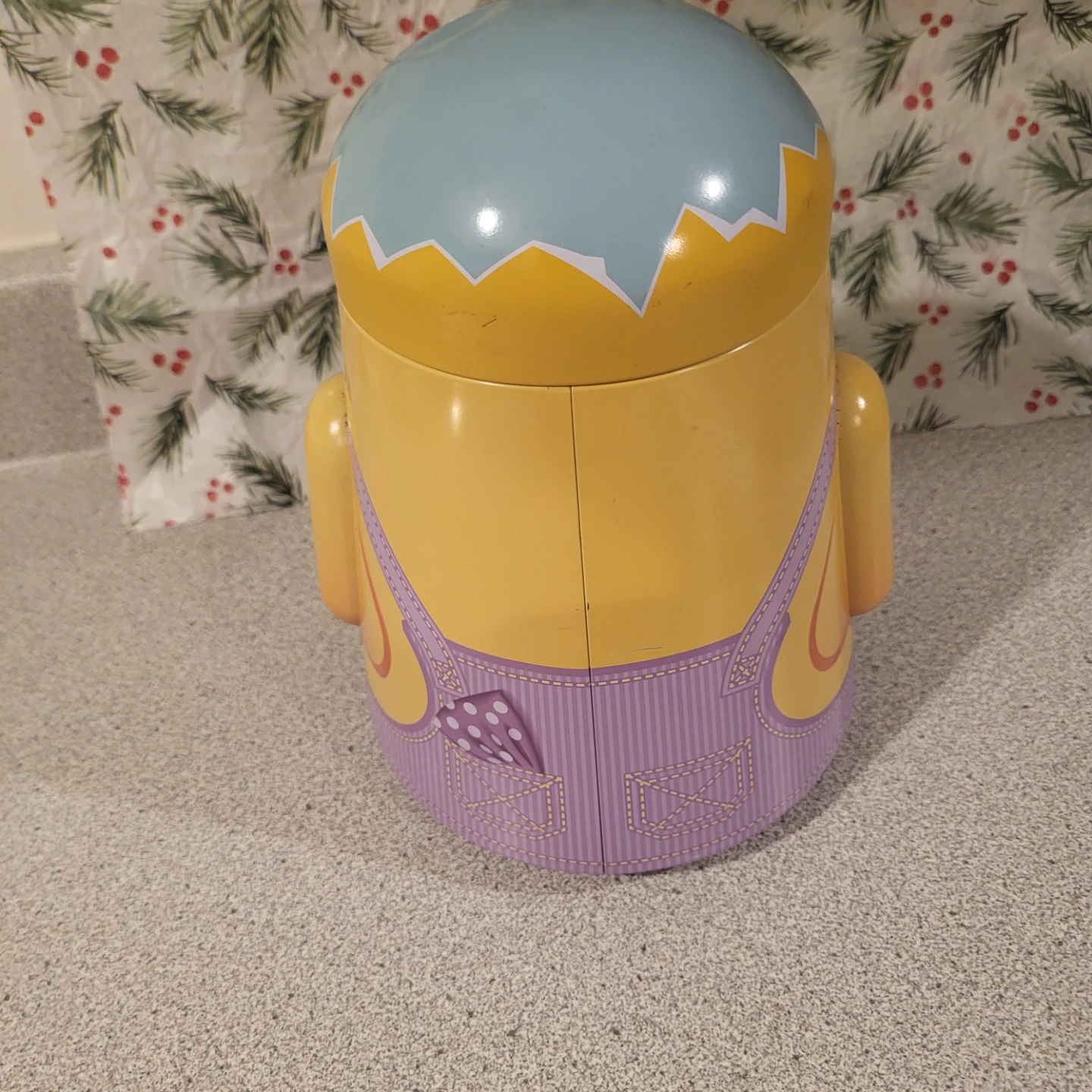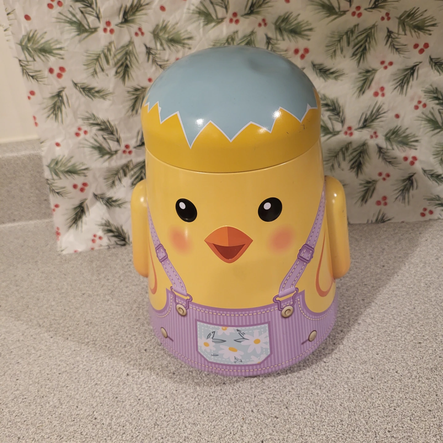 This is a cute metal tin container shaped like a chick! It's perfect for storing small items or as a decorative piece. The chick design features overalls and little feet on the bottom. It's in good condition and ready for a new home
