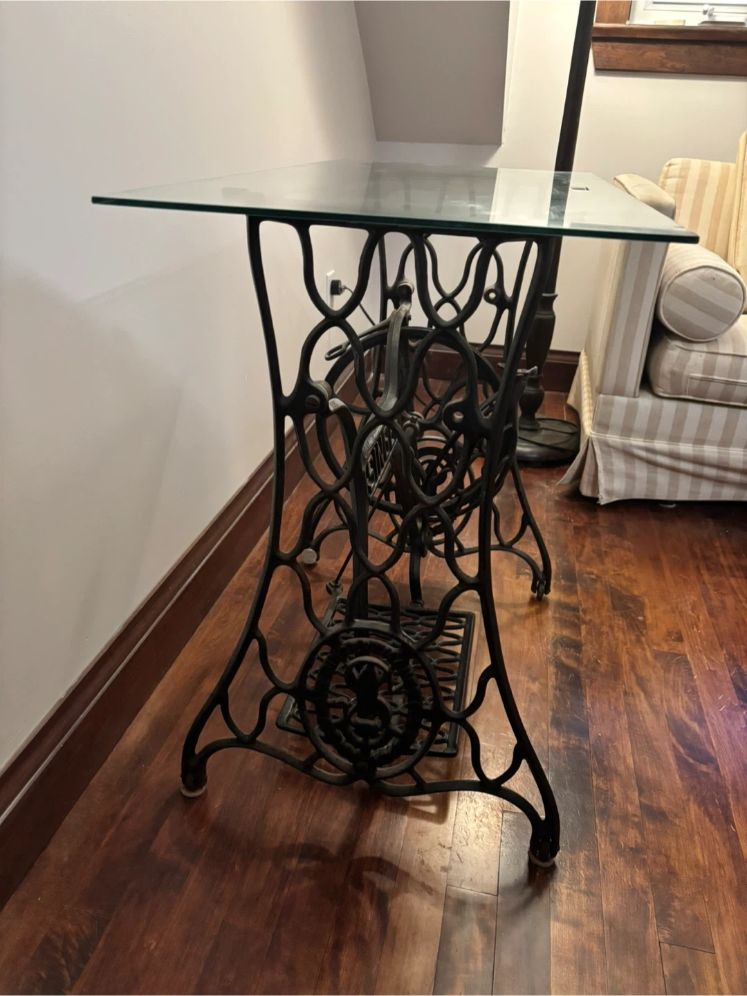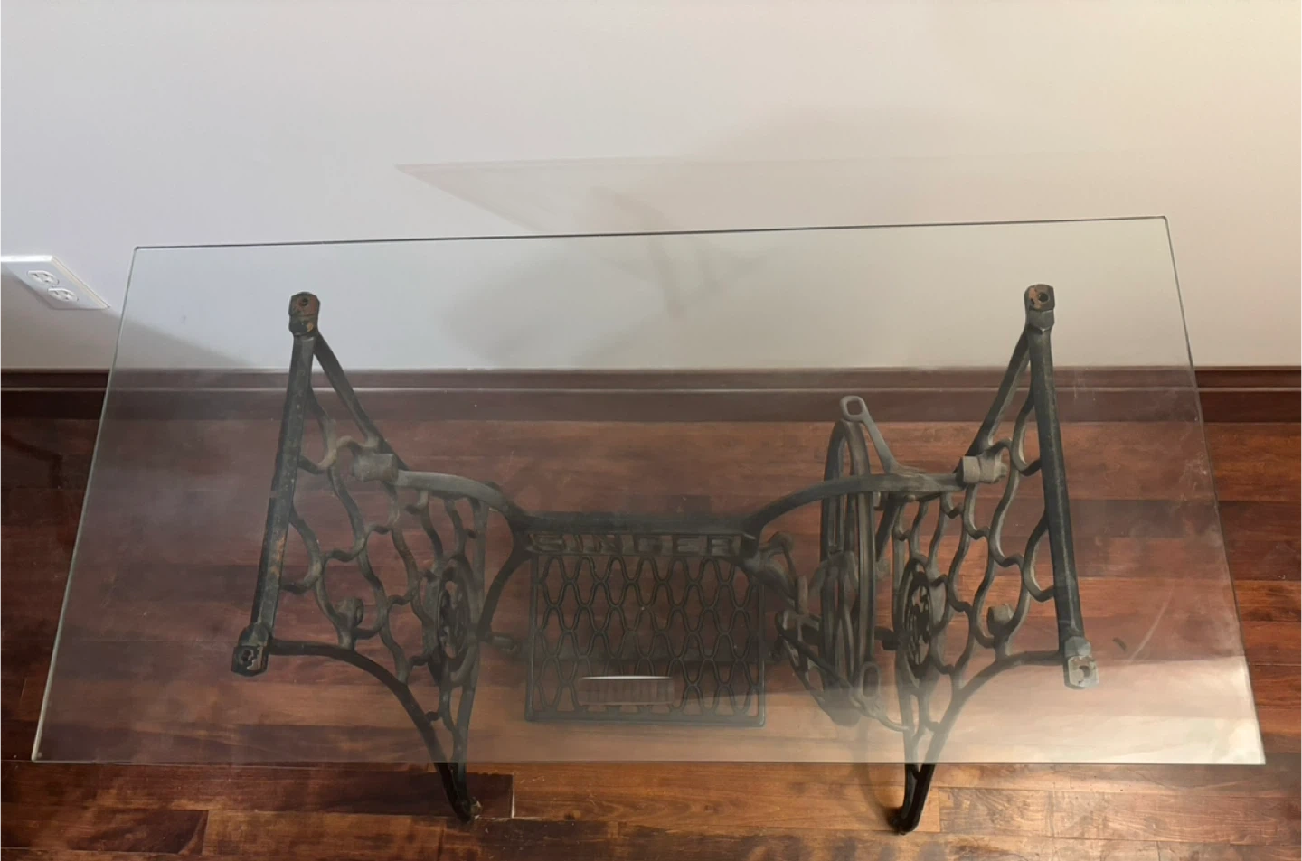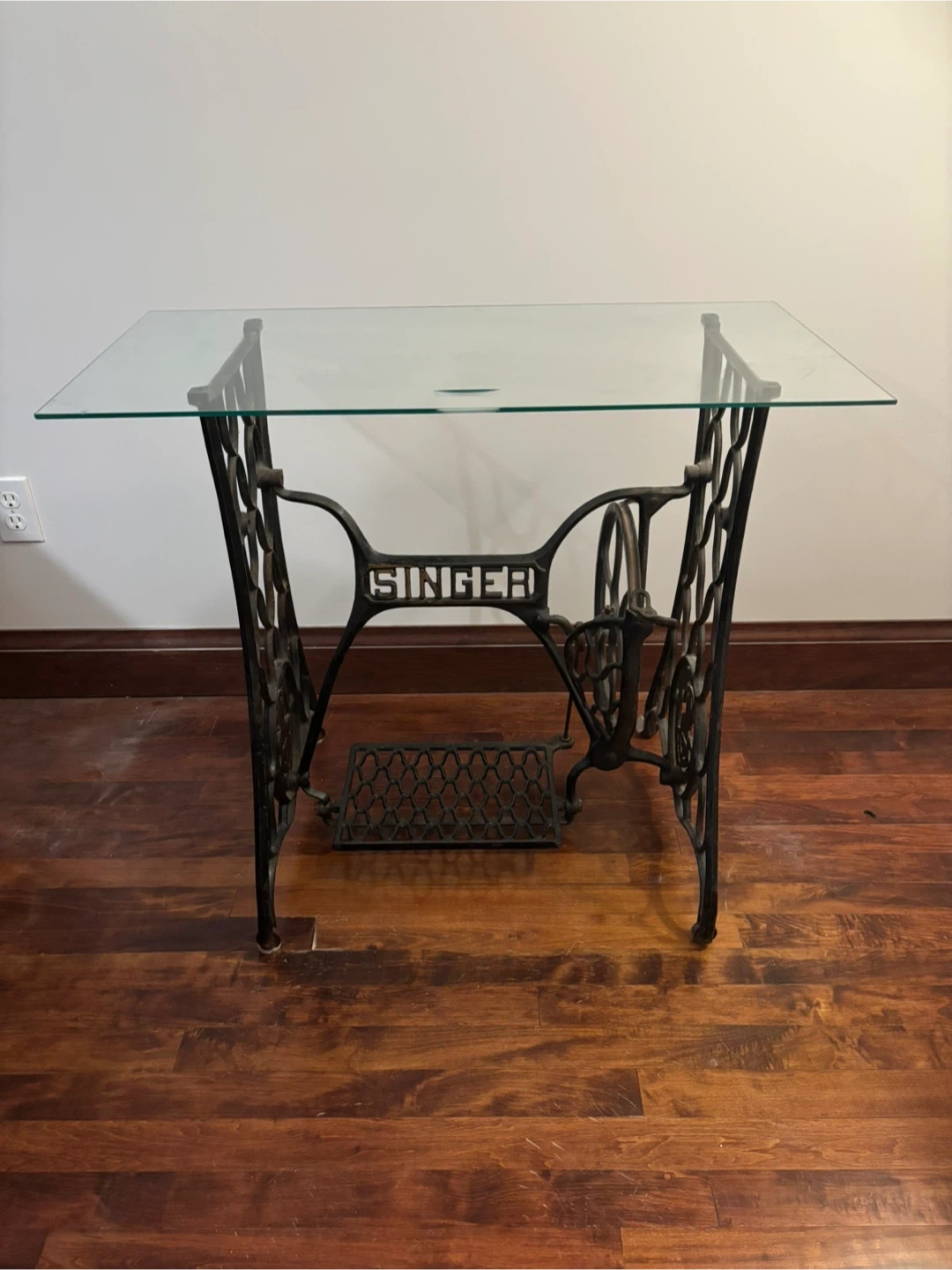 The original sewing mechanism has been removed and replaced with a thick, clear glass top, making this piece fully functional while preserving its historic charm. Perfect as a writing desk, entryway table, sofa table, or statement piece in a home, studio, or office.