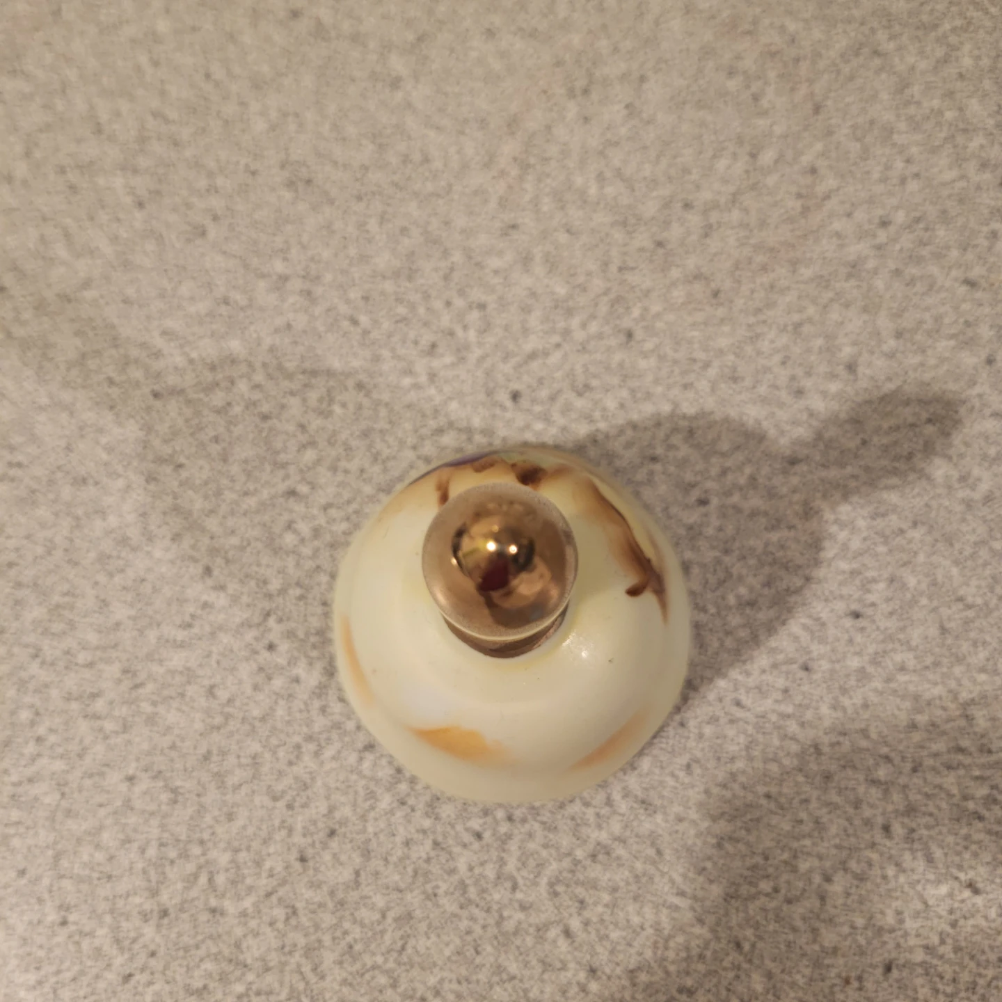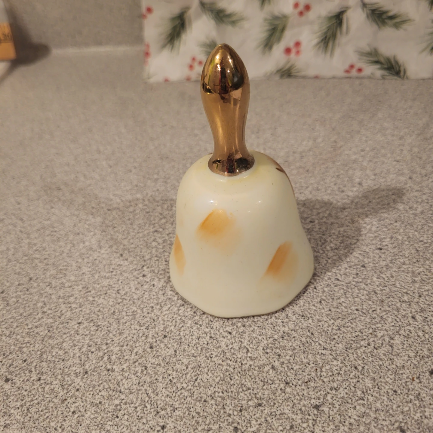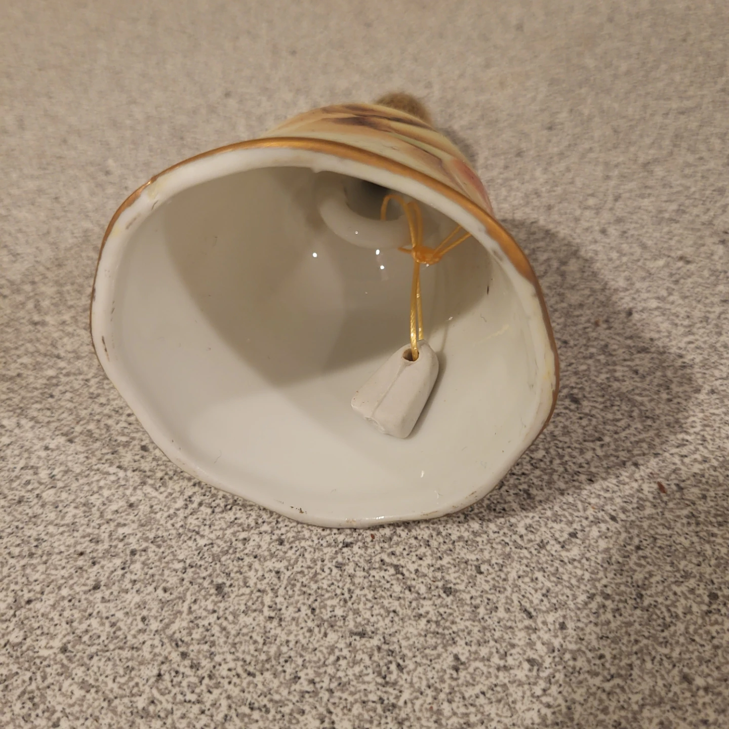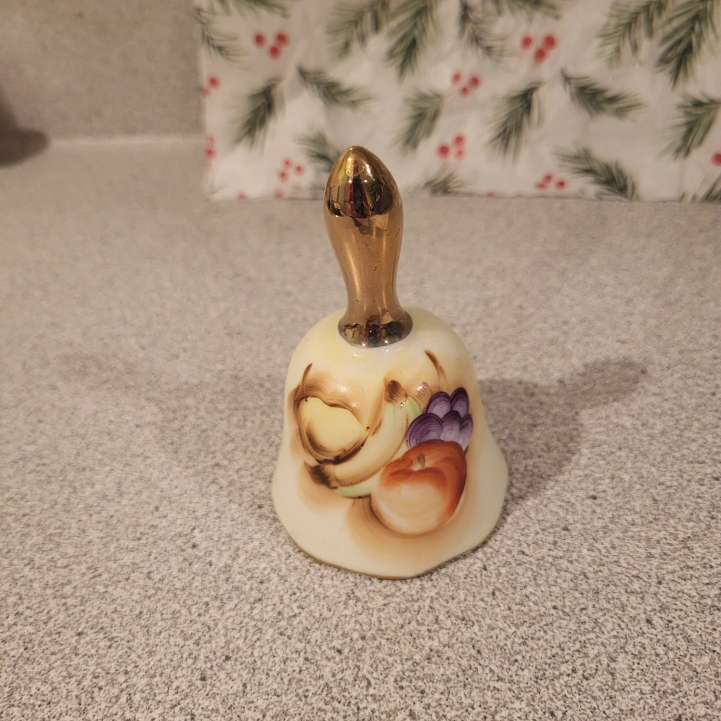 Selling a vintage ceramic bell with a gold-coloured handle and fruit design. It's in good condition and would make a lovely addition to any collection or home decor