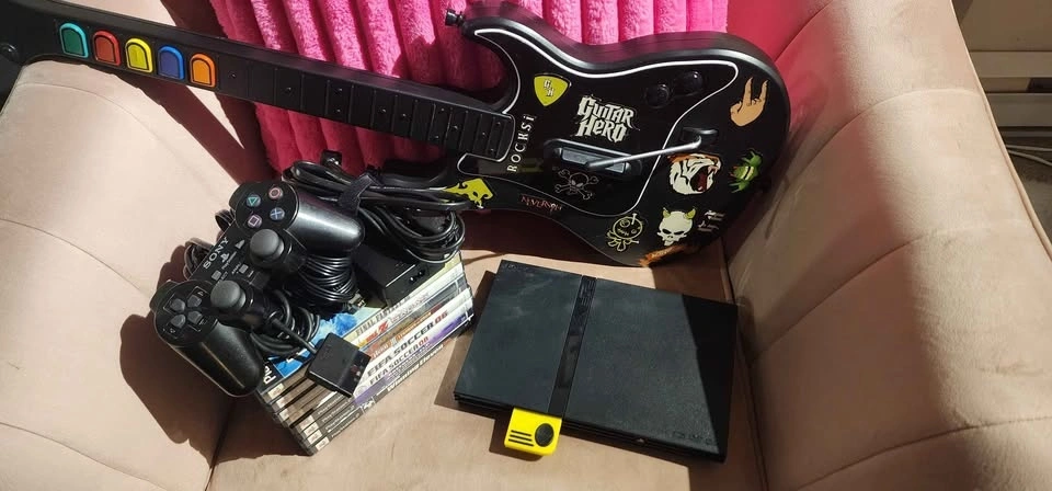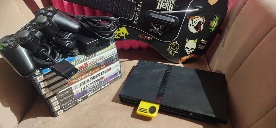 Selling my PlayStation 2 Slim in tested and fully working condition. Great bundle for retro gamers, Dragon Ball Z fans, and anyone who wants Guitar Hero included.