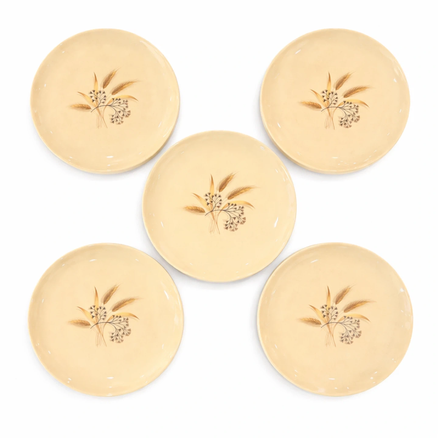 Offered is a set of five (5) vintage Canadian dinner plates by Sovereign Potters, in the sought-after “Sun Burst” pattern (marked 1315-57). Each plate presents a warm buttery-ivory glaze with a beautifully balanced stylized wheat/sheaf motif in honey-gold, caramel, and umber tones—classic mid-century Canadian tableware with a clean, modern silhouette and an elegant, harvest-inspired graphic.