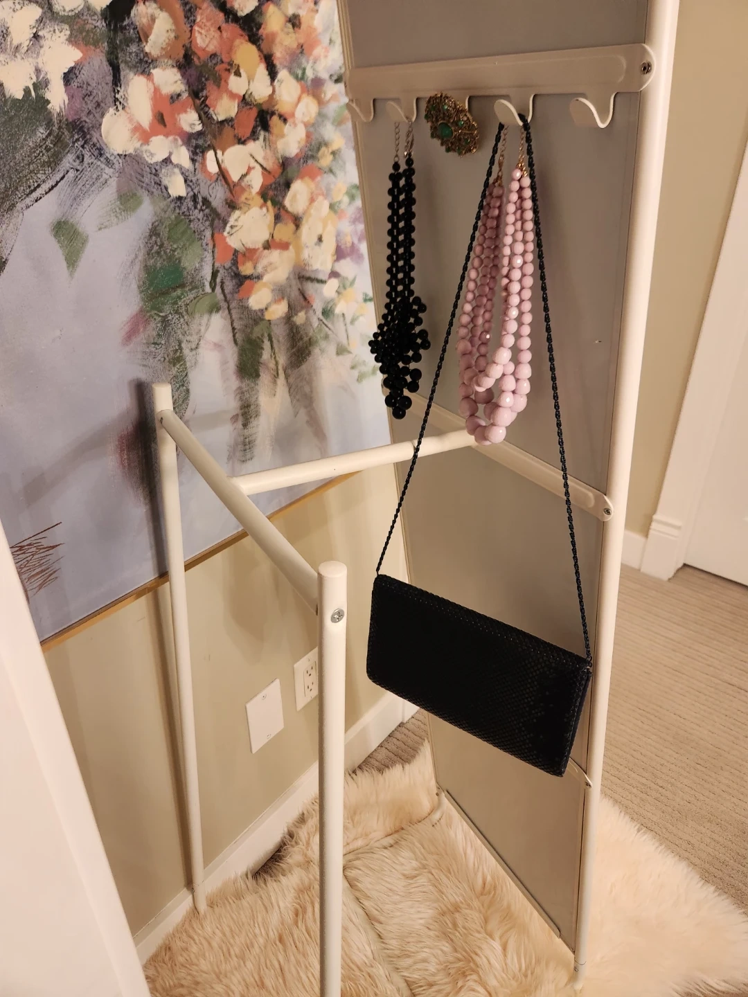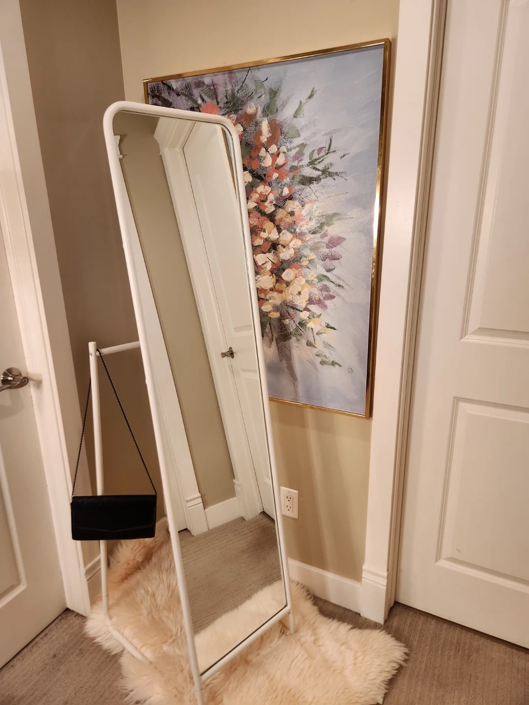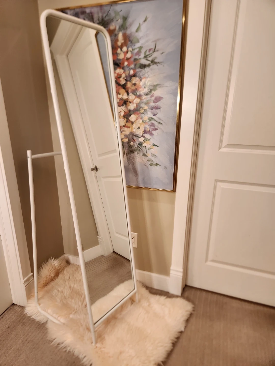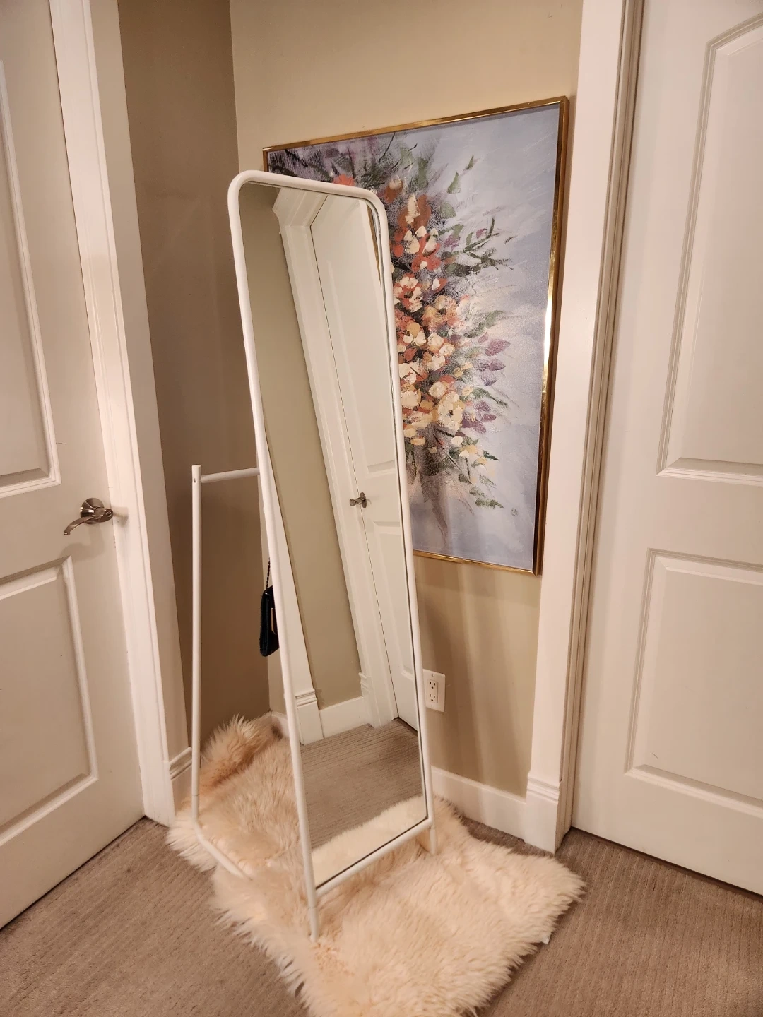 Selling a full-length standing mirror. It's in great condition and would look great in any room! The mirror is supported by a white frame. Mirror surface is 15x60 inches, back frame measures