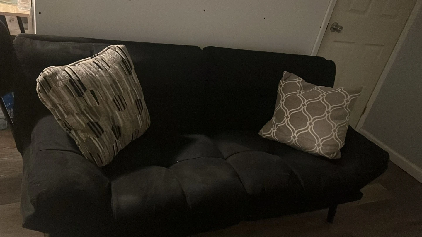 Selling a black futon sofa bed that's in good condition! It comes with two decorative pillows. Perfect for a living room or guest room