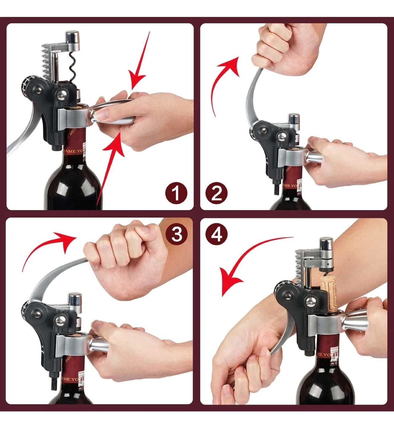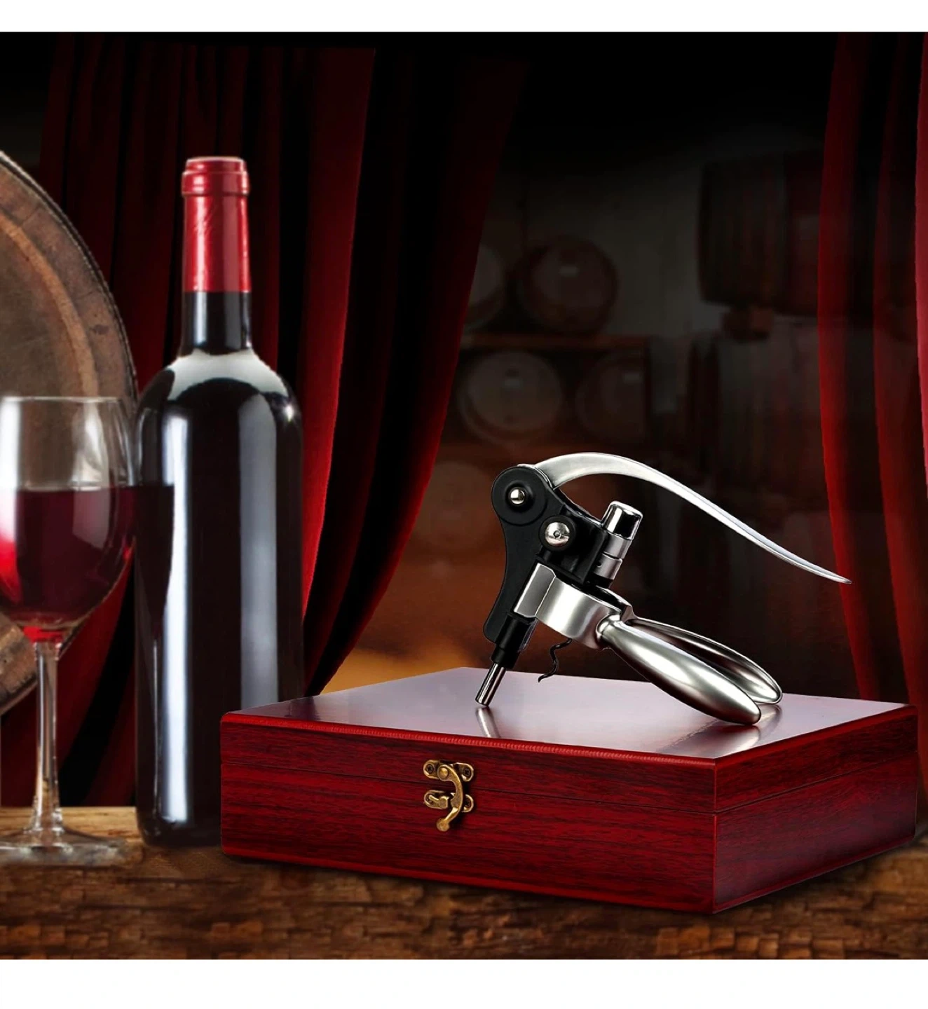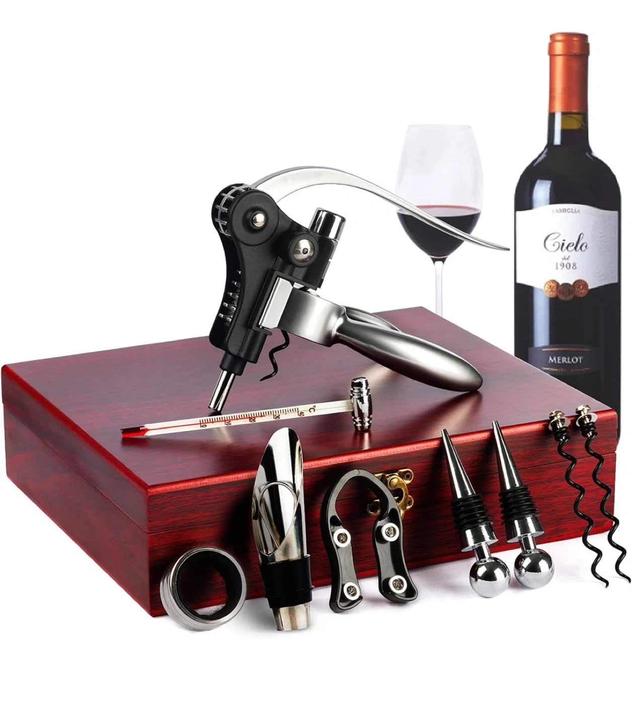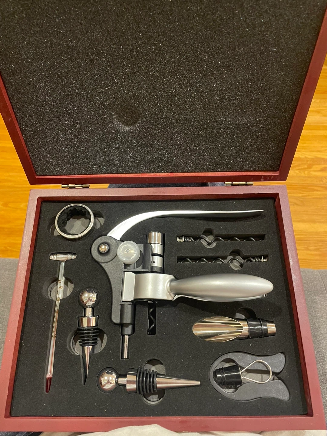 This is a wine opener set that comes with a variety of accessories. It includes a wine opener, thermometer, wine stoppers, and other tools. The set comes in a wooden box for easy storage and organization