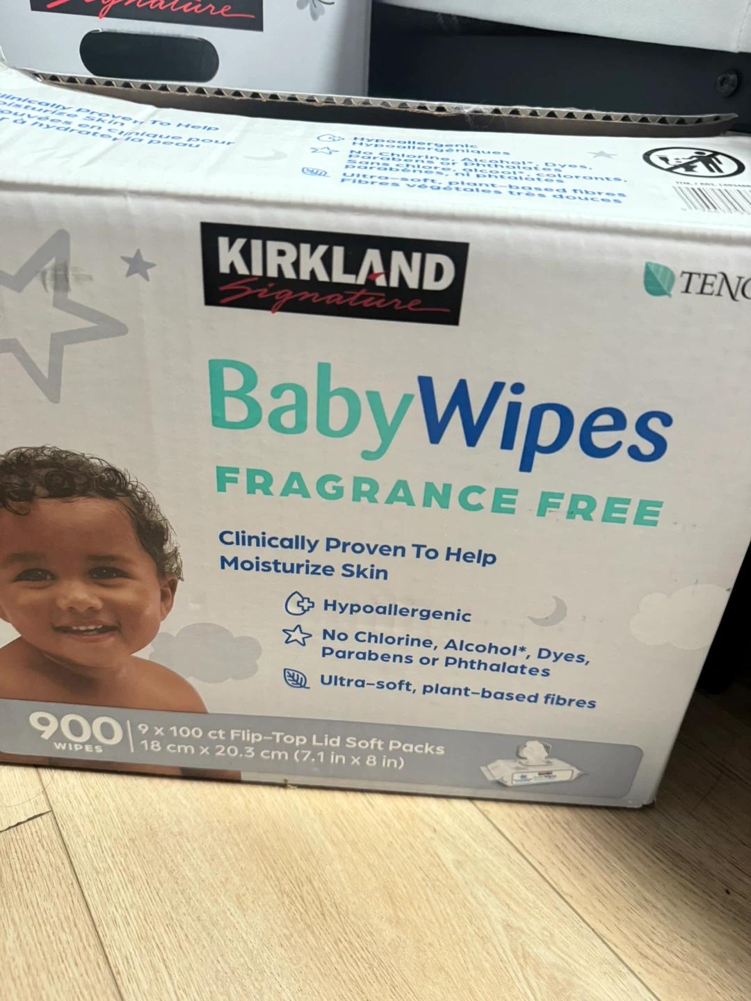 Selling a box of Kirkland Signature Baby Wipes! These are fragrance-free and hypoallergenic, perfect for sensitive skin. The box contains 4 packs of 100 wipes each, for a total of 400 wipes. They're clinically proven to help moisturize skin and are made with ultra-soft, plant-based fibres