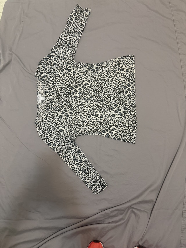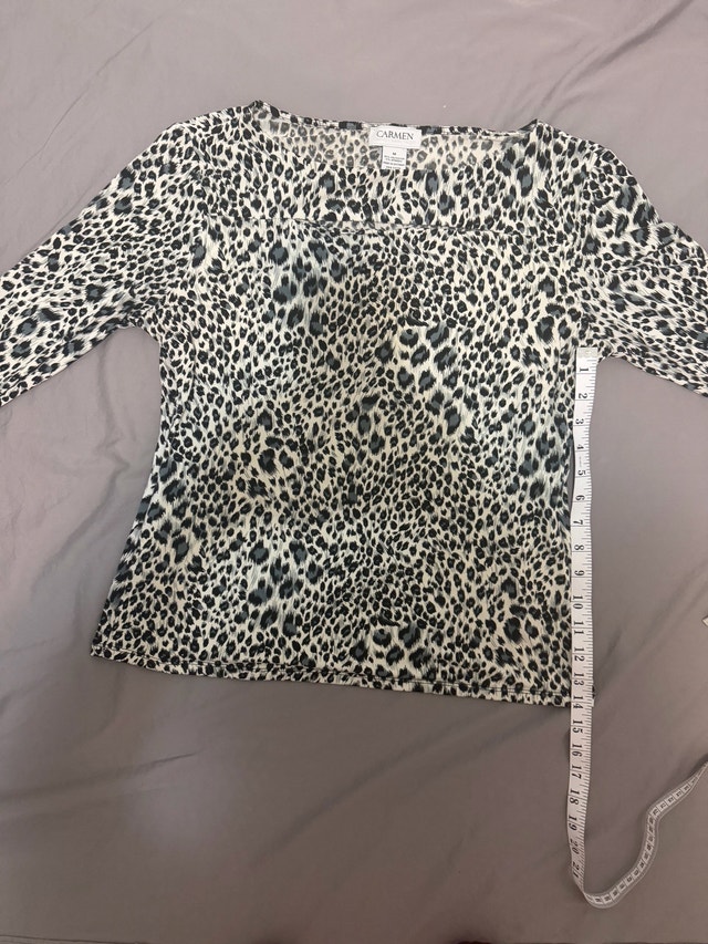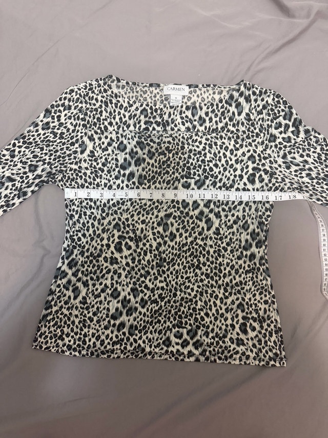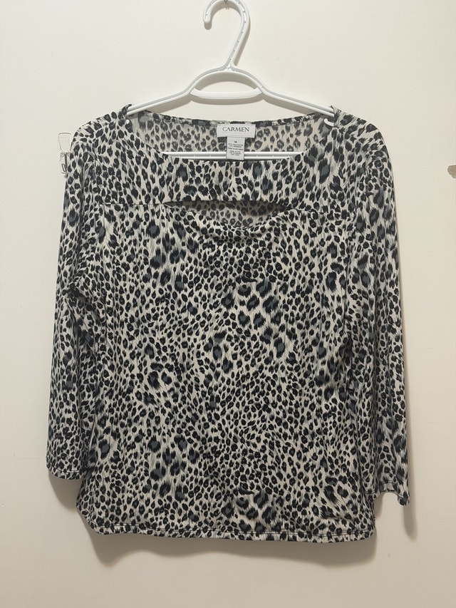 This is a pre-owned Carmen brand top, size medium, featuring a stylish animal print and comfortable 3/4 sleeves. It's in good condition and perfect for adding a touch of chic to your wardrobe.