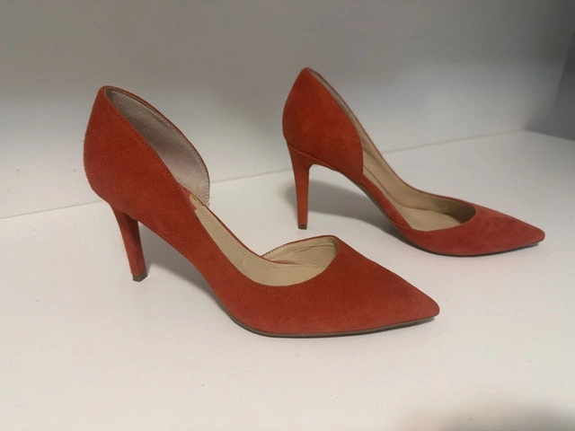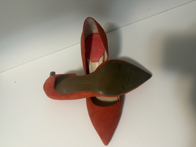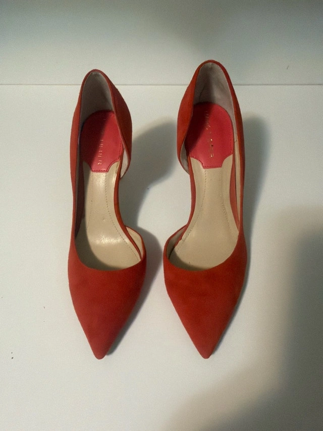 These are a pair of used Talbots brand ladies high heels in a size 7 with a stylish pointed toe. These shoes have a vibrant red suede exterior. The heel height is approximately 3 inches. They are in good condition, with some minor signs of wear.