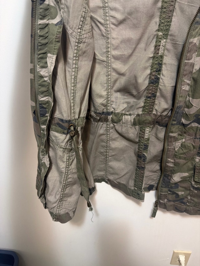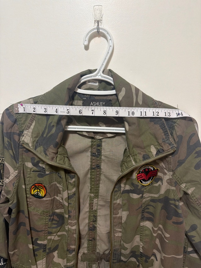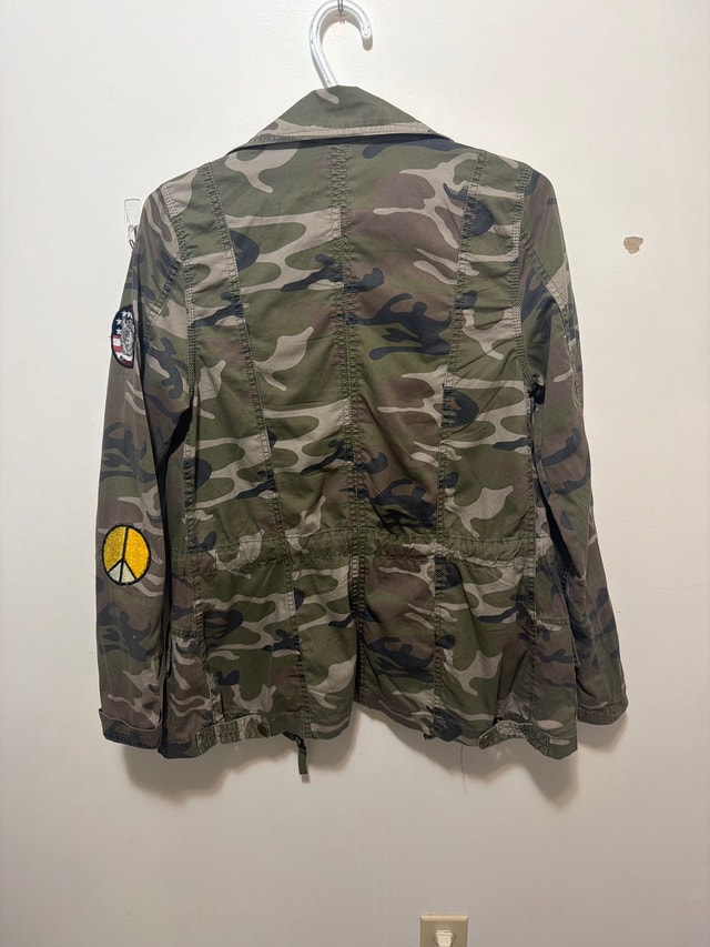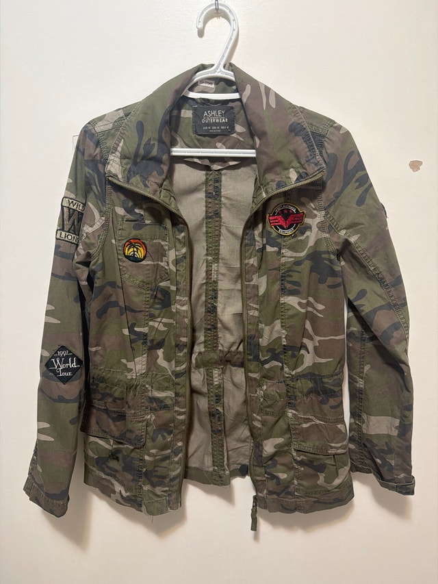 This Ashley Outerwear jacket is a stylish, used camouflage jacket in a ladies size medium, perfect for adding a touch of military-inspired fashion to your wardrobe. This never worn jacket features multiple decorative patches and a comfortable fit, making it a great choice for casual wear. Here are some details: - Brand: Ashley Outerwear - Size: Medium (8-10) - Pattern: Camouflage - Condition: Used - Colour: Green This jacket is patiently waiting to accompany you on your next adventure, whether you're navigating city streets or exploring the great outdoors! Grab it before it disappears into the wilderness! Please note, if the ad is still up, the jacket is available. A-8