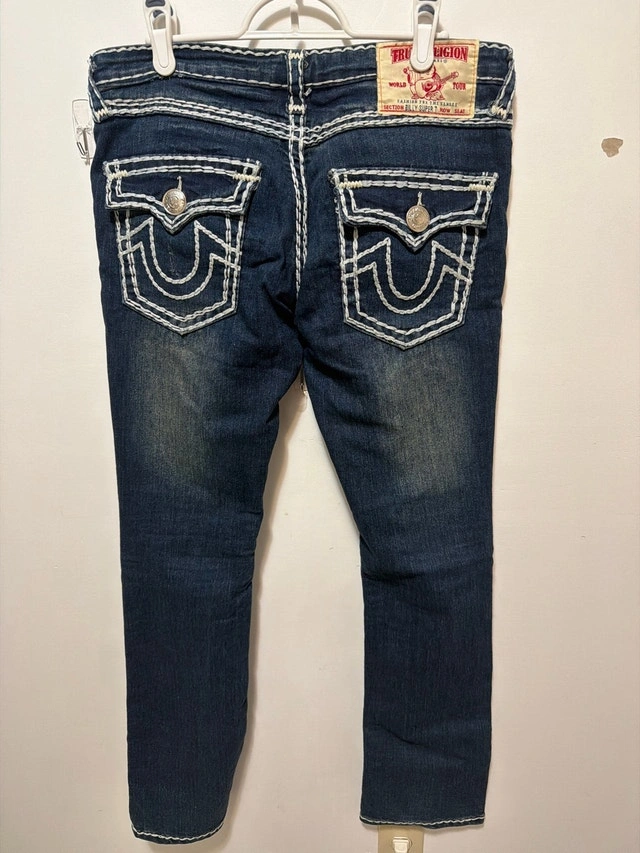 These are a pre-owned pair of True Religion jeans, size 31. The dark wash denim features the brand's signature white stitching and logo detailing. The jeans are in good condition, showing some signs of wear. Specifications: * Brand: True Religion * Size: 31 * Material: Denim * Colour: Dark Wash * Style: Jeans If the ad's still up, the jeans are still up for grabs! A-14