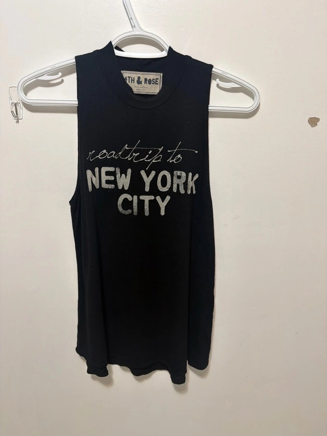 Add a touch of urban chic to your wardrobe with this 4th & Rose black tank top, size large, featuring a 'Road Trip to New York City' graphic. This trendy piece is perfect for casual outings or layering with your favourite jacket. Being pre-loved, it carries a subtle charm that only adds to its character.