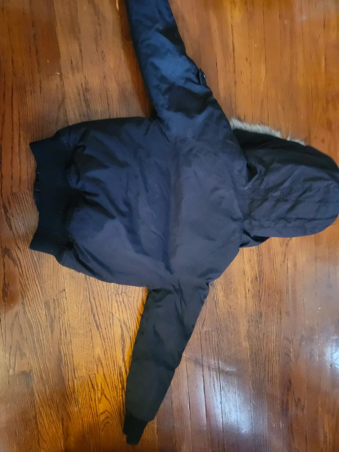 Here's a stylish Ecko Unltd. jacket, perfect for keeping your little one warm! The size is XS/TP (4/5). It's a sleek black colour and features a cozy fur-trimmed hood