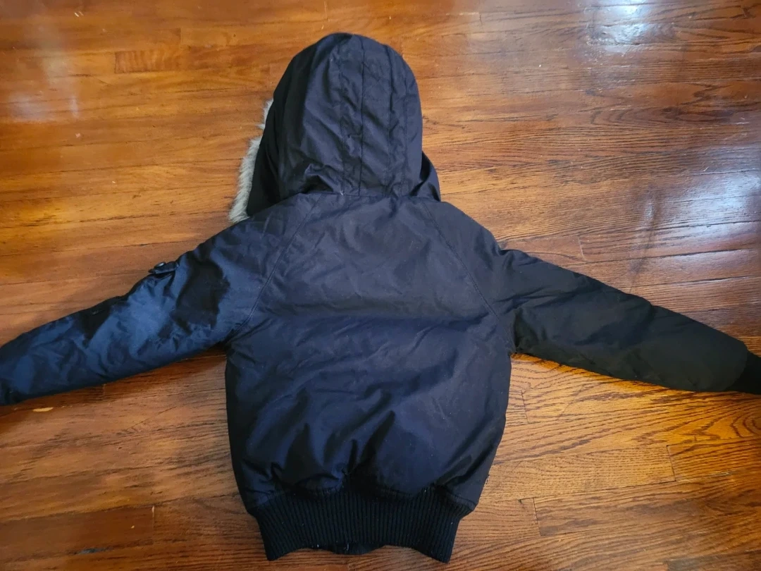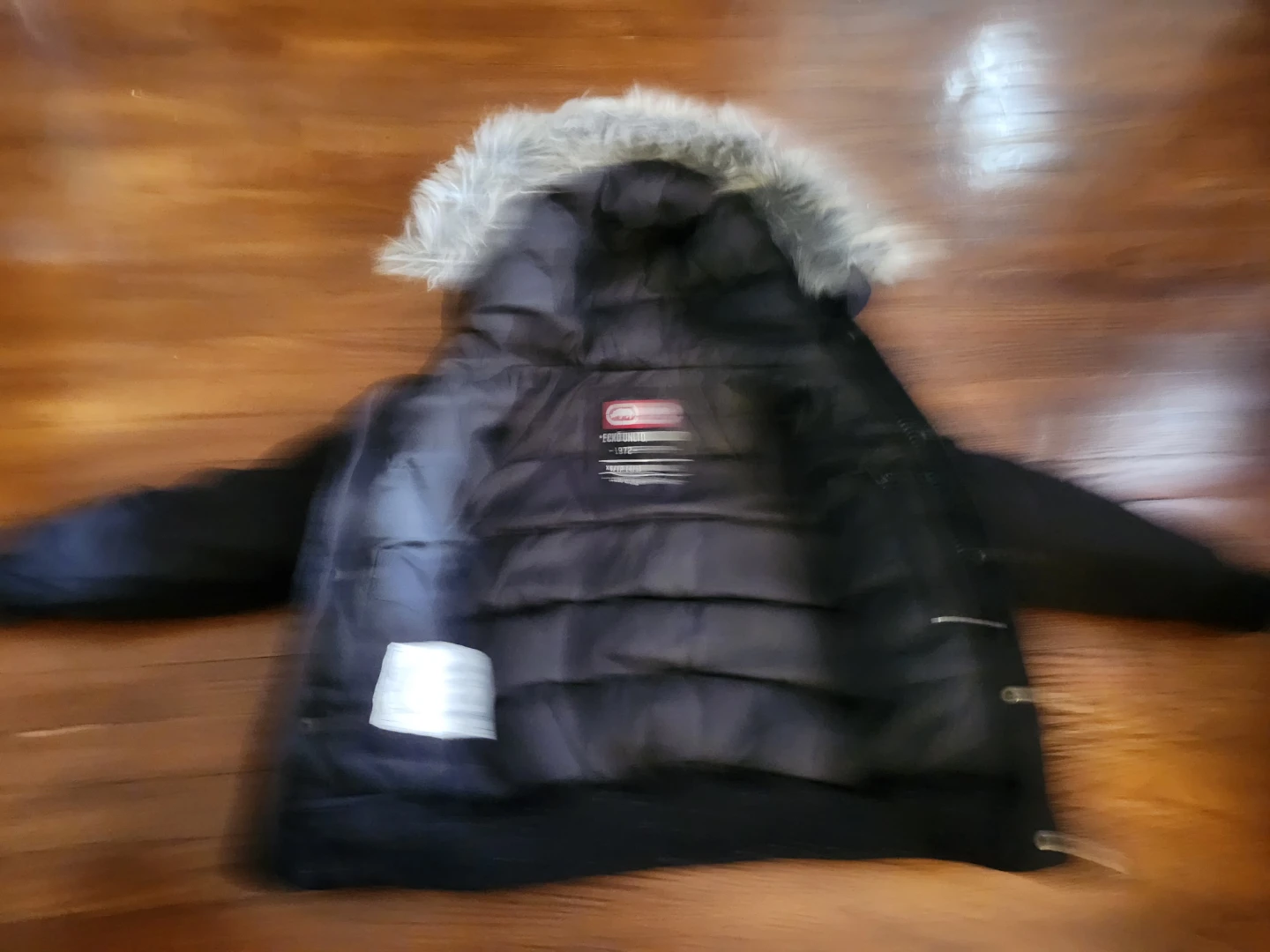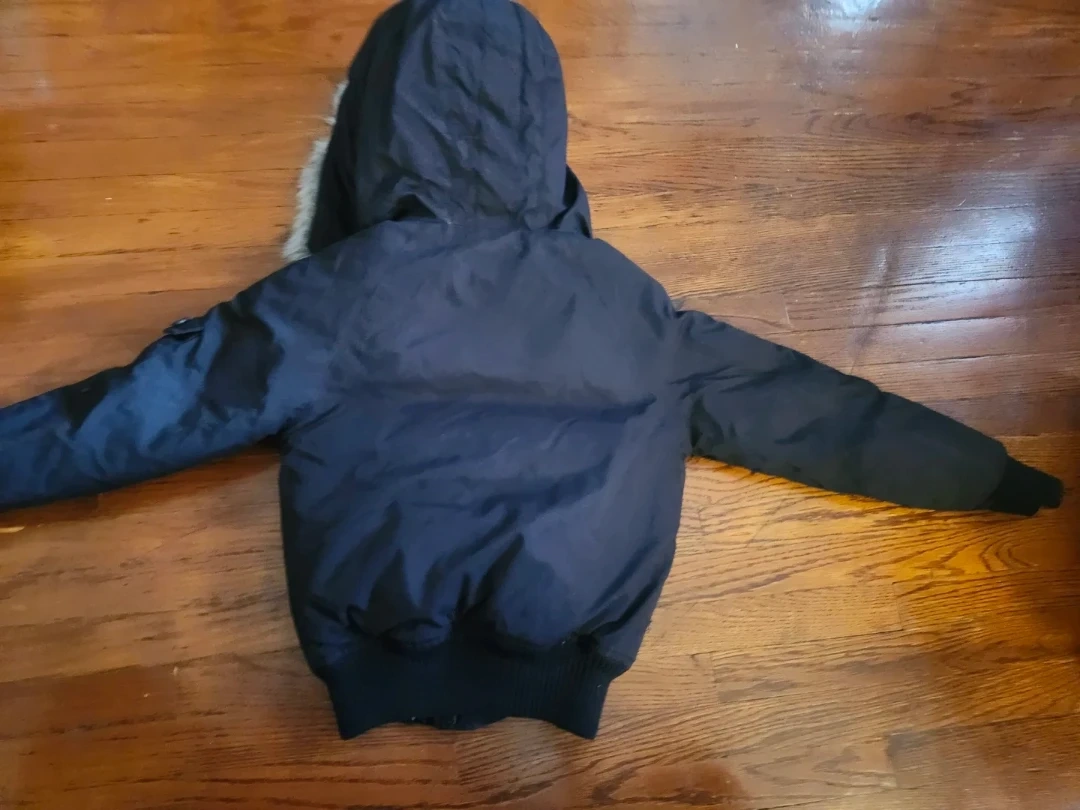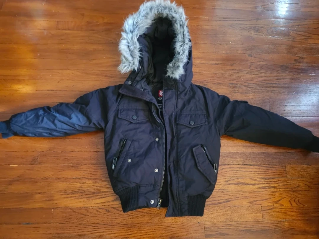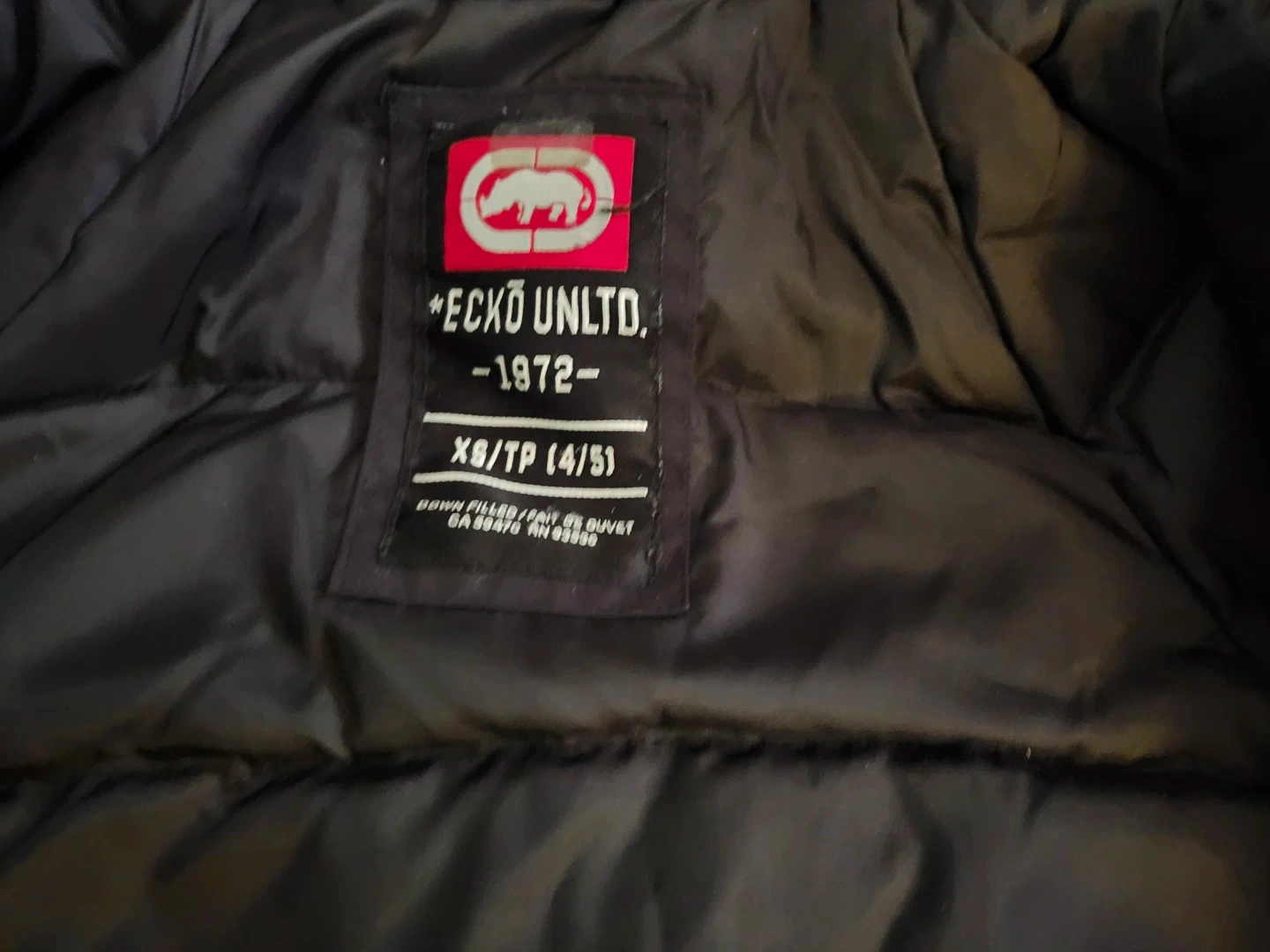 Here's a stylish Ecko Unltd. jacket, perfect for keeping your little one warm! The size is XS/TP (4/5). It's a sleek black colour and features a cozy fur-trimmed hood