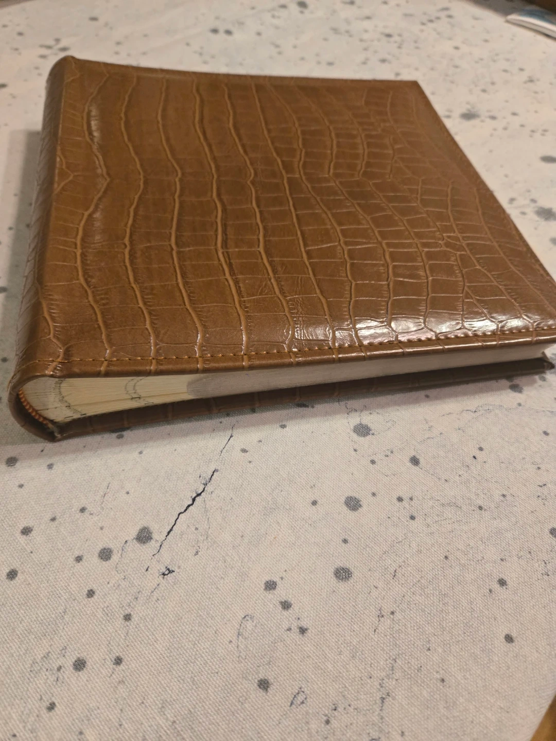 Photo album that holds 200 photos of 4" x 6" size. It has a brown, faux-crocodile skin texture. The inside pages have a fleur-de-lis pattern and space to write notes next to each photo
