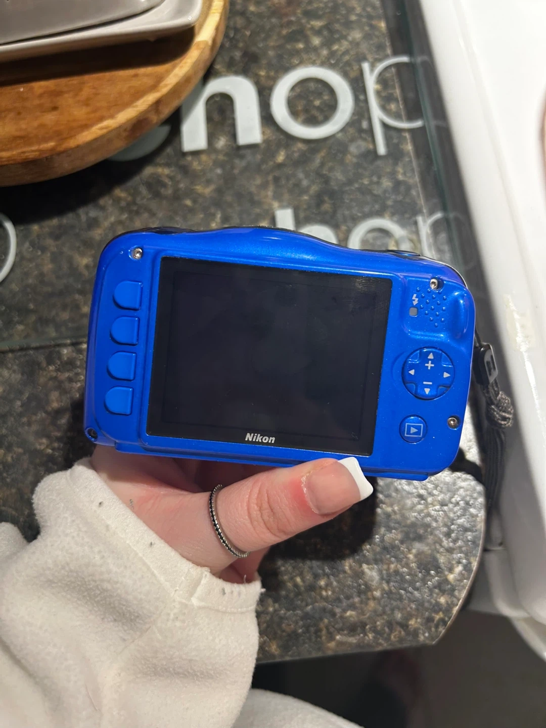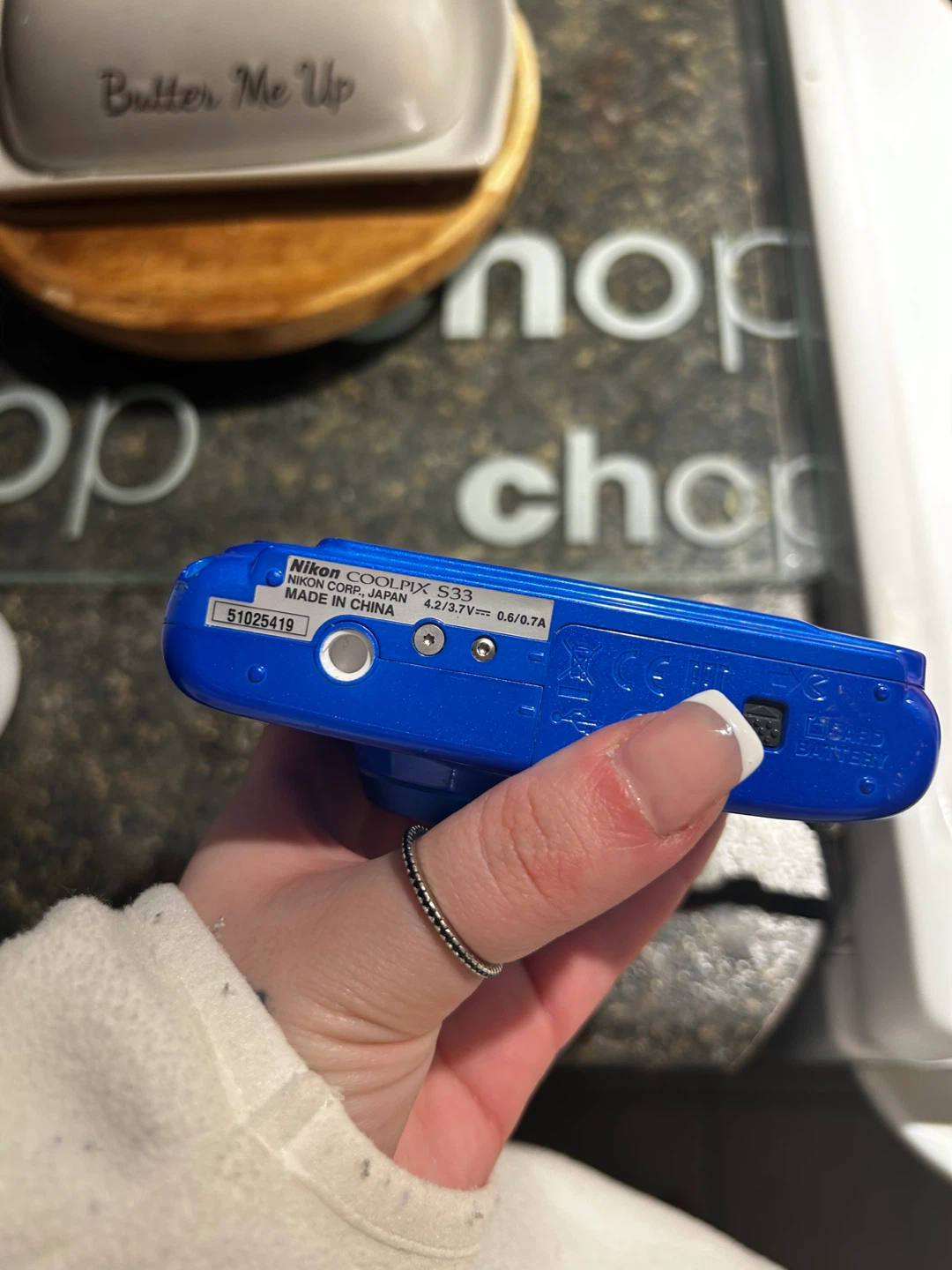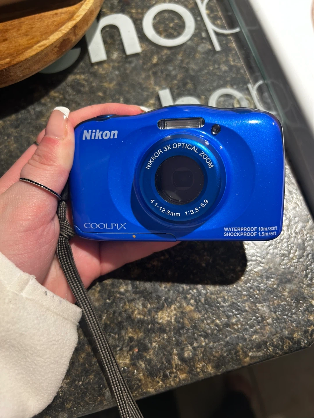 Selling a blue Nikon Coolpix S33 digital camera. It's waterproof up to 10m/33ft and shockproof up to 1.5m/5ft. The lens is a Nikkor 3x optical zoom 4.1-12.3mm 1:3.3-5.9. Does no come with a charger but your welcome to bring a charged battery to test. You can buy a charger cheap on Amazon.