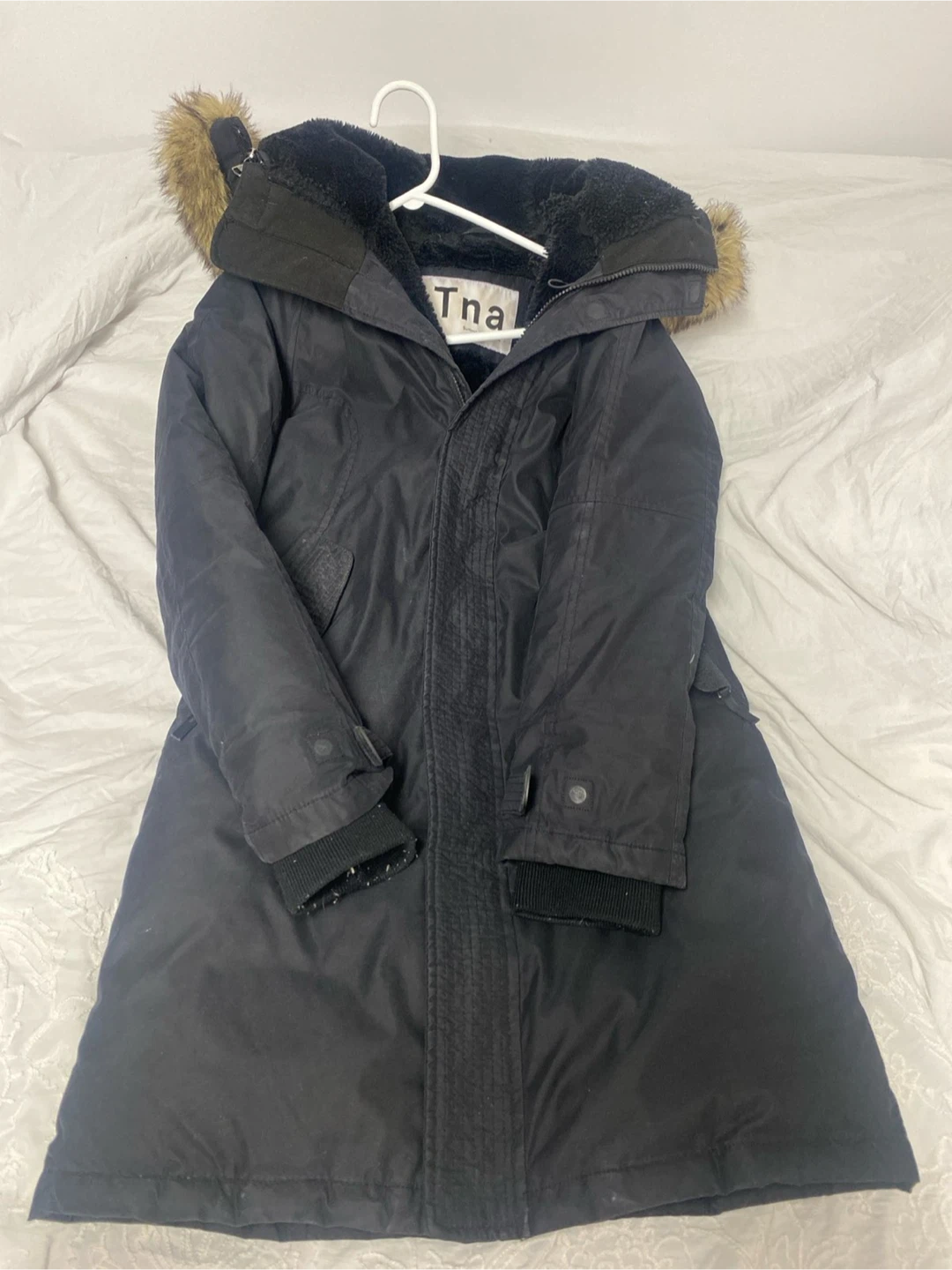 Selling a TNA black winter coat. It's in good condition and ready to keep you warm this winter! The coat has a fur-lined hood for extra coziness. Pick up cash only