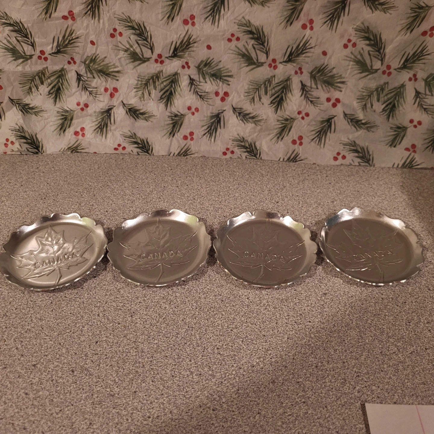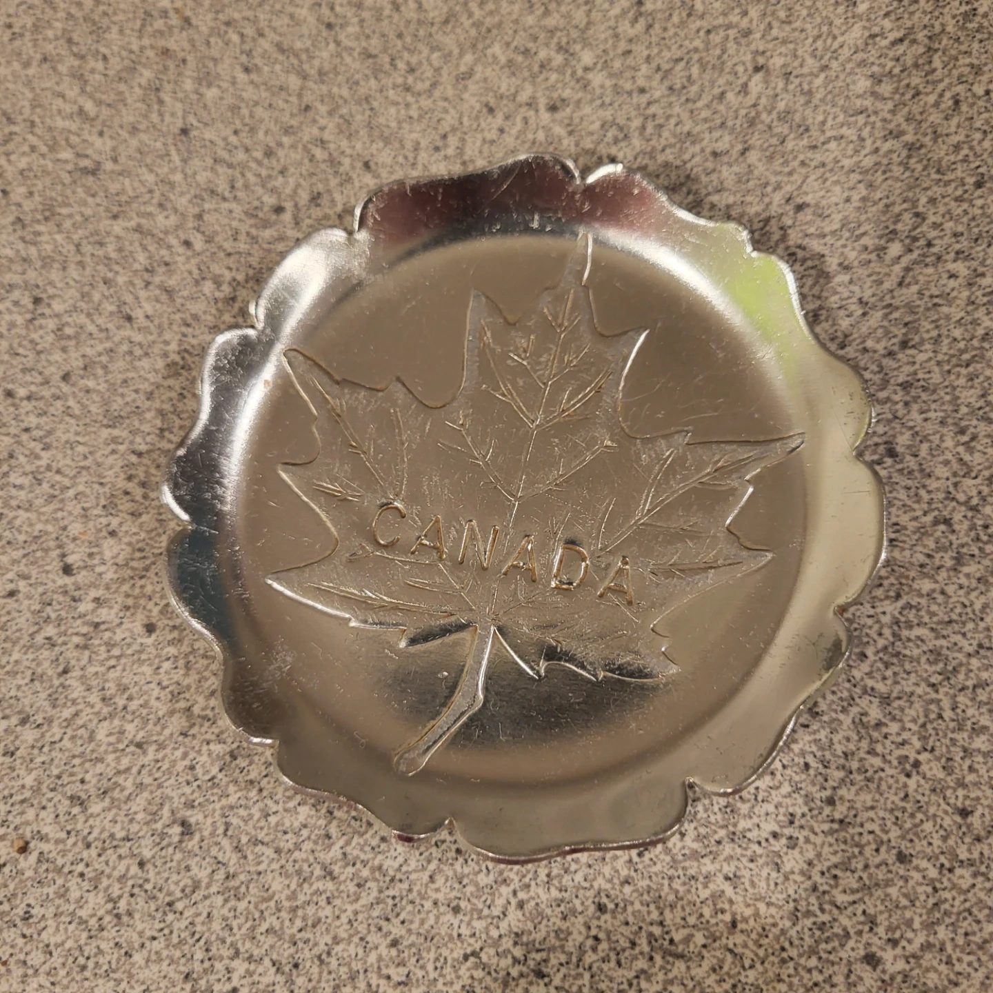 Selling a cute little trinket dish with a maple leaf design and 'CANADA' embossed on it. Perfect for holding small items or just adding a touch of Canadian charm to your space