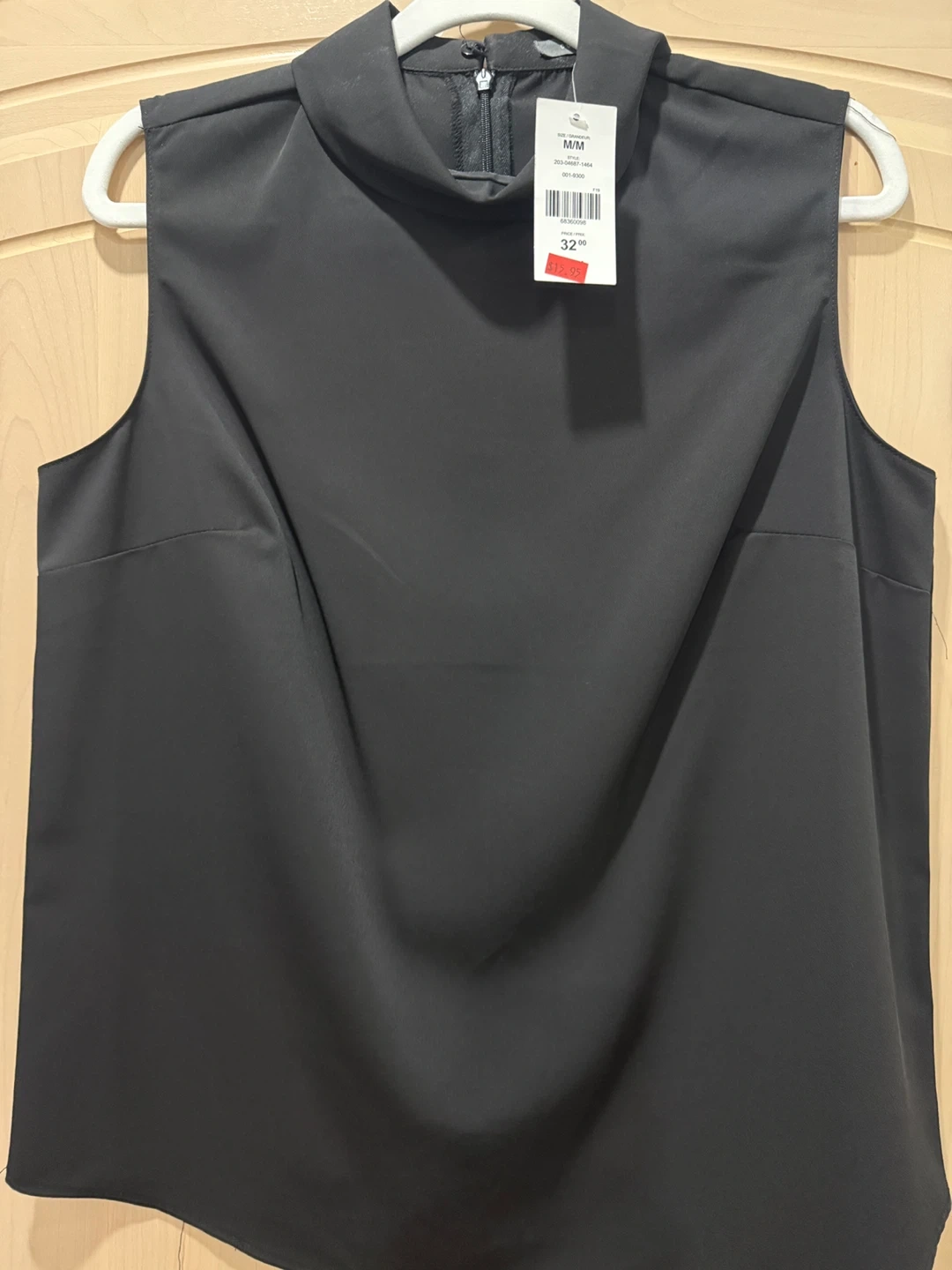 This is a black sleeveless top in size M/M. It is new with tags, and the original price was $32.00. It has a high collar and a zipper in the back. It's a stylish and versatile piece!
