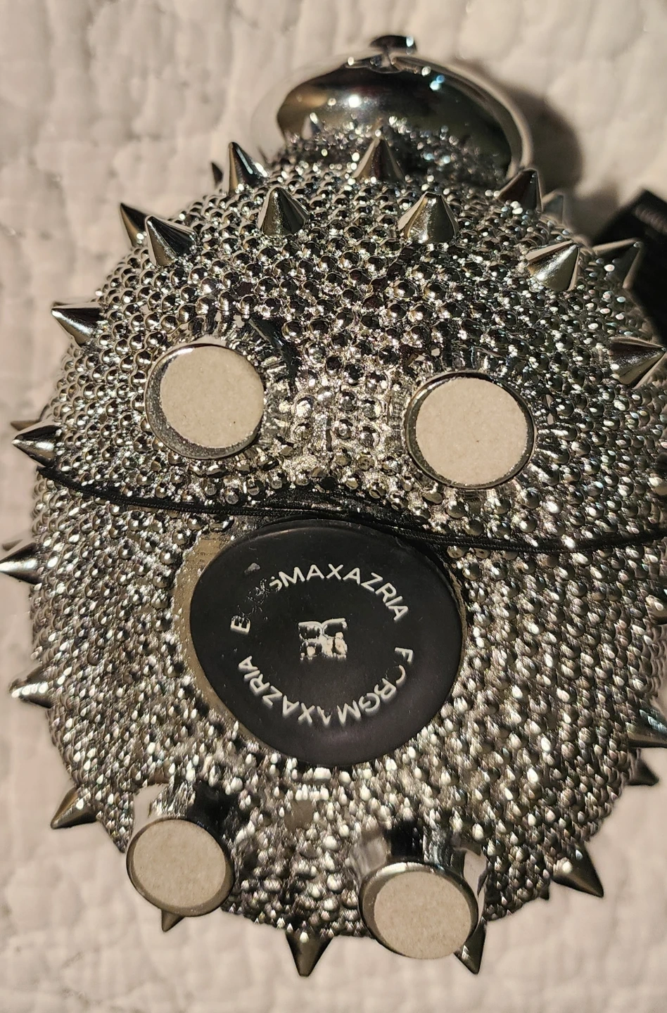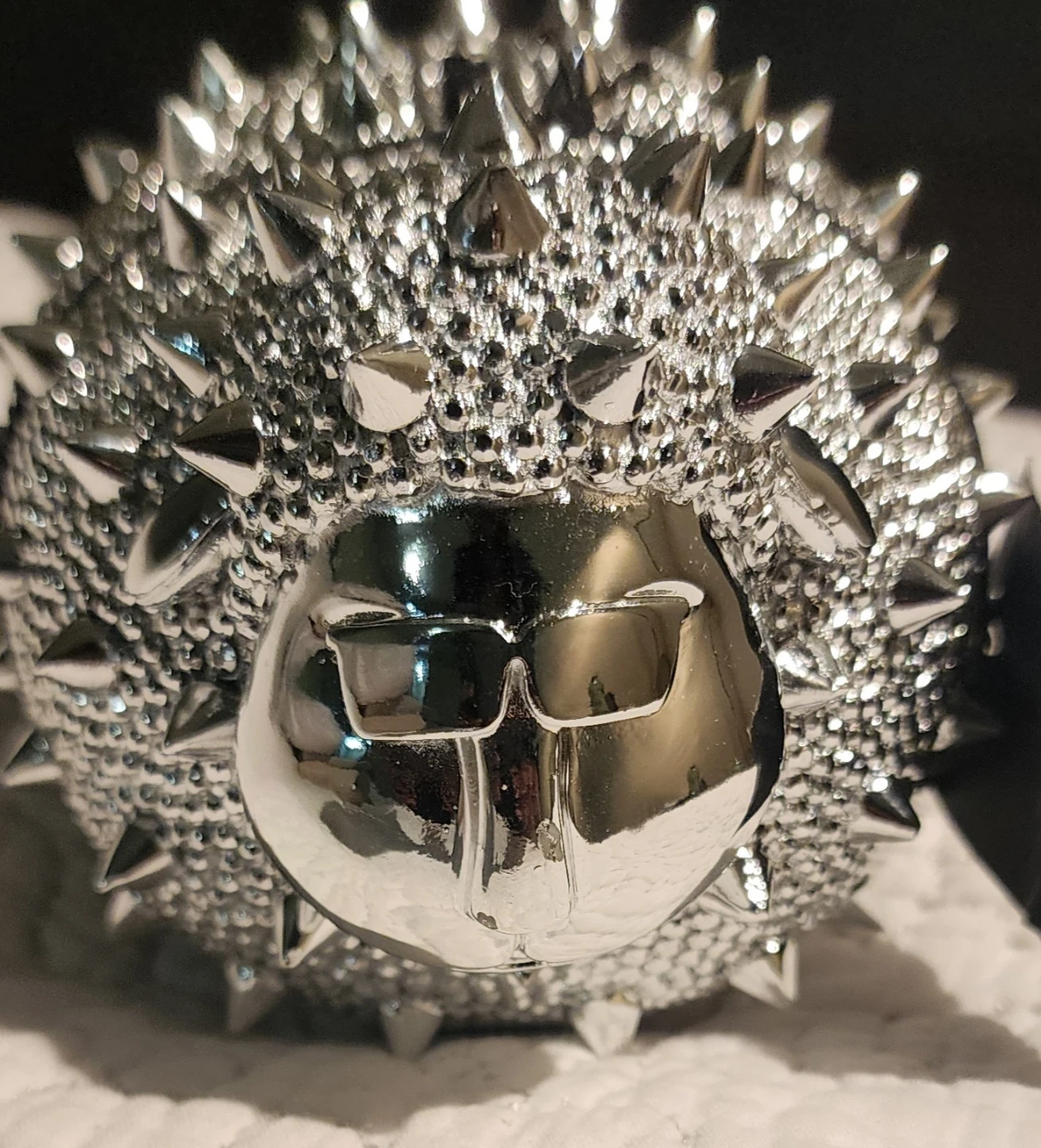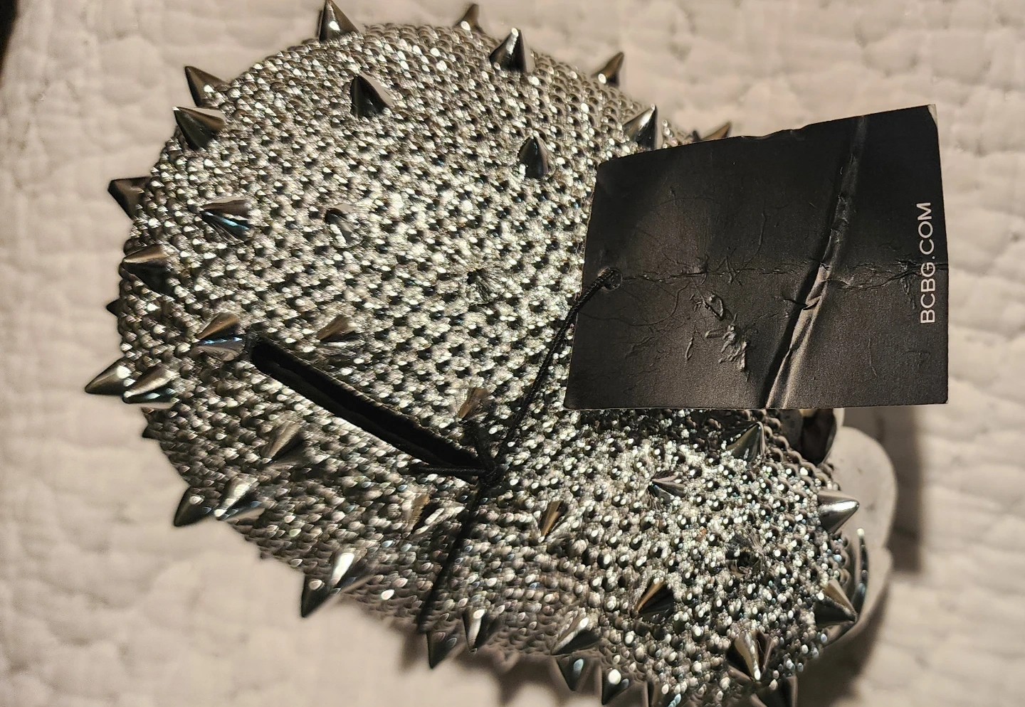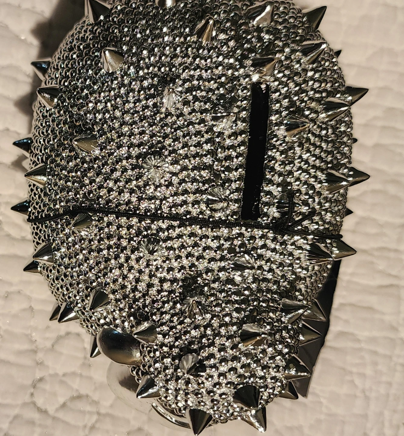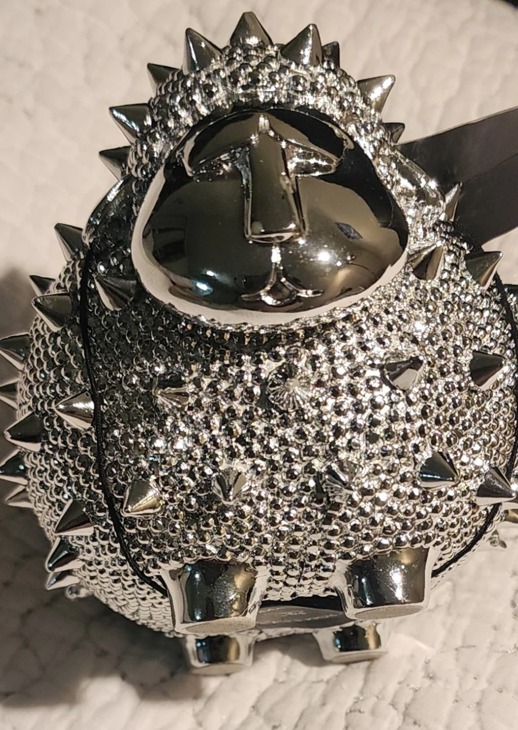 It's a silver colour and covered in studs, adding a bit of edge to a traditional design. It would make a great addition to any collection or as a fun way to save your change.