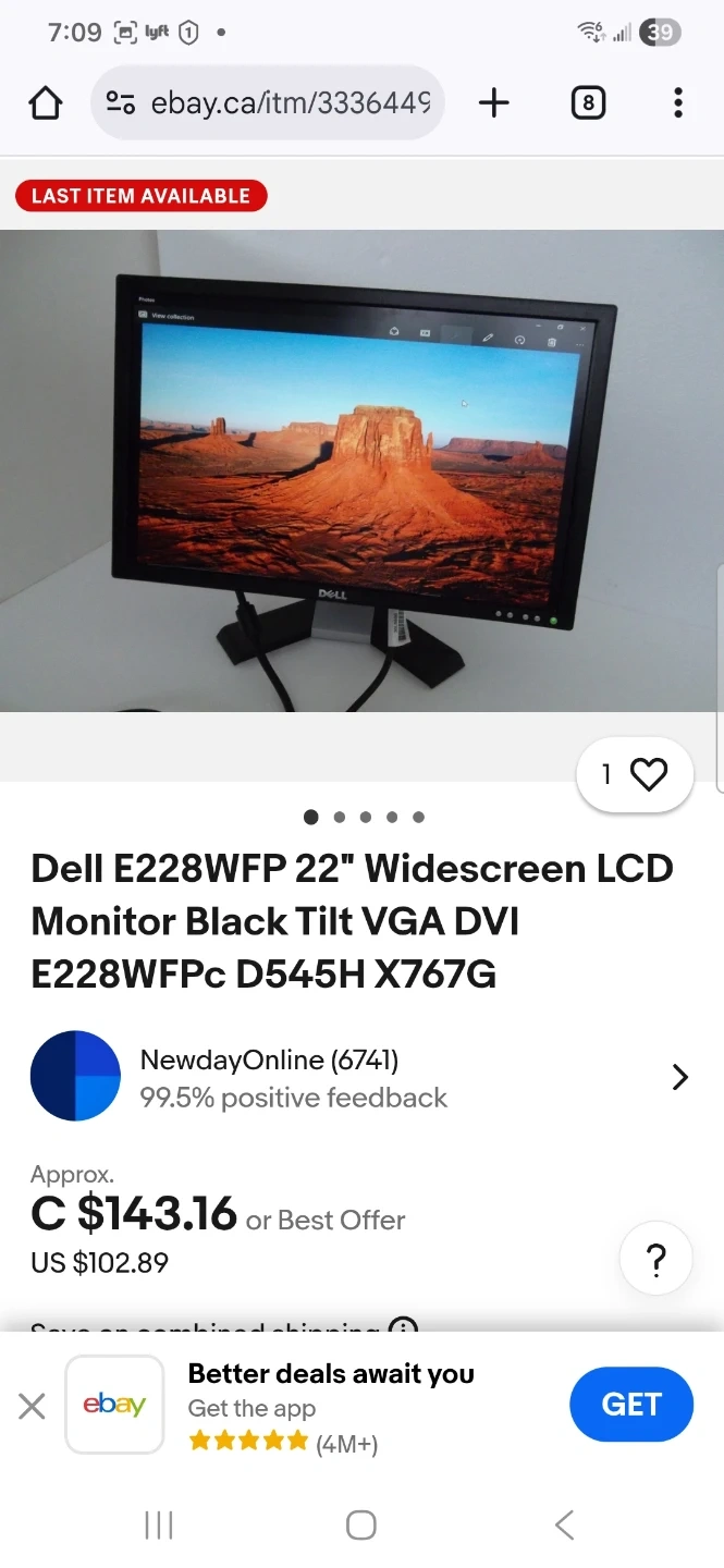 Selling a Dell E228WFPc 22-inch widescreen LCD monitor! It's black and features a tilt function, VGA, and DVI connectivity. Great for home or office use