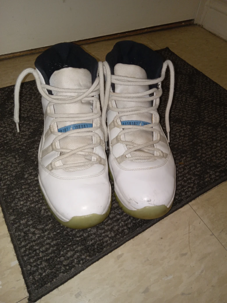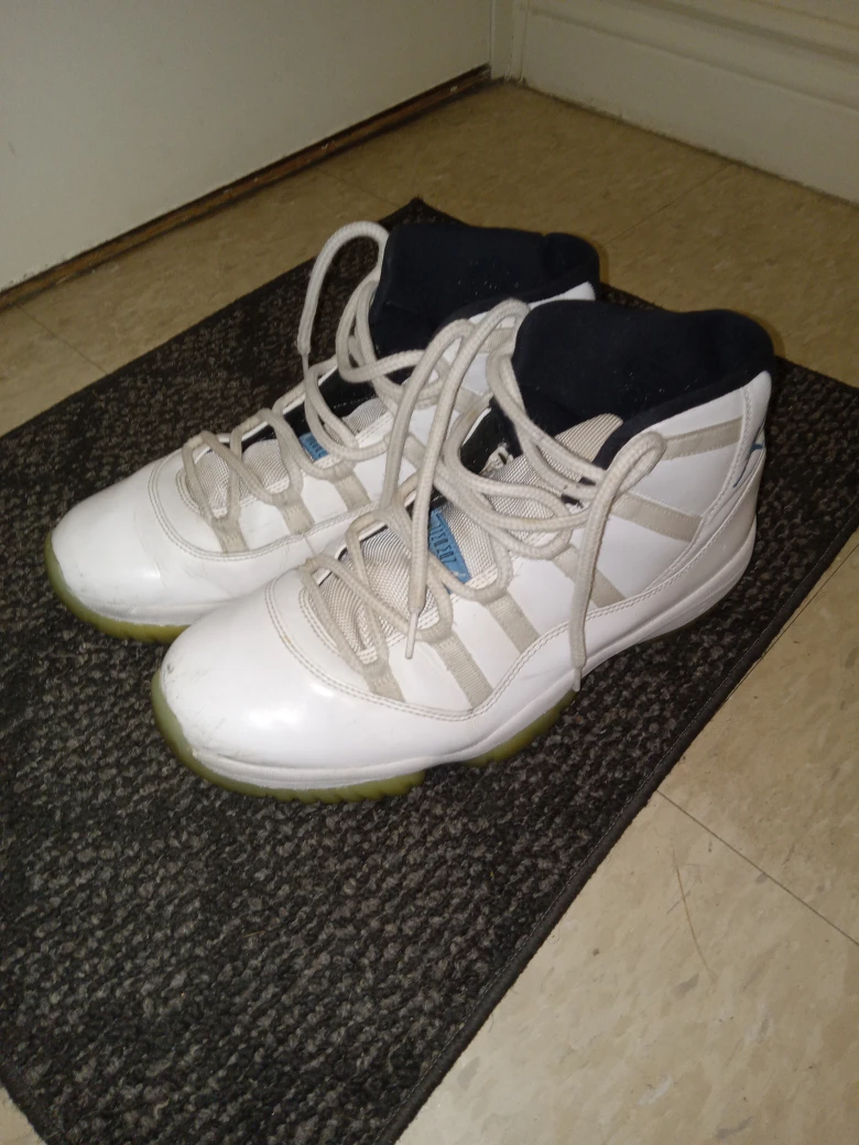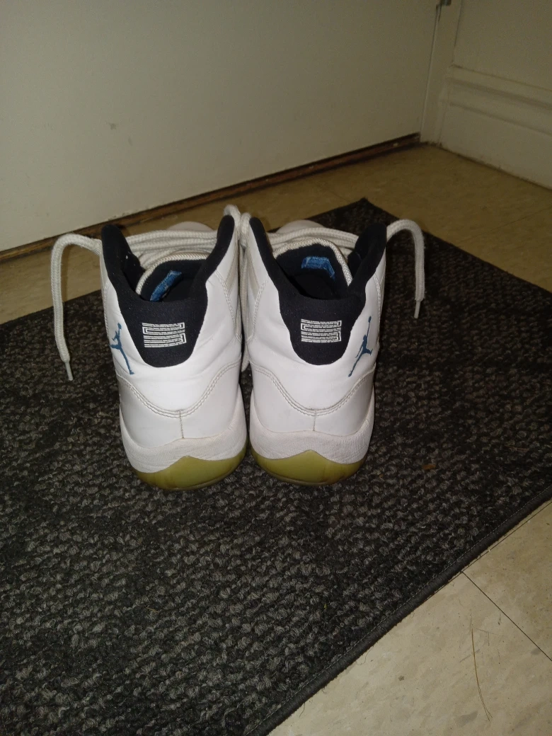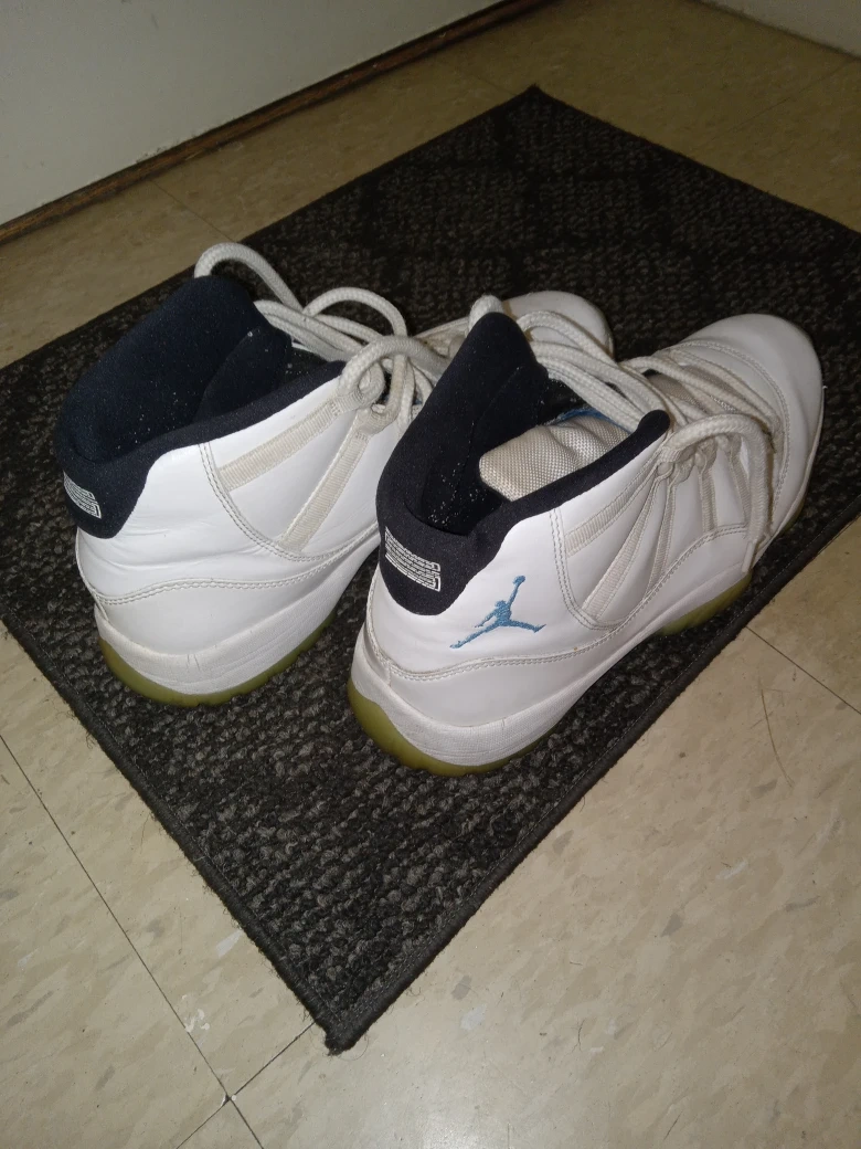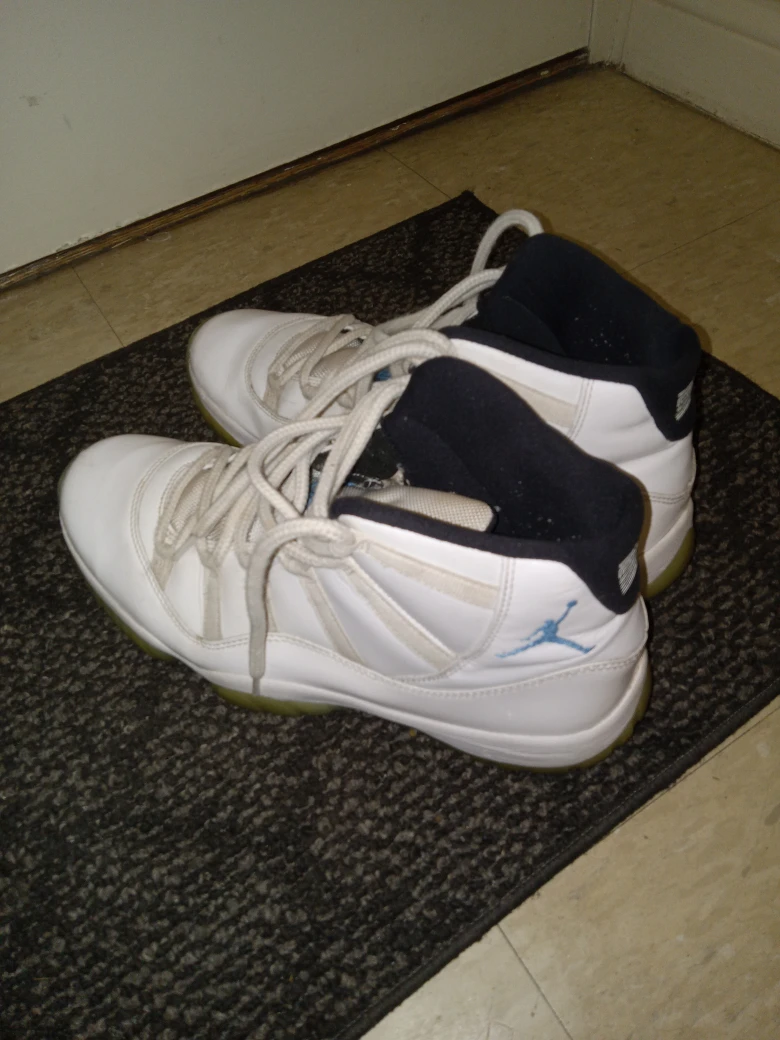 Selling a pair of Jordan 11 Retro "Legend Blue" sneakers in white and university blue. They are in used condition. Please see pictures for details!