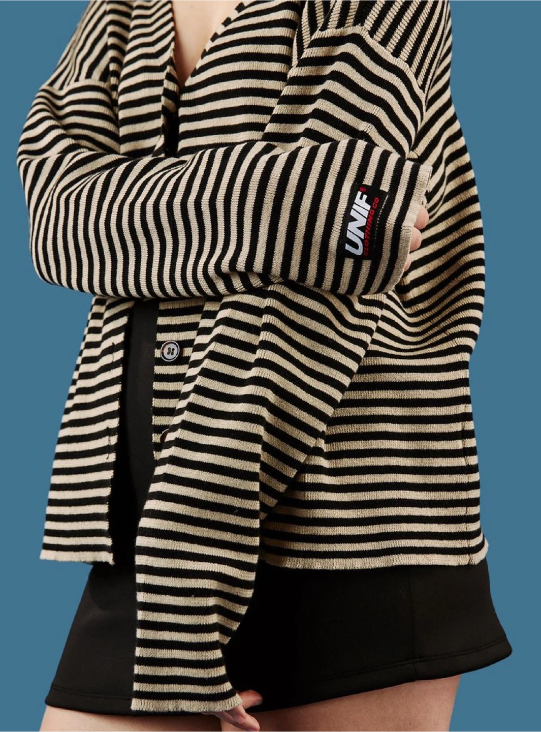 Stylish UNIF cardigan with a classic striped pattern! This cardigan is perfect for layering and adding a touch of cool to any outfit. The UNIF logo is subtly featured on the sleeve. Great for casual wear or dressing up!