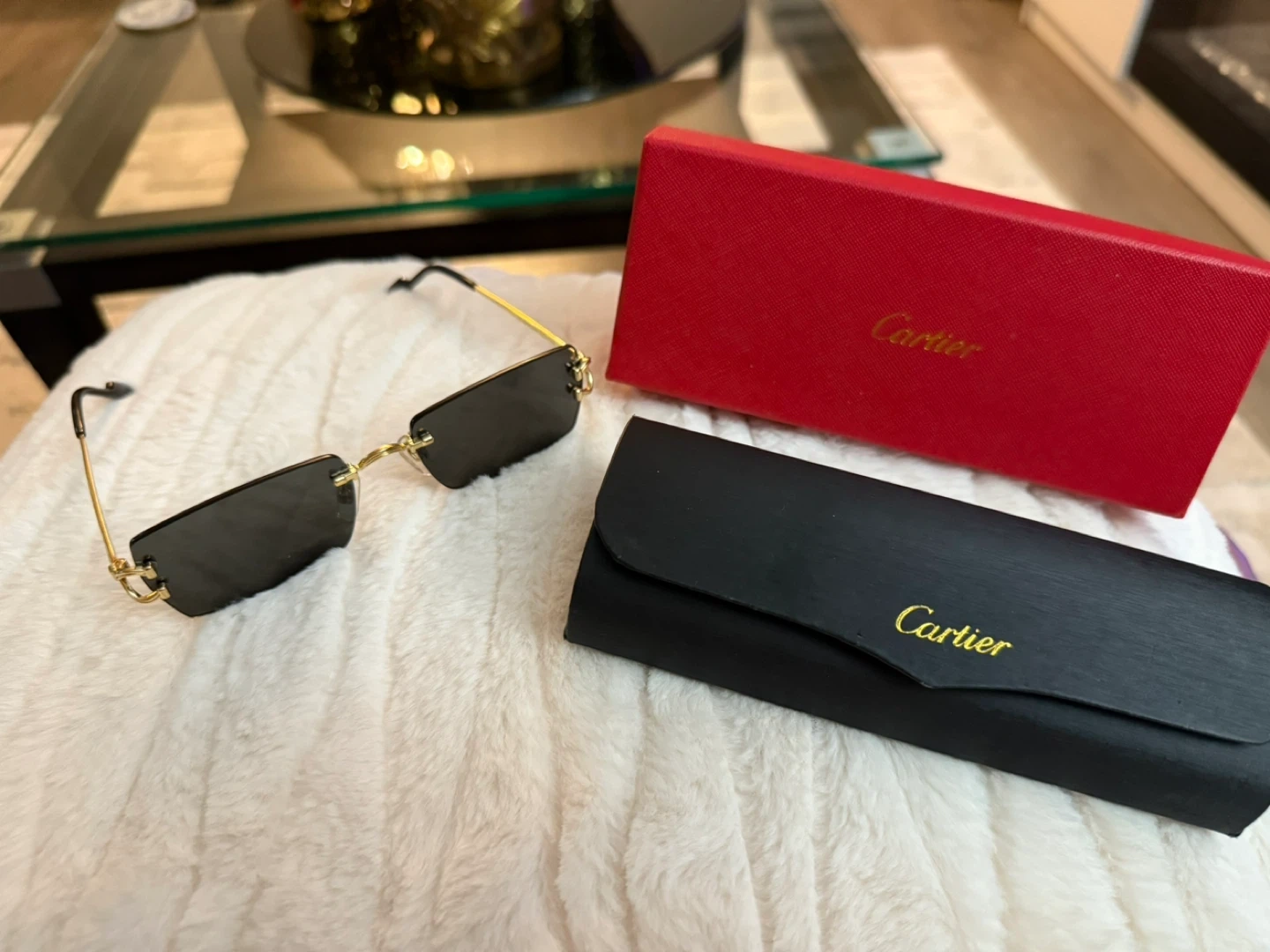 Selling a pair of Cartier sunglasses. They come with both the red box and the black case. The sunglasses have gold frames and dark lenses. Stylish and in great condition!