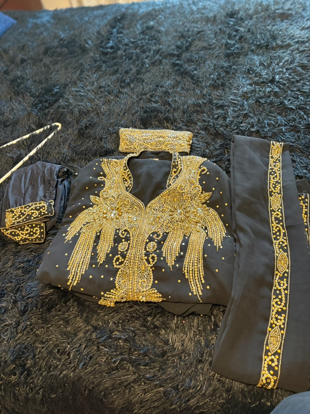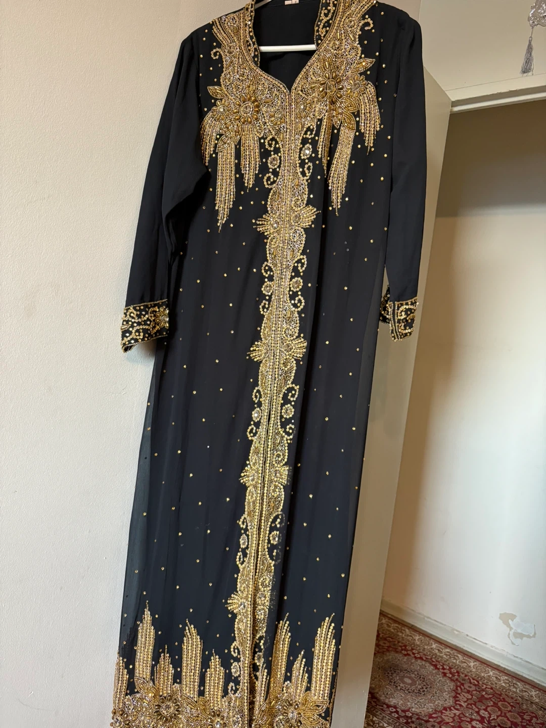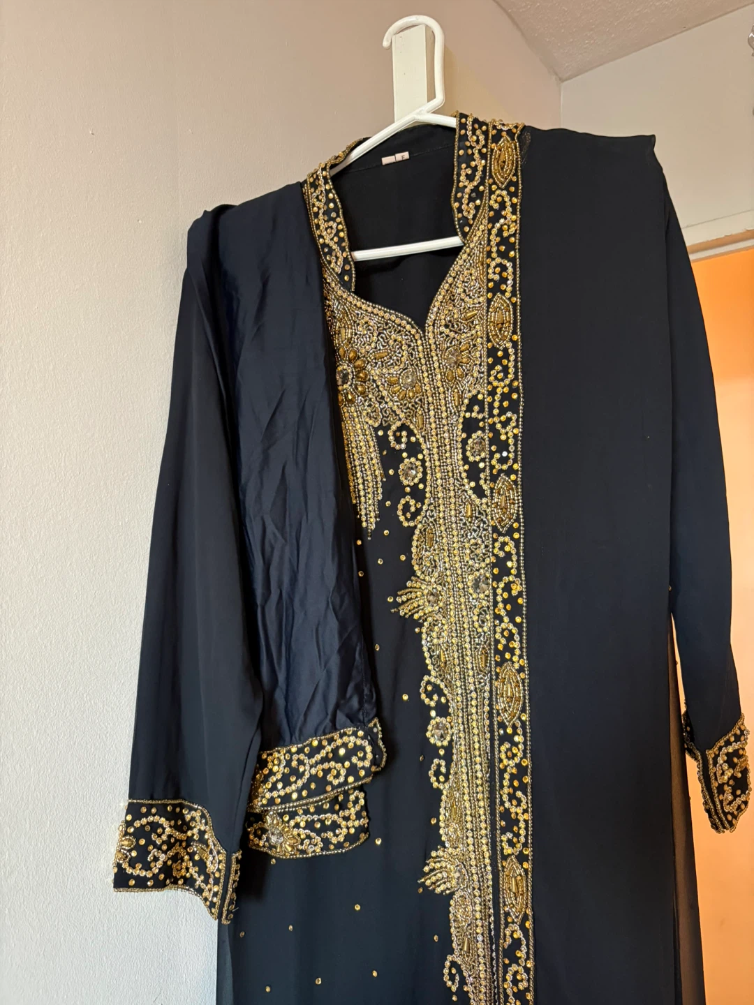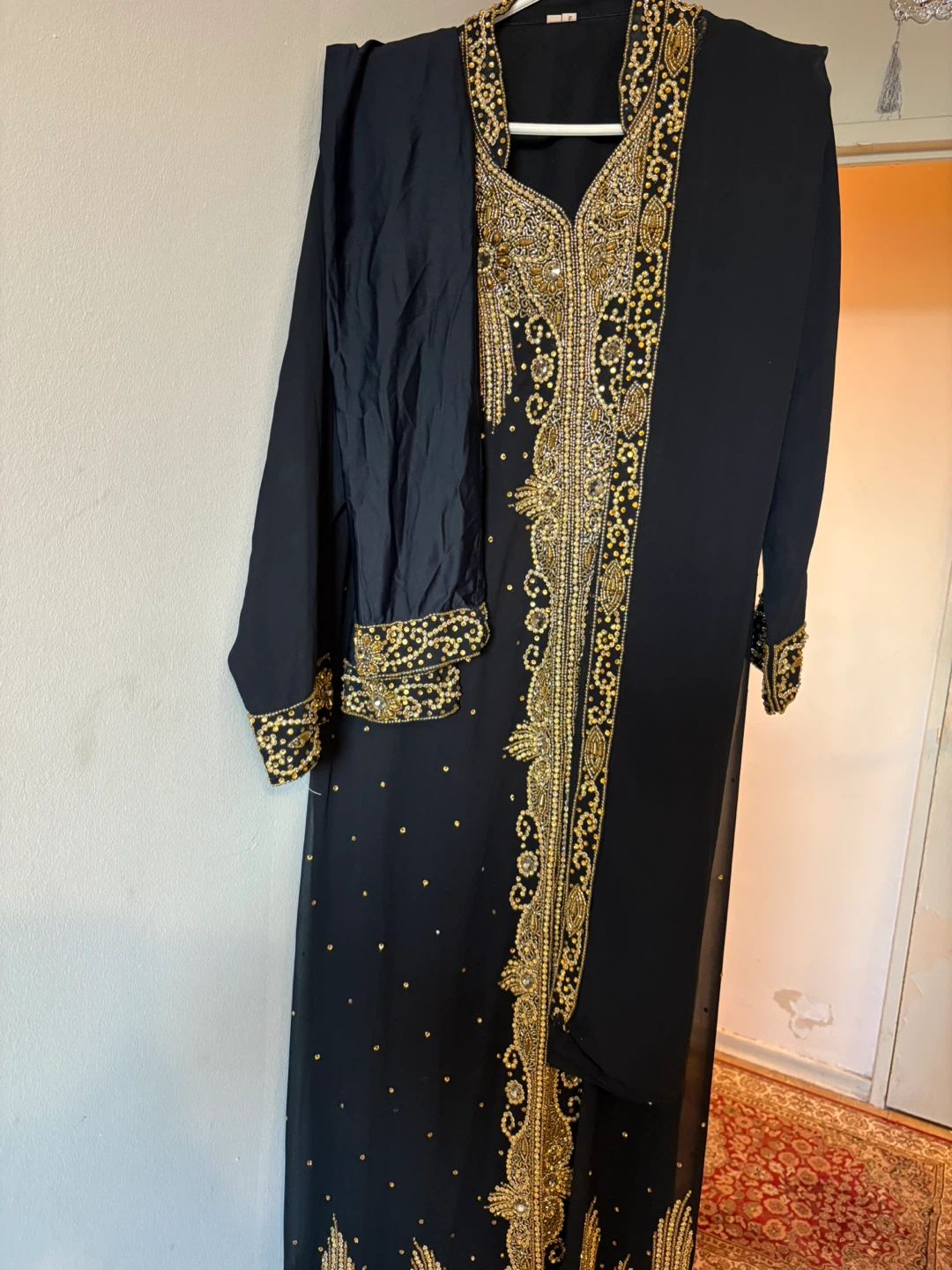 Beautiful black abaya dress with gold embellishments, perfect for special occasions! Includes matching headscarf and sleeves
