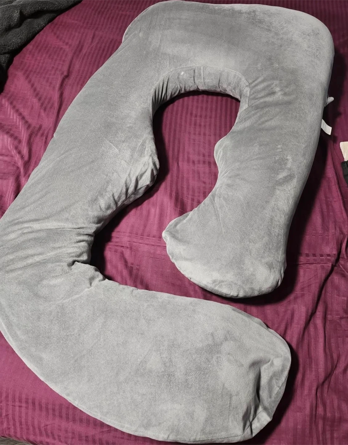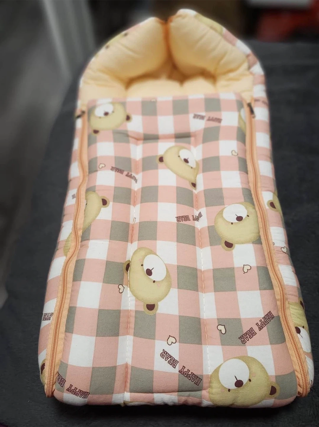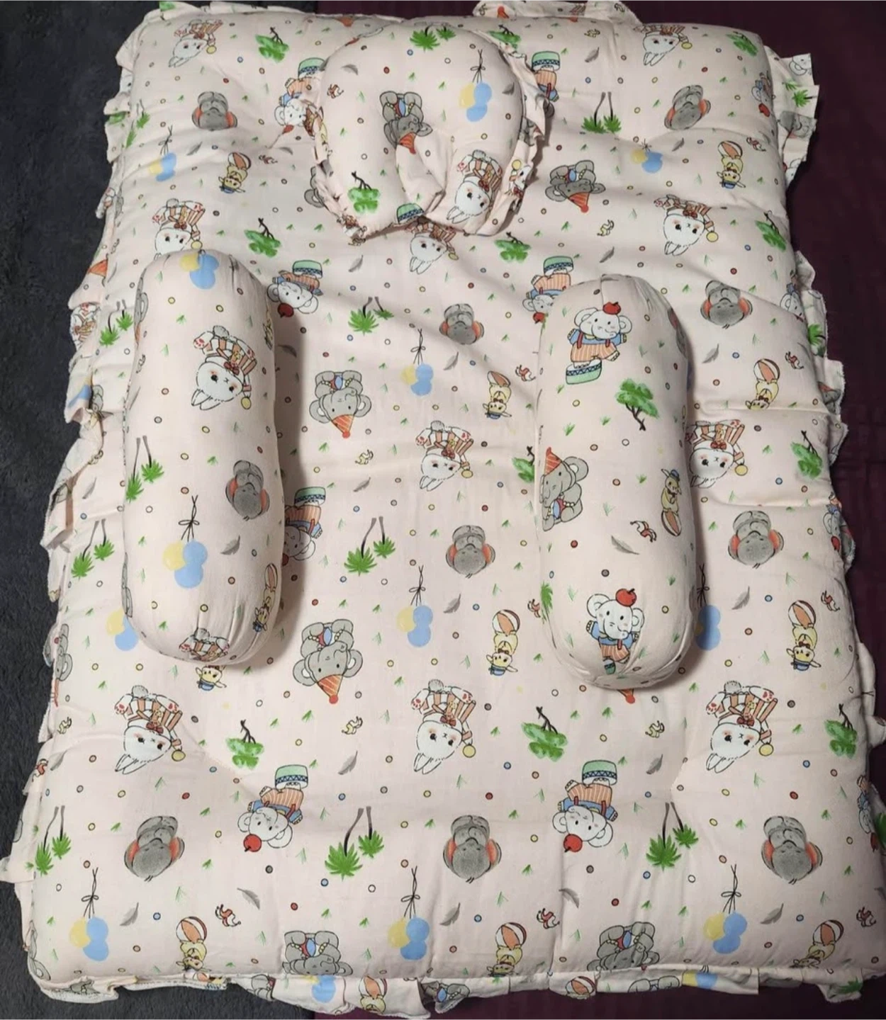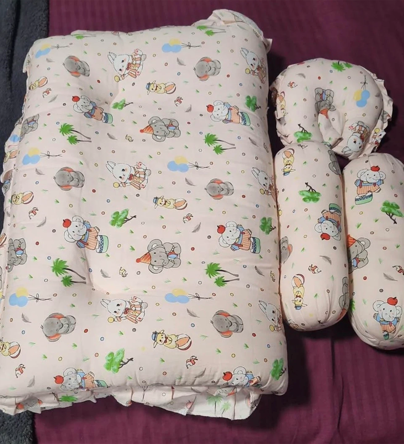 This baby play mat comes with two side pillows and a head pillow, all featuring a cute cartoon design. It's perfect for tummy time or just lounging around. The set also includes a cozy baby sleeping bag with a fun teddy bear pattern. A grey U-shaped pregnancy pillow is also available.