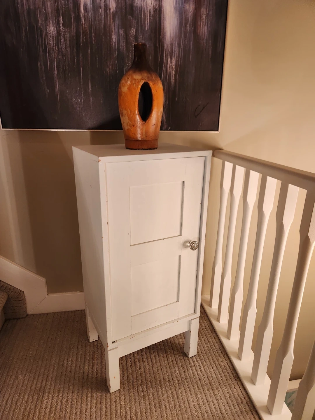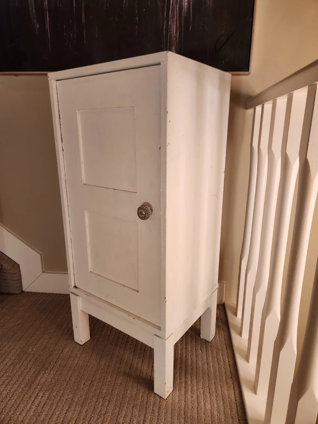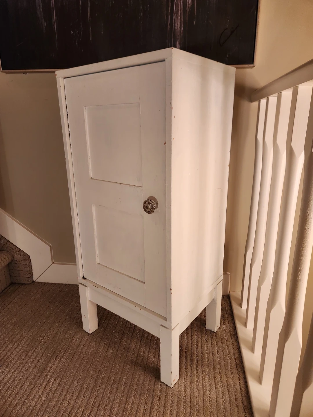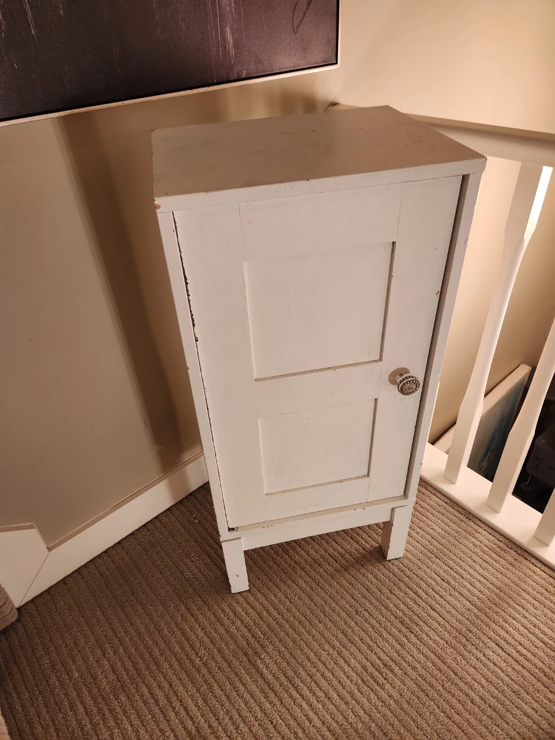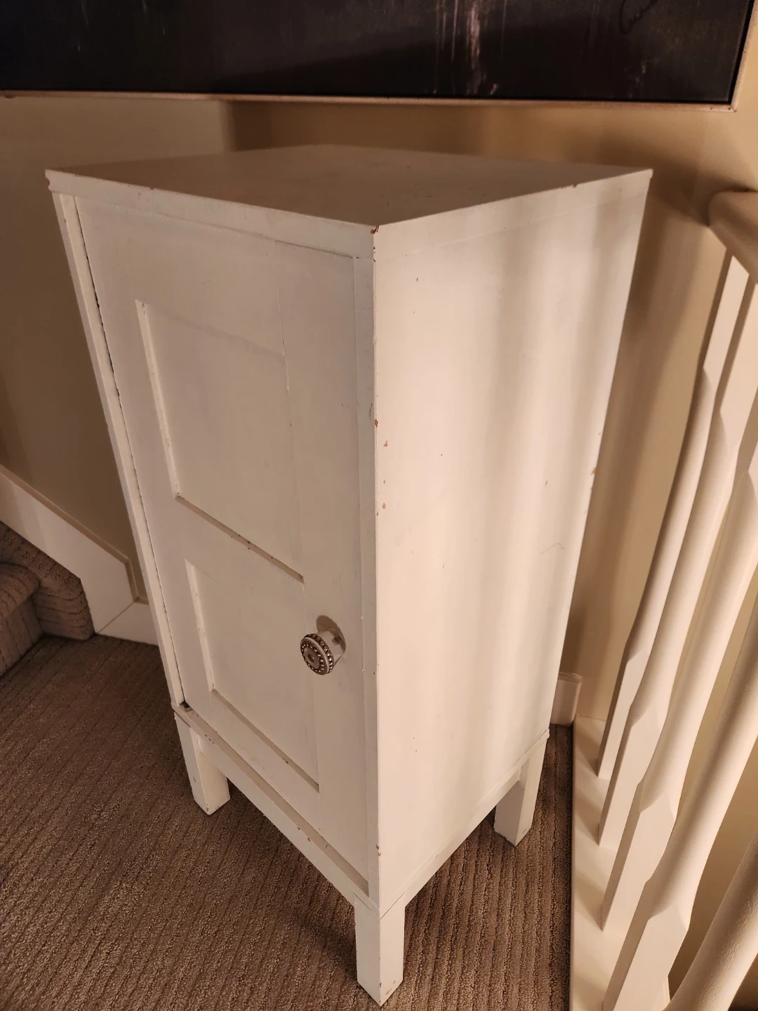 VINTAGE storage cabinet. White painted wood side cabinet. It has a single door and three shelves inside, perfect for extra storage in kitchens, dining rooms or Livingrooms. What a unique night stand.. . There are some signs of wear, but it adds to the vintage charm! Surface measures 14x17 and 38 inches high! Pretty and practical and fantastic french country, cottage or farmhouse decor.