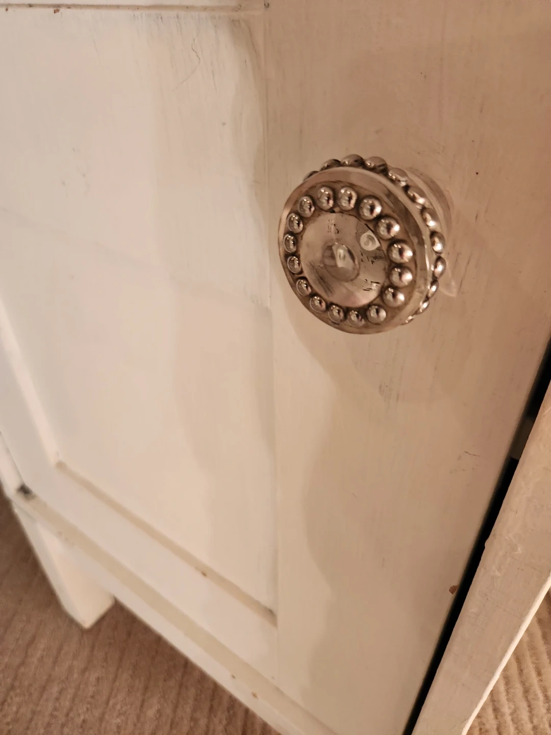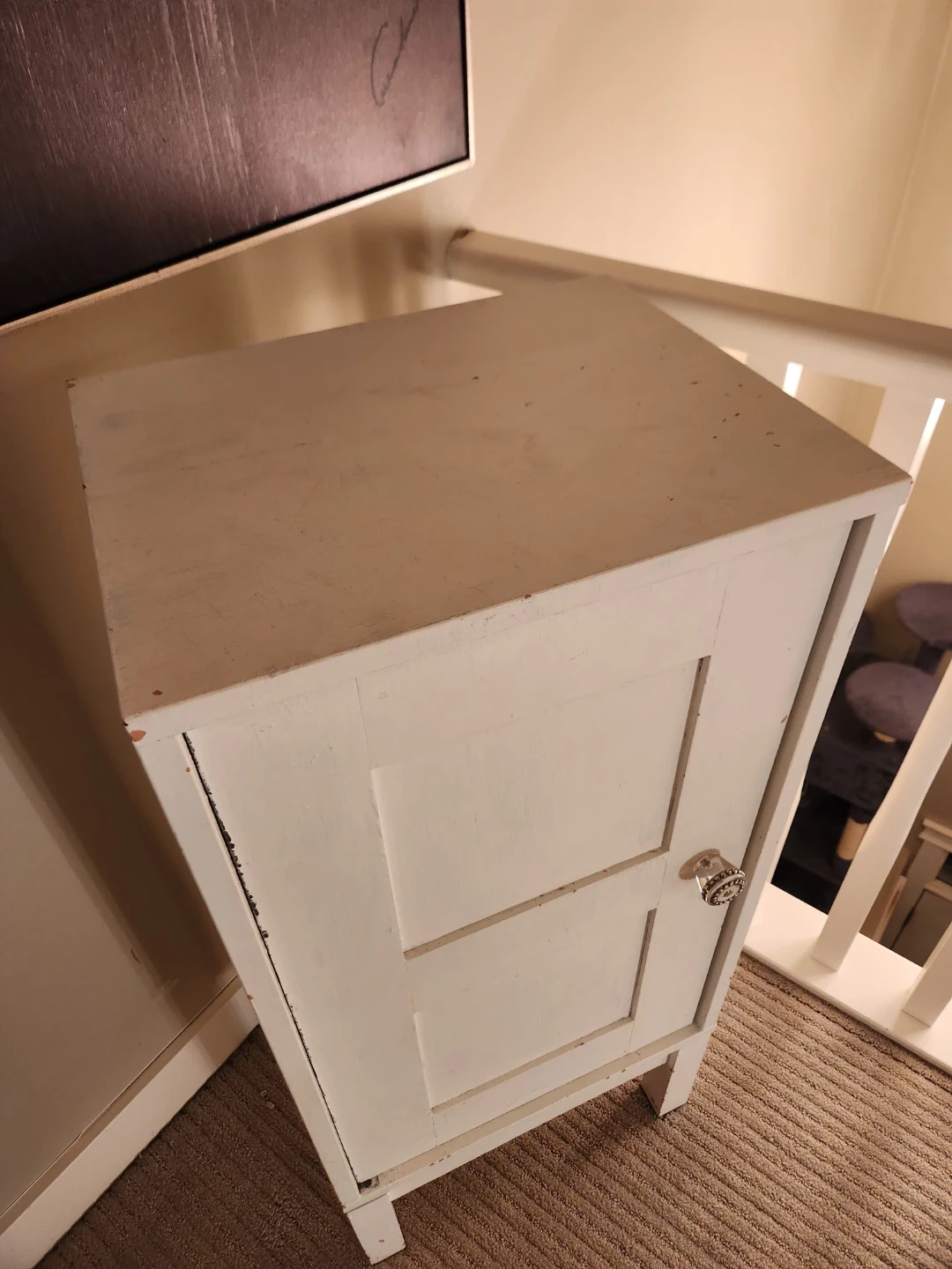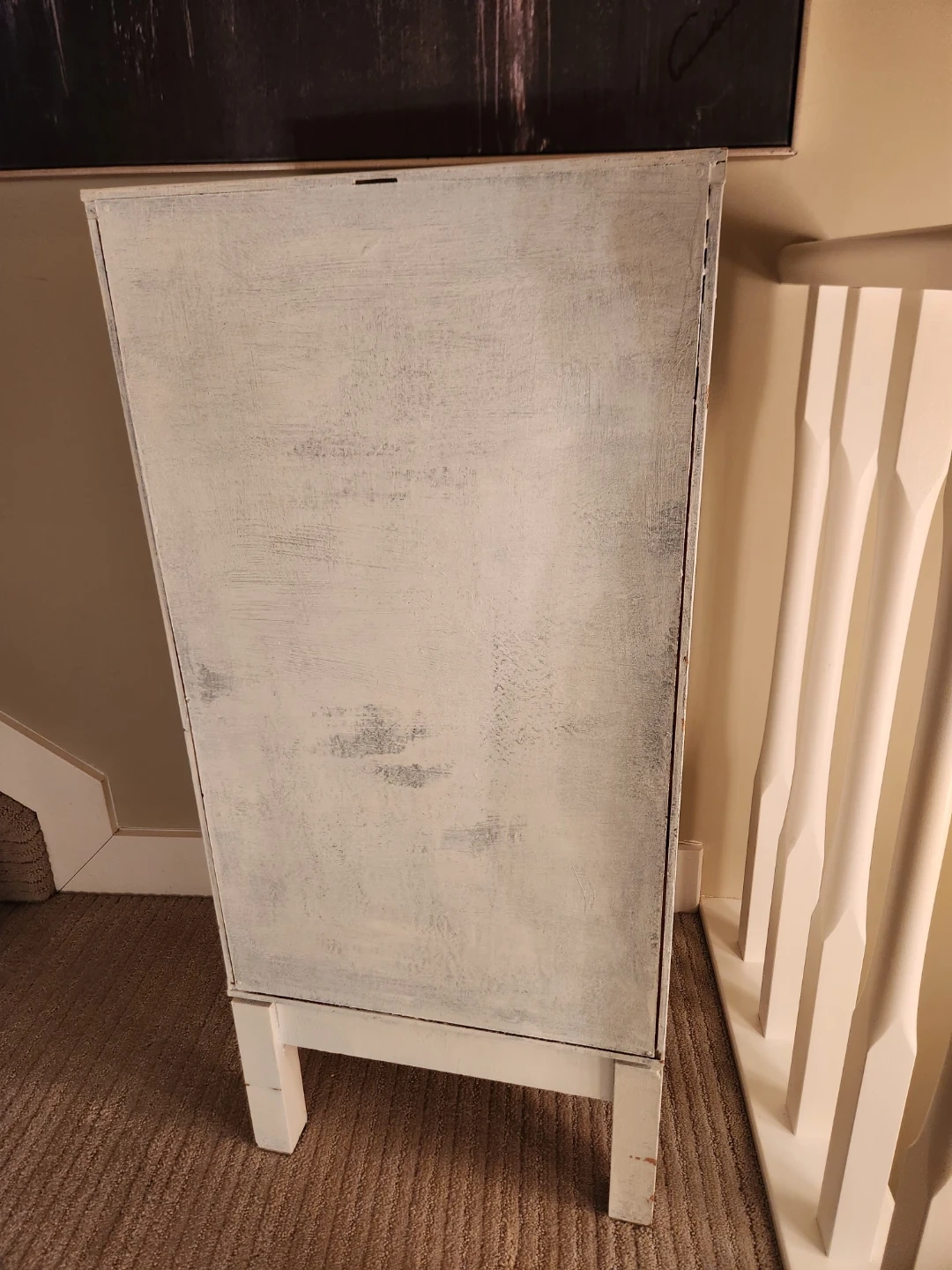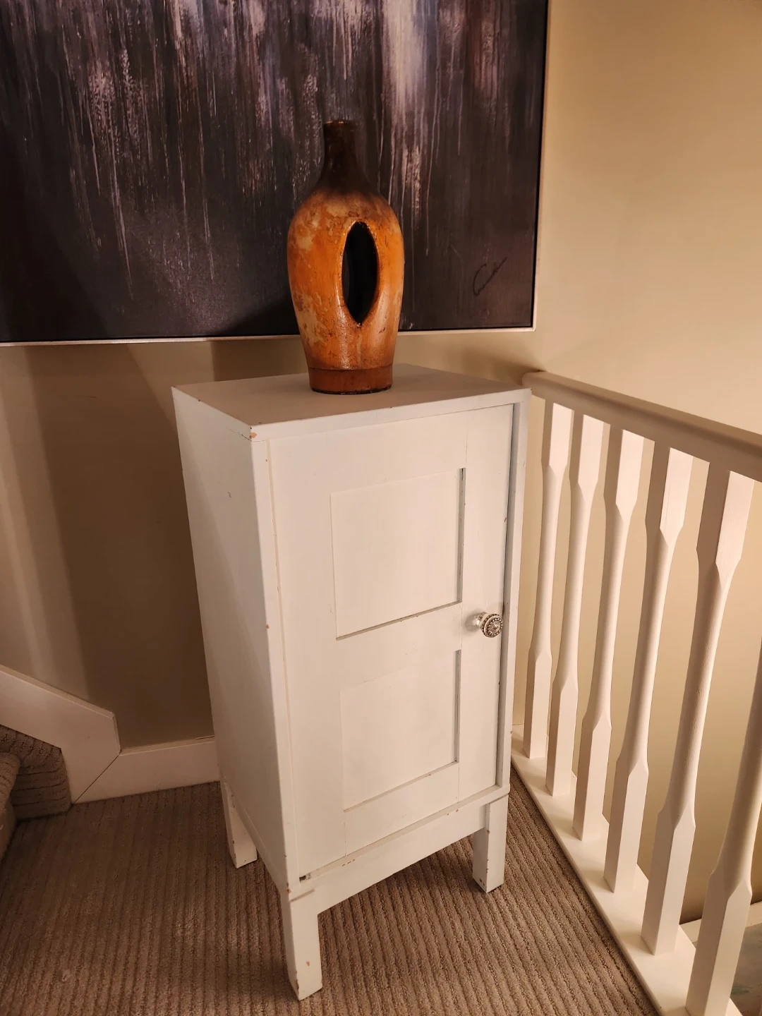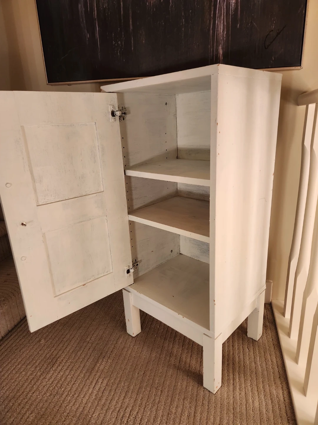 VINTAGE storage cabinet. White painted wood side cabinet. It has a single door and three shelves inside, perfect for extra storage in kitchens, dining rooms or Livingrooms. What a unique night stand.. . There are some signs of wear, but it adds to the vintage charm! Surface measures 14x17 and 38 inches high! Pretty and practical and fantastic french country, cottage or farmhouse decor.
