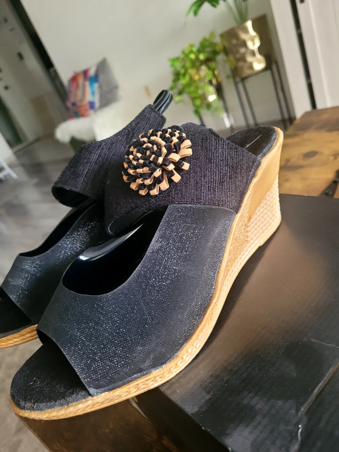Selling a pair of gently used black wedge sandals. They're a size 8 and feature a stylish flower detail. Perfect for adding a bit of flair to your summer outfits!