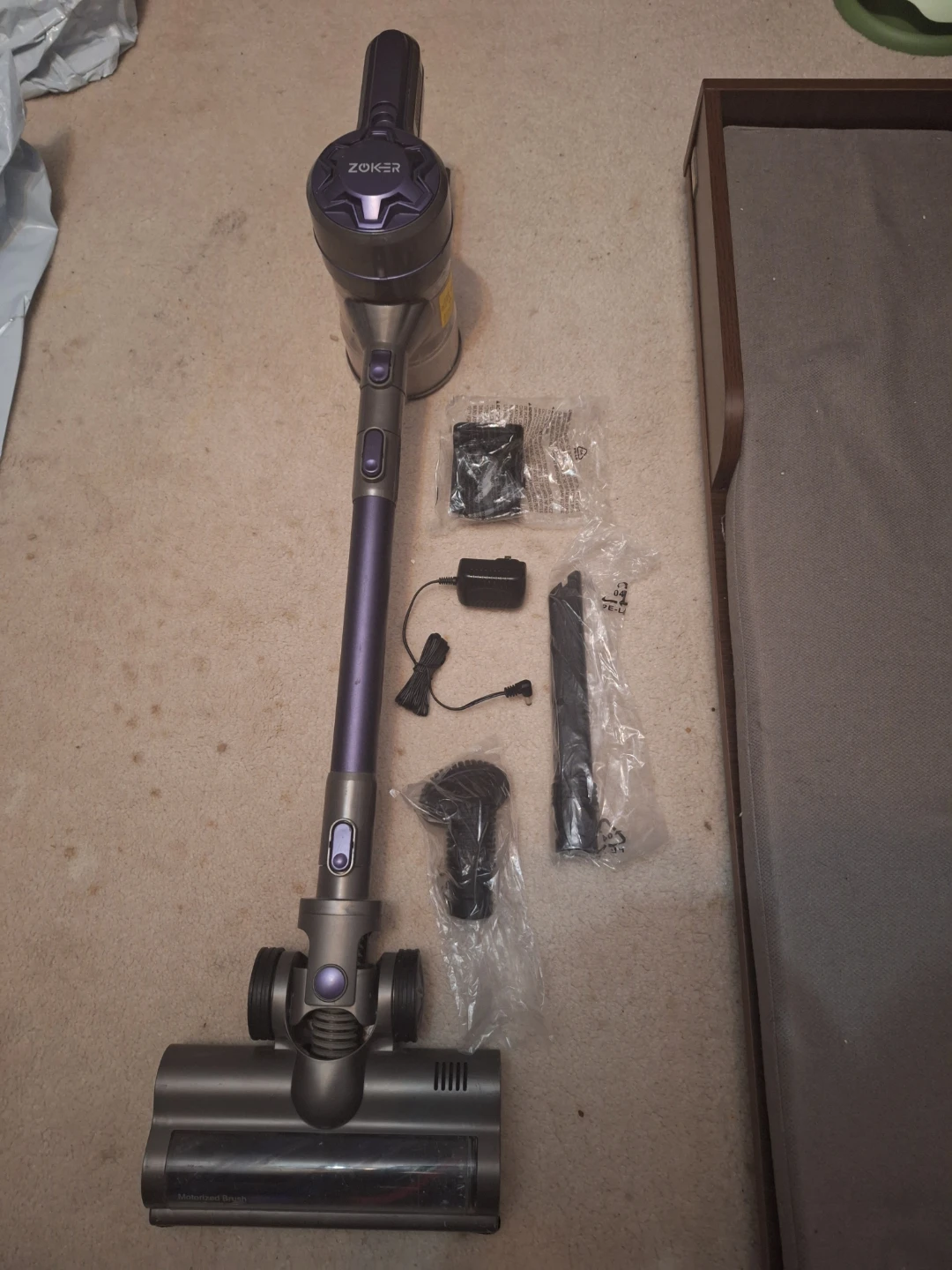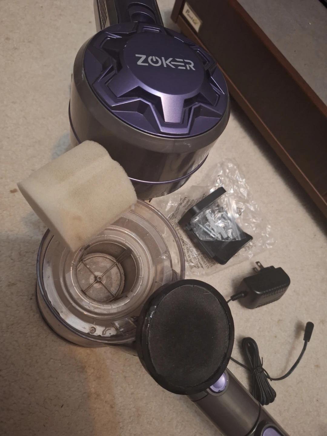 Selling a Zoker cordless stick vacuum in purple! It comes with all the attachments, including the charger and hanger (with new screws and anchors). Pretty lightly used. I got a new pet vacuum on a really good deal. Battery still lasts decently long (about 30 minutes) and has a more powerful suction option. Great for quick cleanups around the house