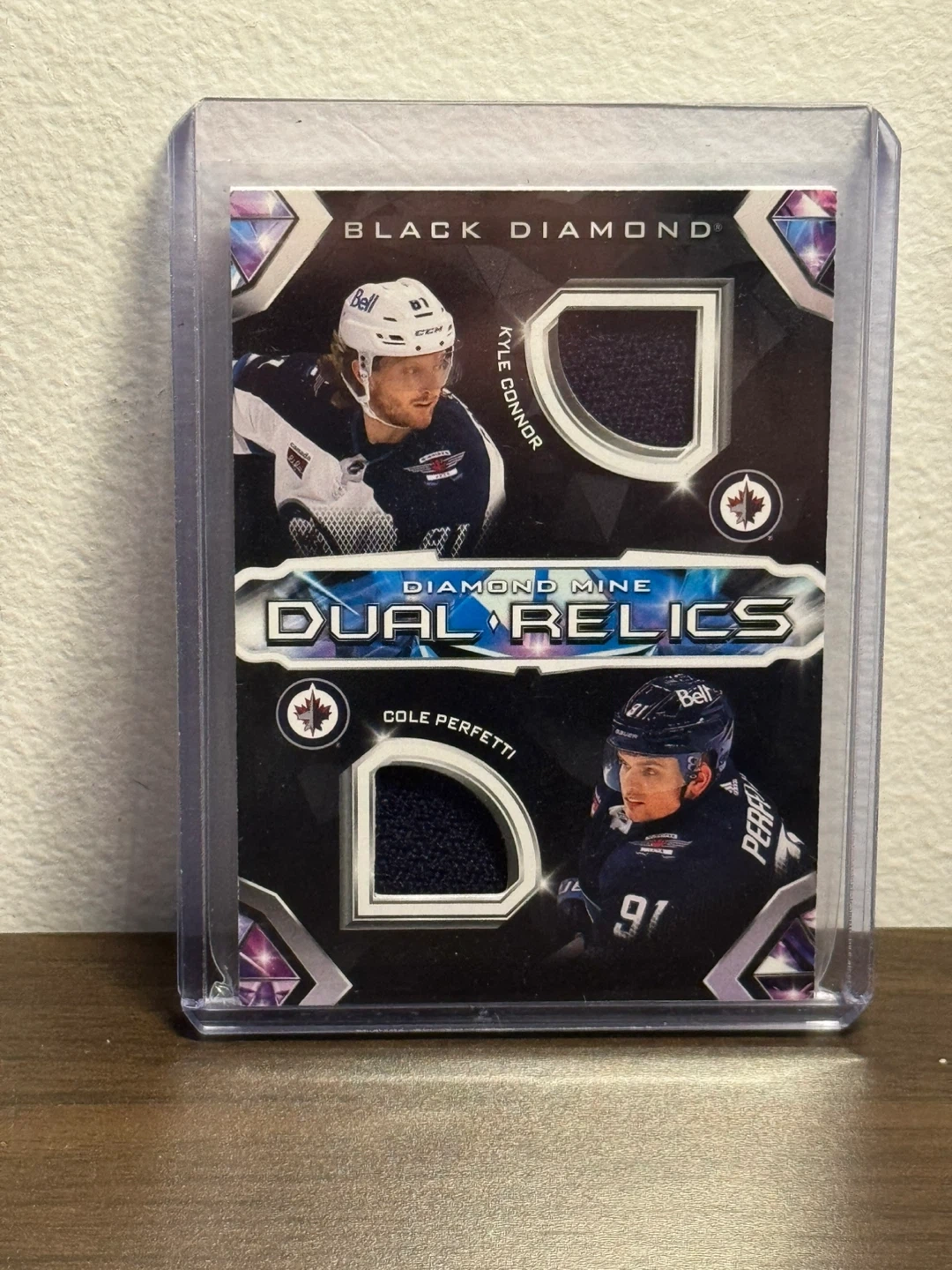 Selling a 2023-24 Black Diamond Hockey Dual Relics card featuring Kyle Connor and Cole Perfetti. This card has been certified to Upper Deck Company as having been used in an official NHL game. Enjoy your memorabilia card!