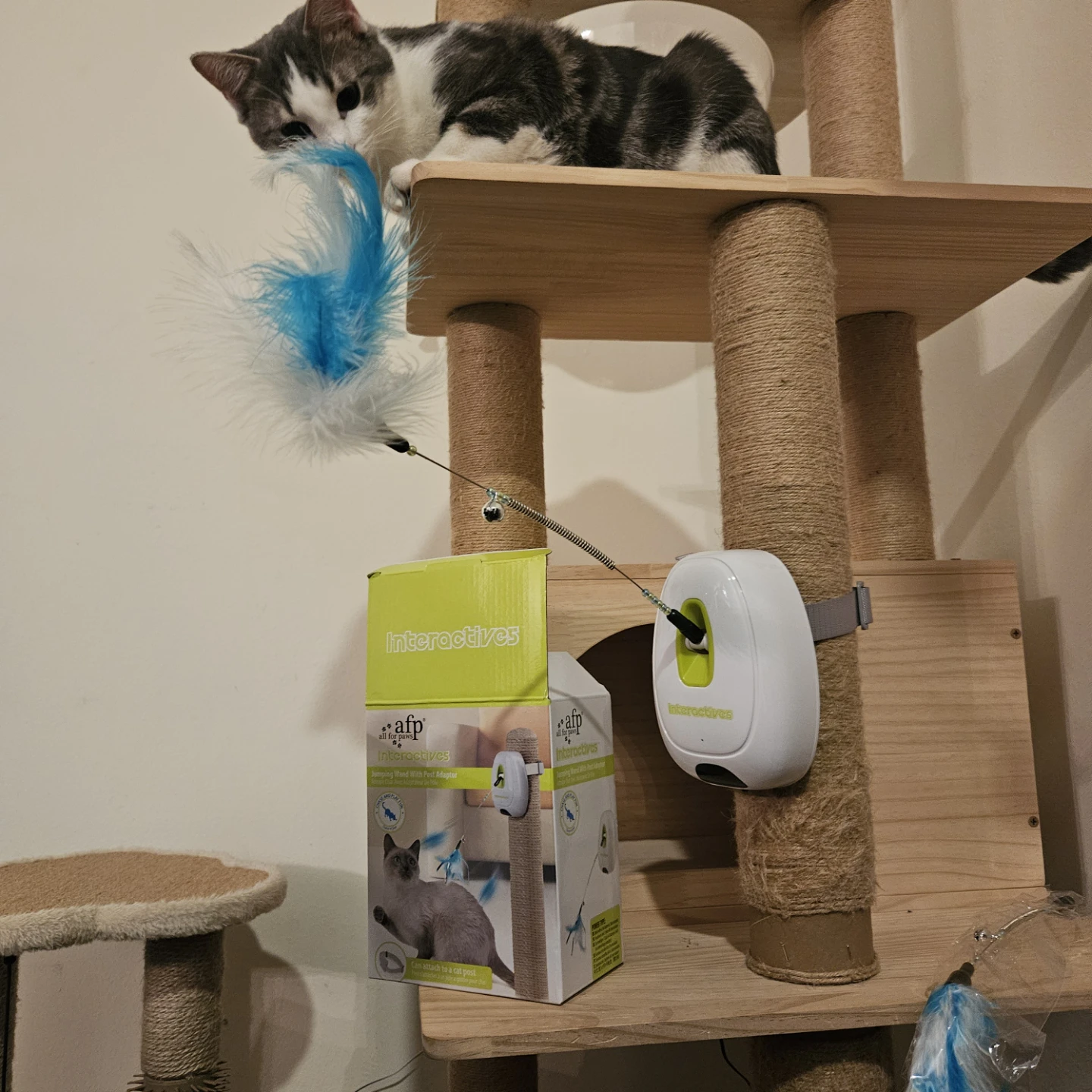 Keep your kitty entertained with the AFP Interactives Jumping Wand! This interactive toy can be attached to a cat post, providing hours of fun and exercise for your feline friend automatically.