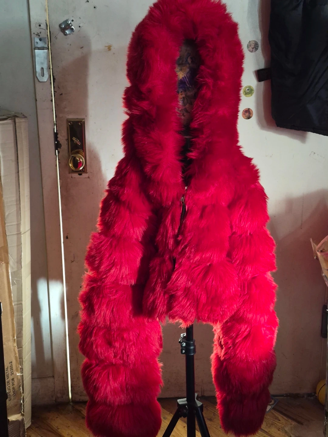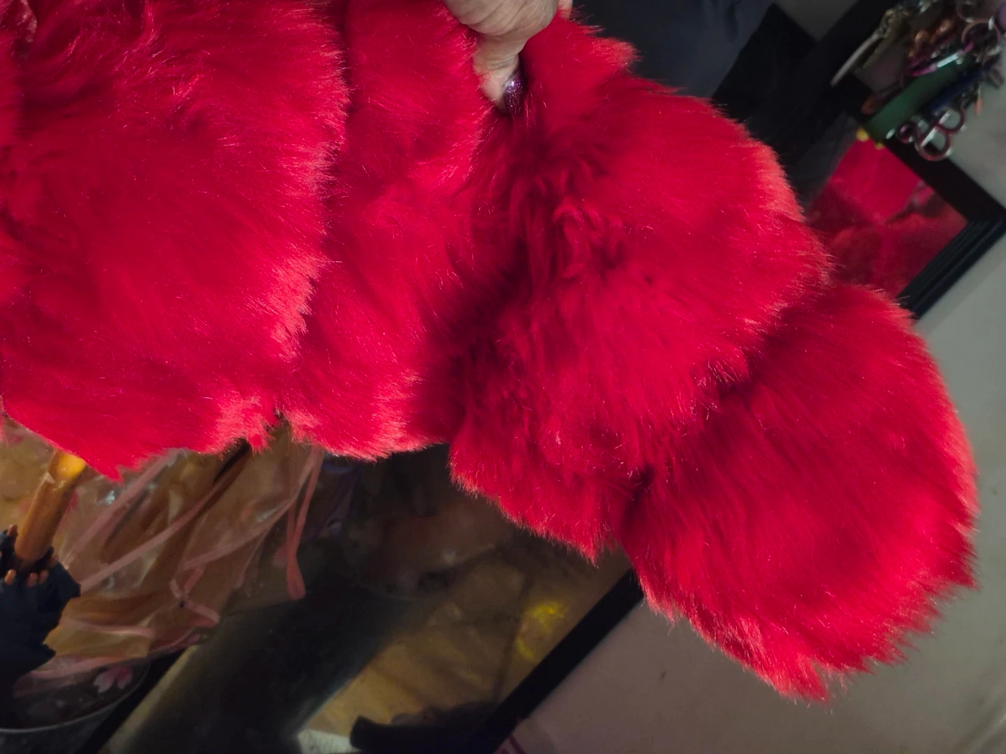Selling a red faux fur coat. It's in excellent condition and ready for a new owner! The material is soft and fluffy,feels real perfect for keeping super warm and stylish. P.S if you're heavy busted it fits like a medium. I wear large had to buy Xl to fit properly.