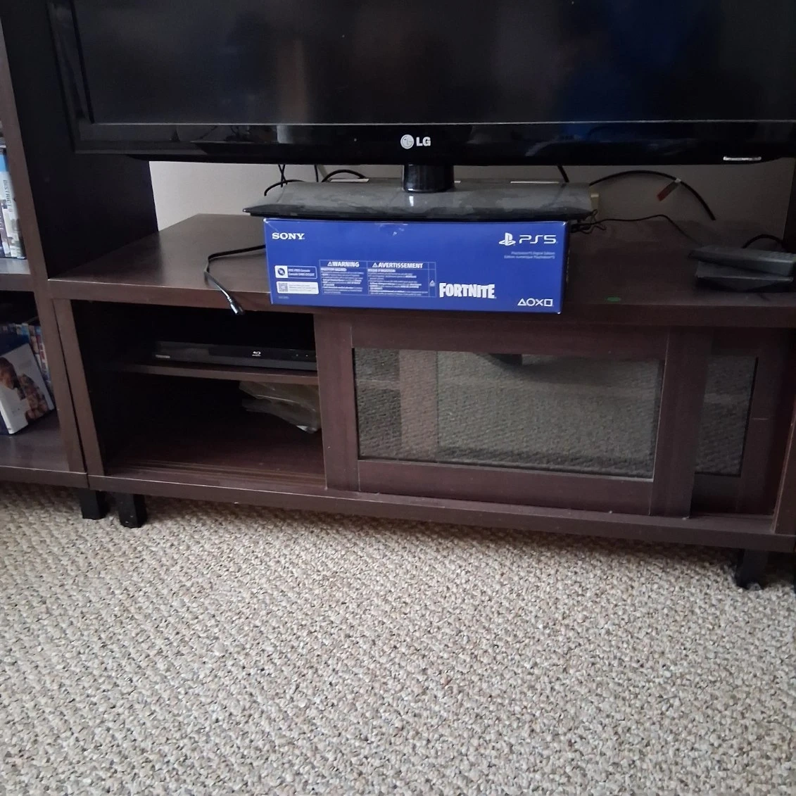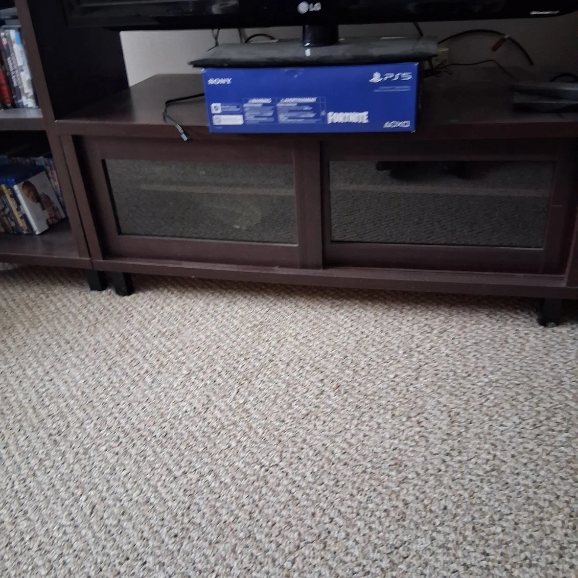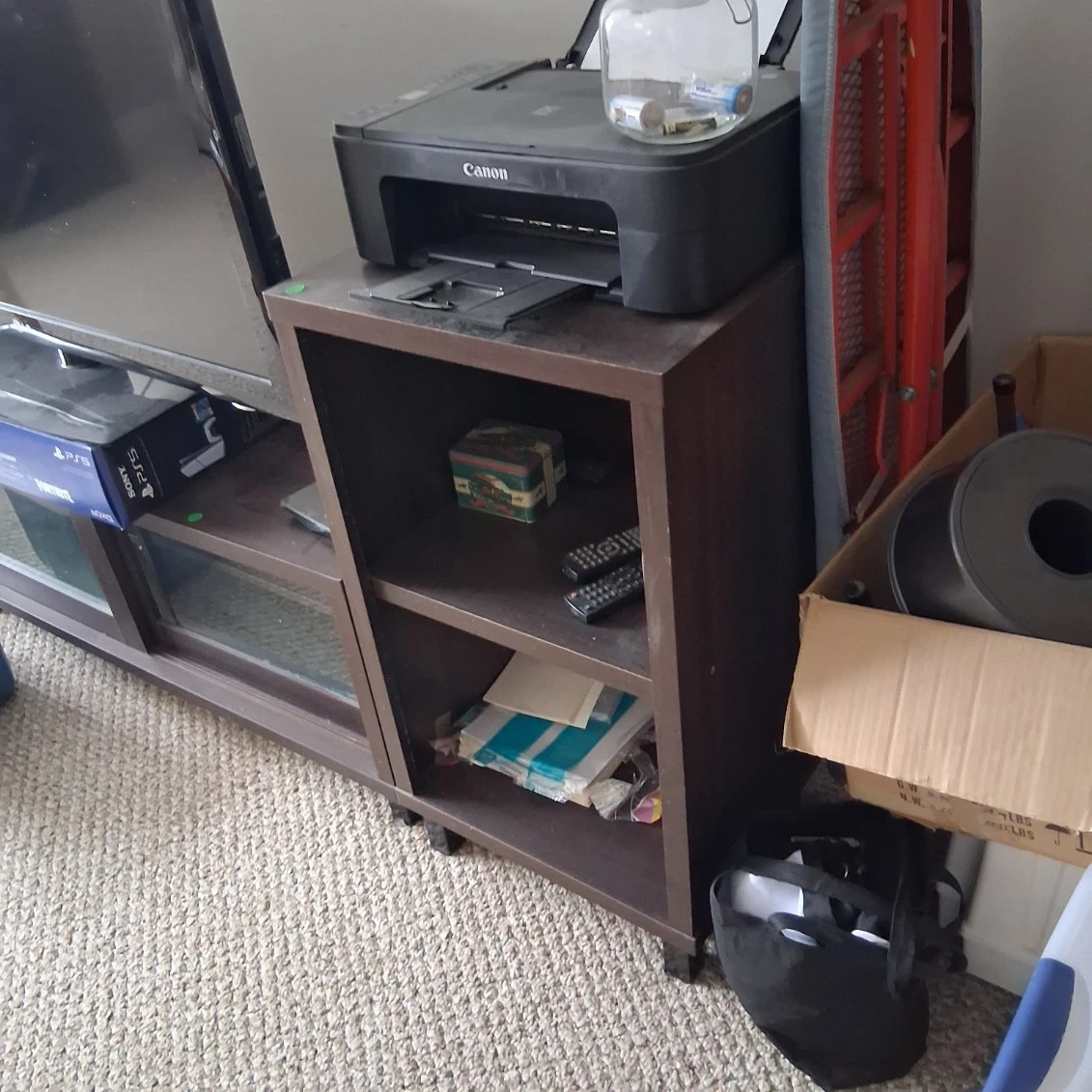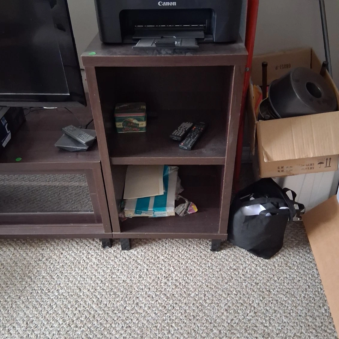 Brown TV stand with shelves